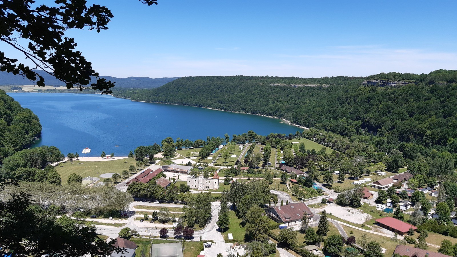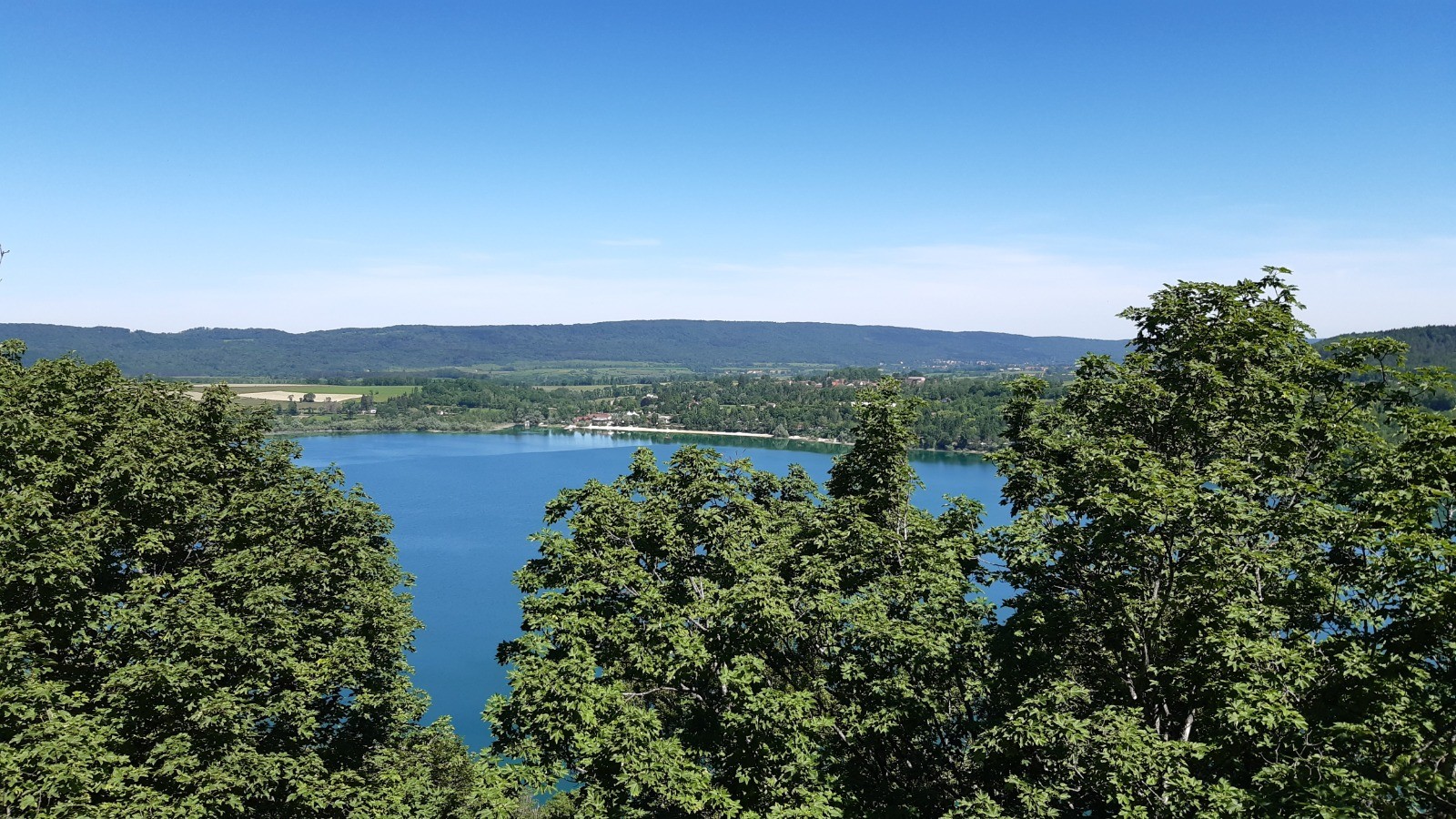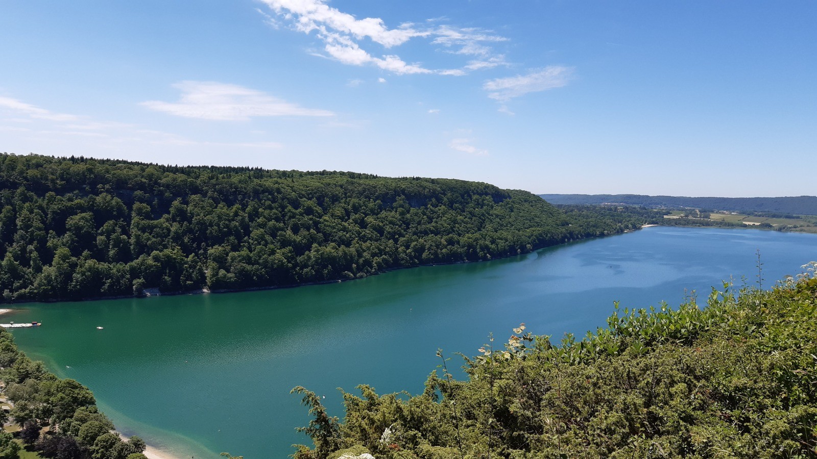 Le lac Chalain vu depuis sa rive et depuis les hauteurs.
