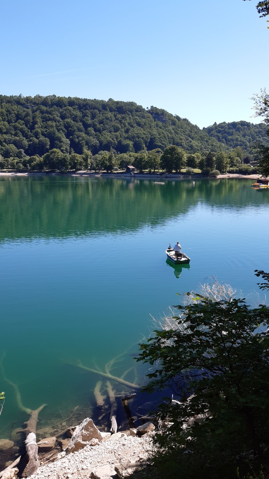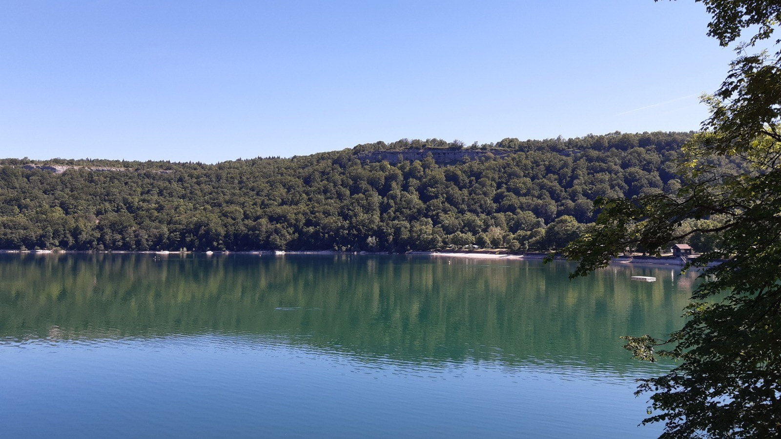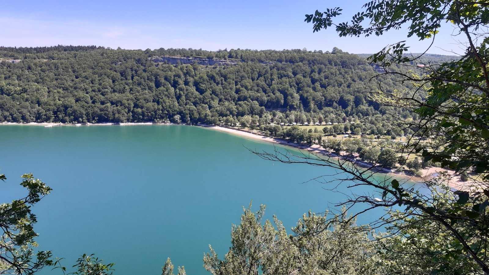 Le lac Chalain vu depuis sa rive et depuis les hauteurs.
