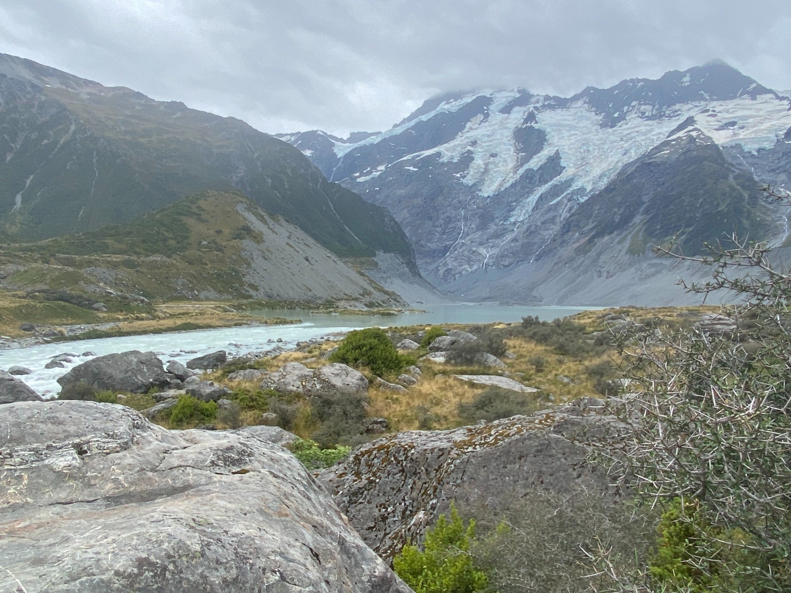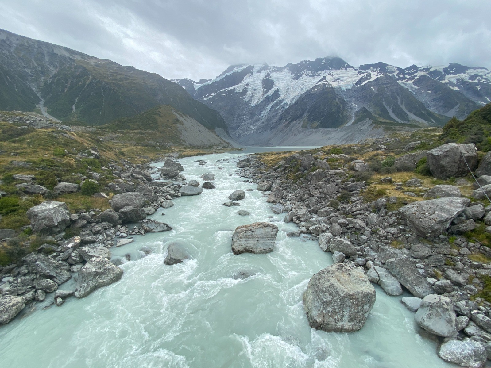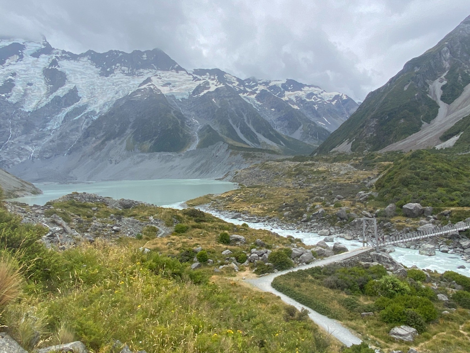 Nous traversons le pont suspendu puis nous découvrons le lac Mueller et ses icebergs.