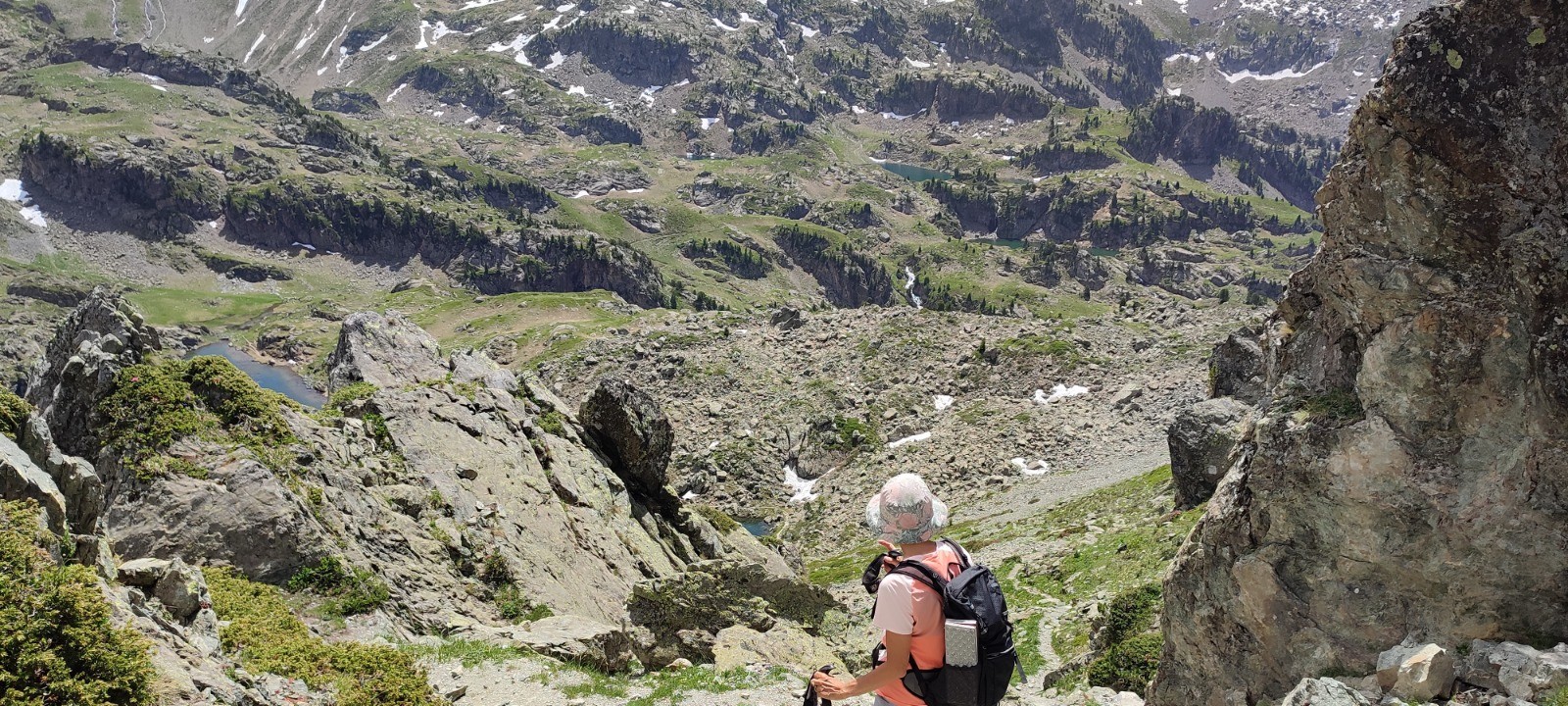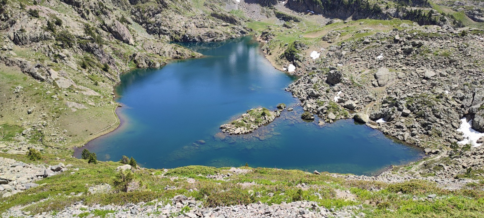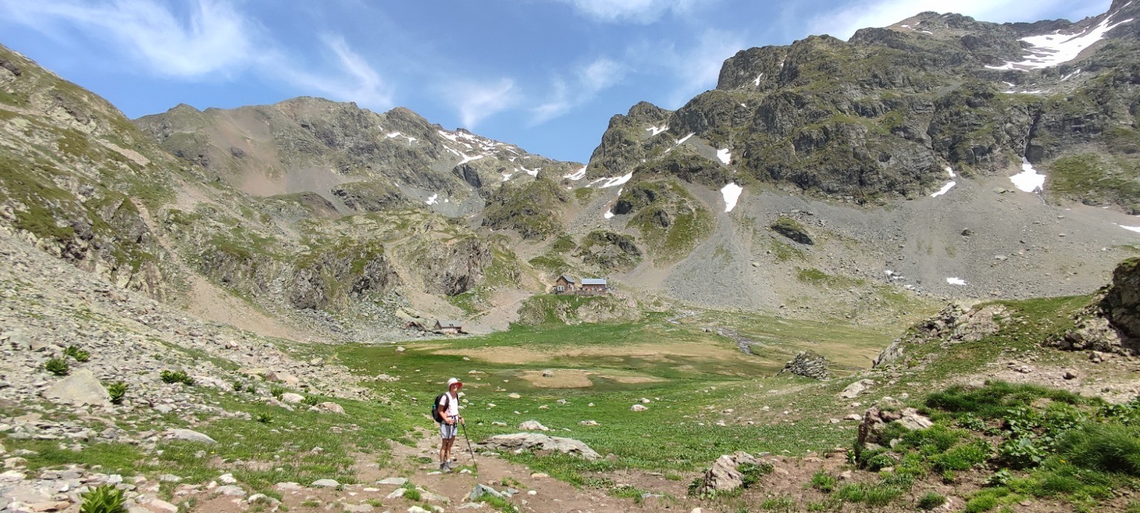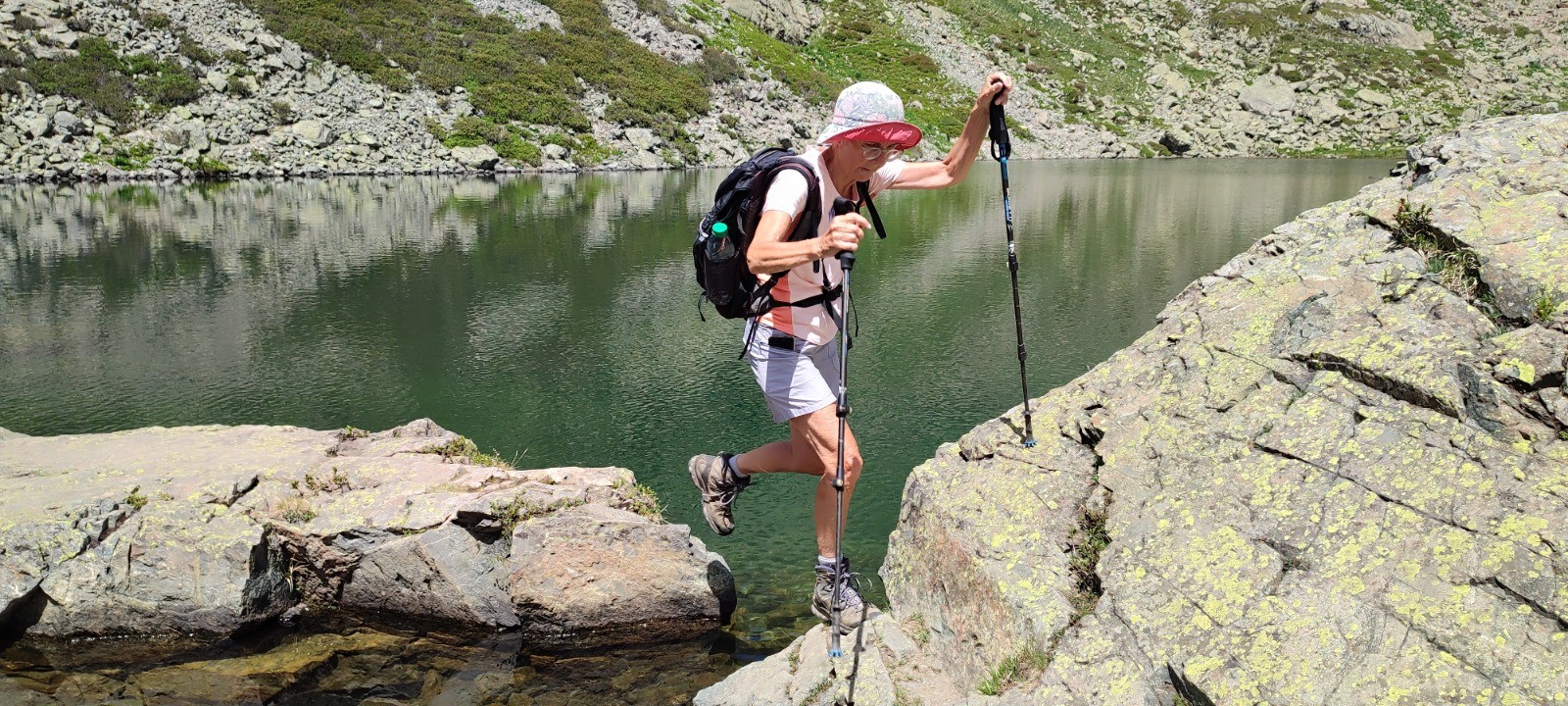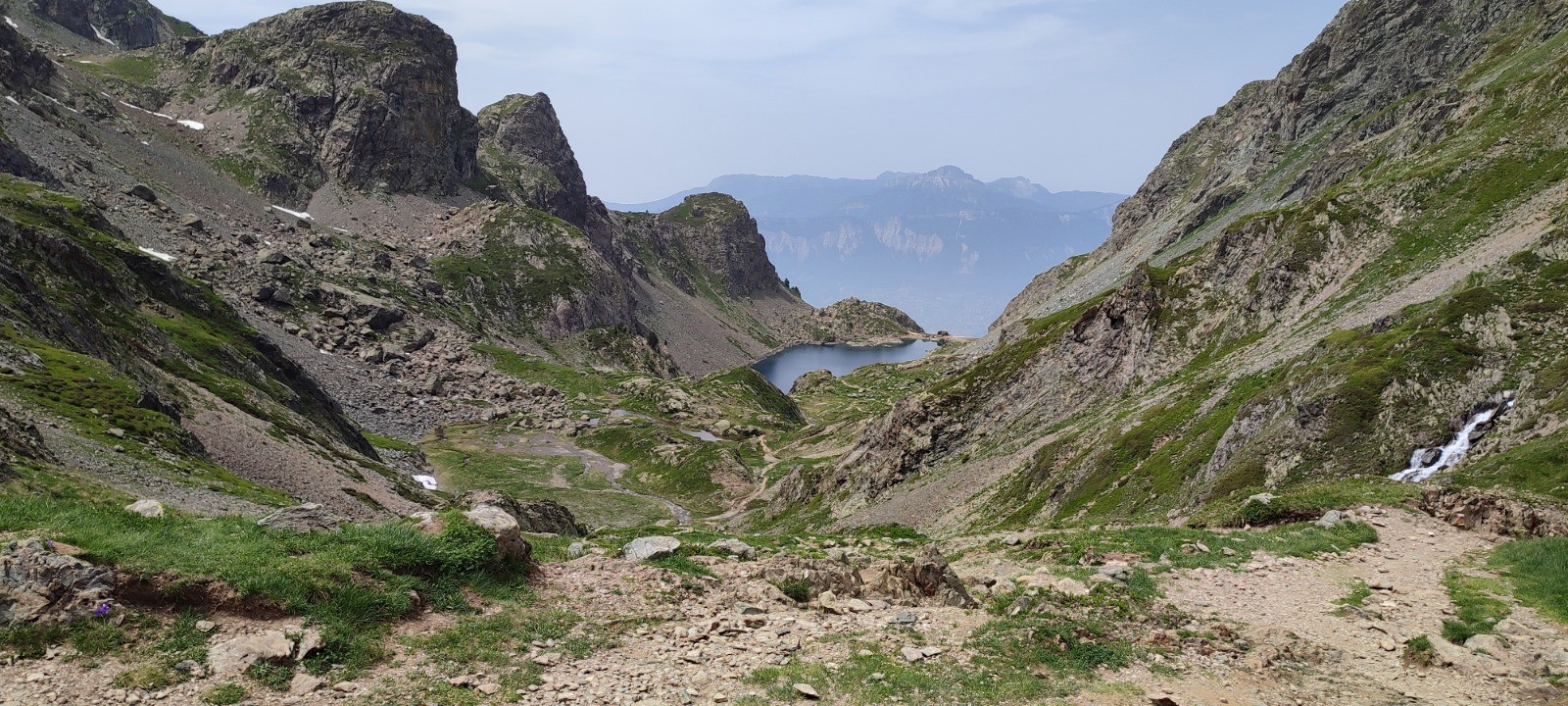 Pic nic - baignade au lac Merlat. Trois jeunes nous doublent et, nous le saurons plus tard quittent le sentier pour faire un tour par les lac Bernard, Longet et Claret.