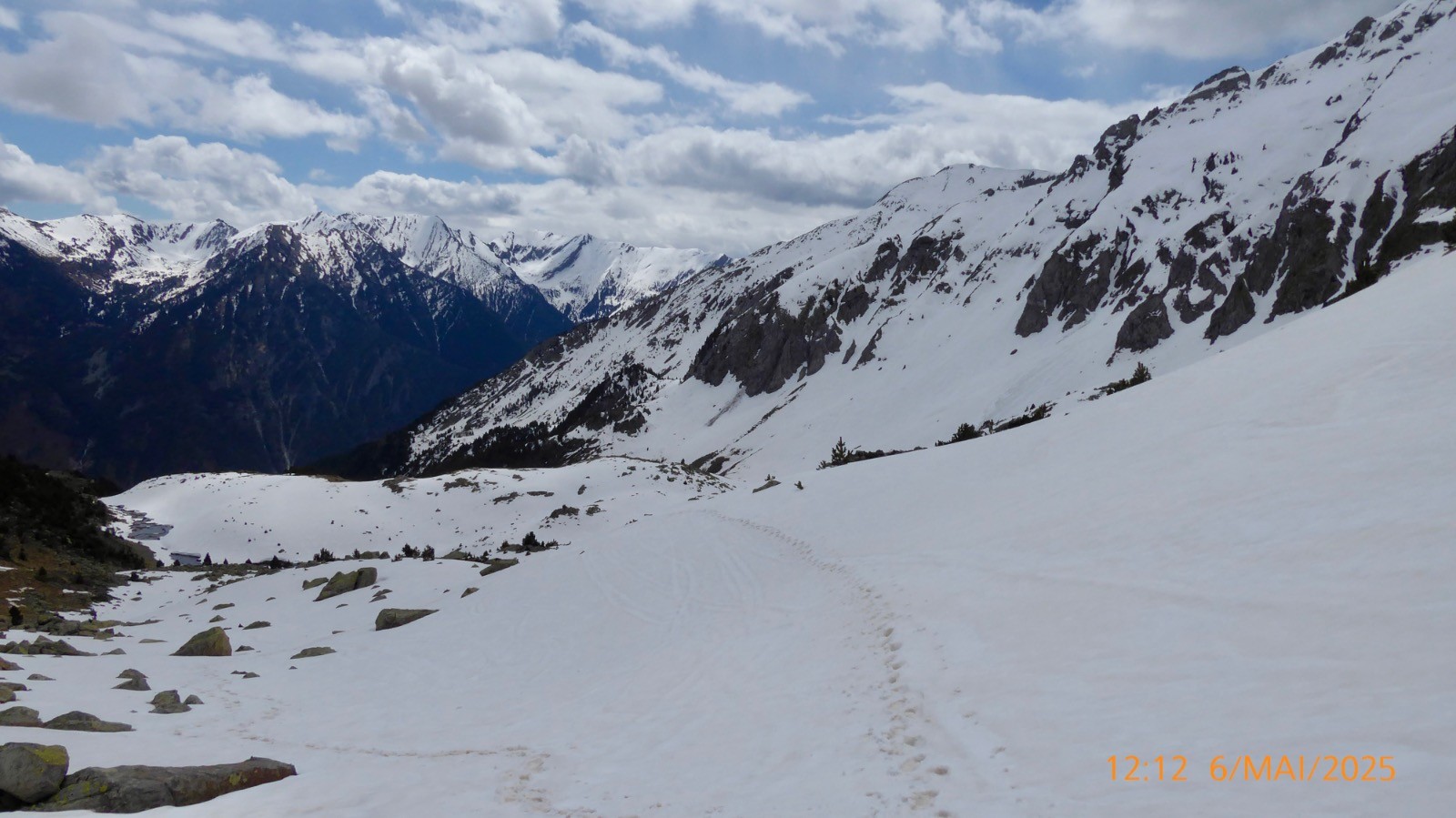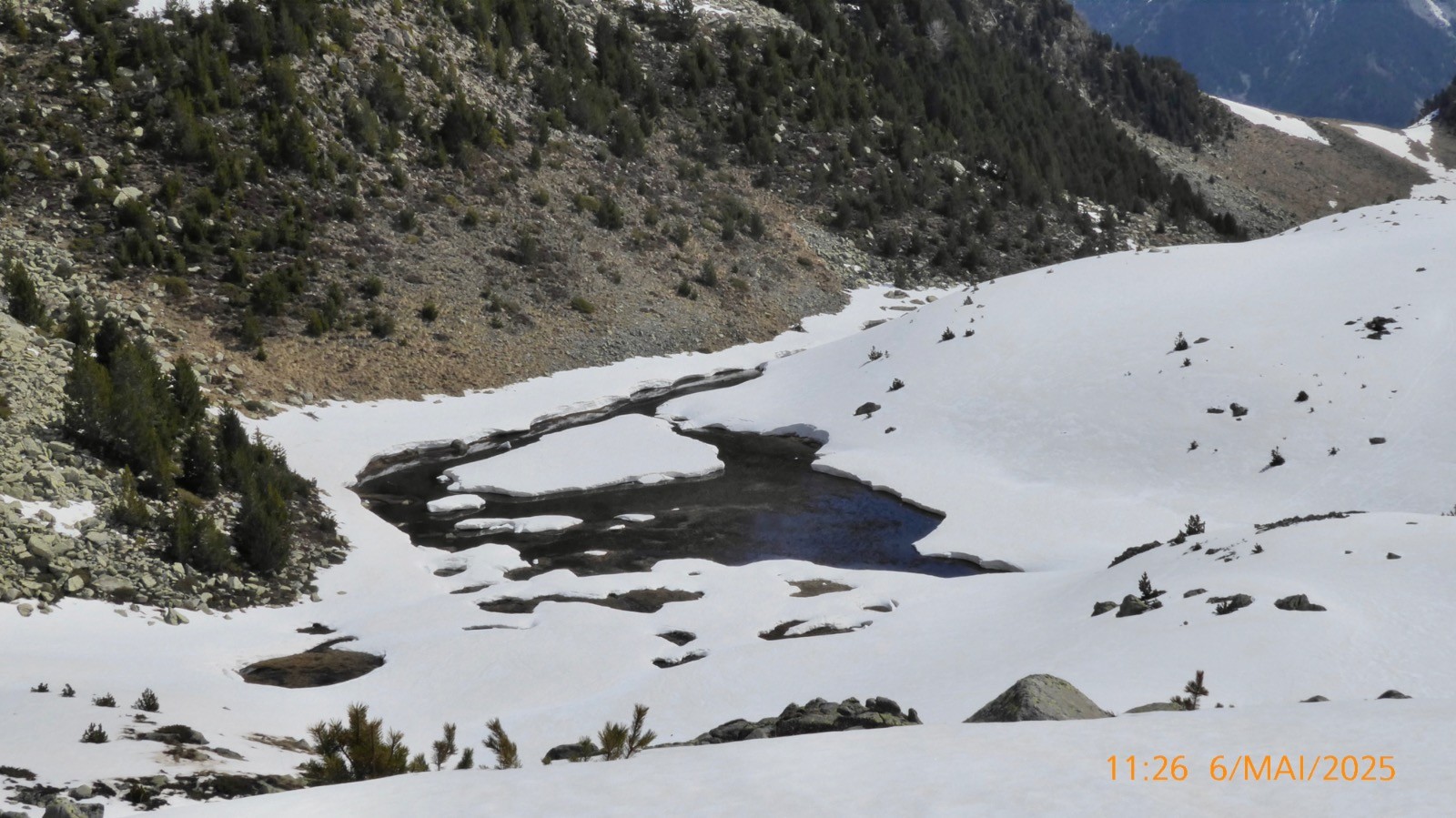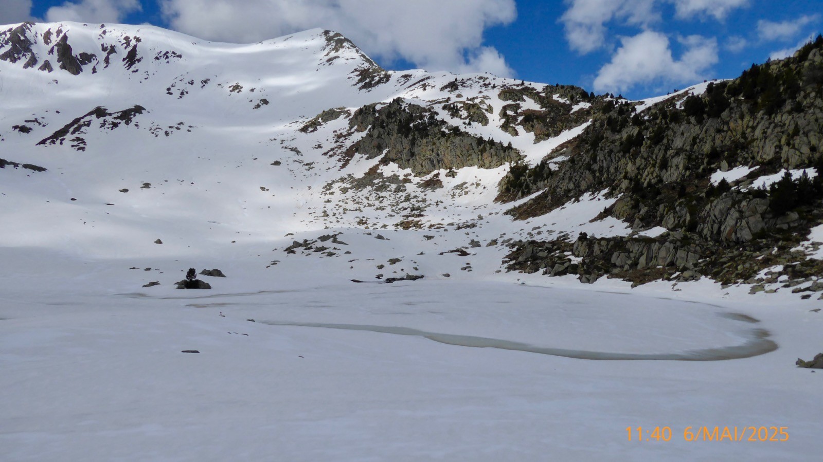 La météo nous a été favorable ce jour . Notre boucle prévue n'a pas pu se faire comme prévu. Les conditions d'enneigement ne le permettaient pas . Le passage depuis la "colladeta" vers le second petit col (pc 2276) était trop exposé et plusieurs secteurs observés pendant la montée, étaient purgés par de nombreux des départs spontanés....Nous ne ferons donc pas la boucle aujourd'hui. Ce lac de Riueño est situé à 2220 m et il a une superficie de1.3 ha, on ne connait pas sa profondeur. La montée se fait sur un sentier bien marqué.La neige est présente en grande quantité mais porte bien . Cependant la traversé au dessus de l'Estany Fe nous a fait renoncer .