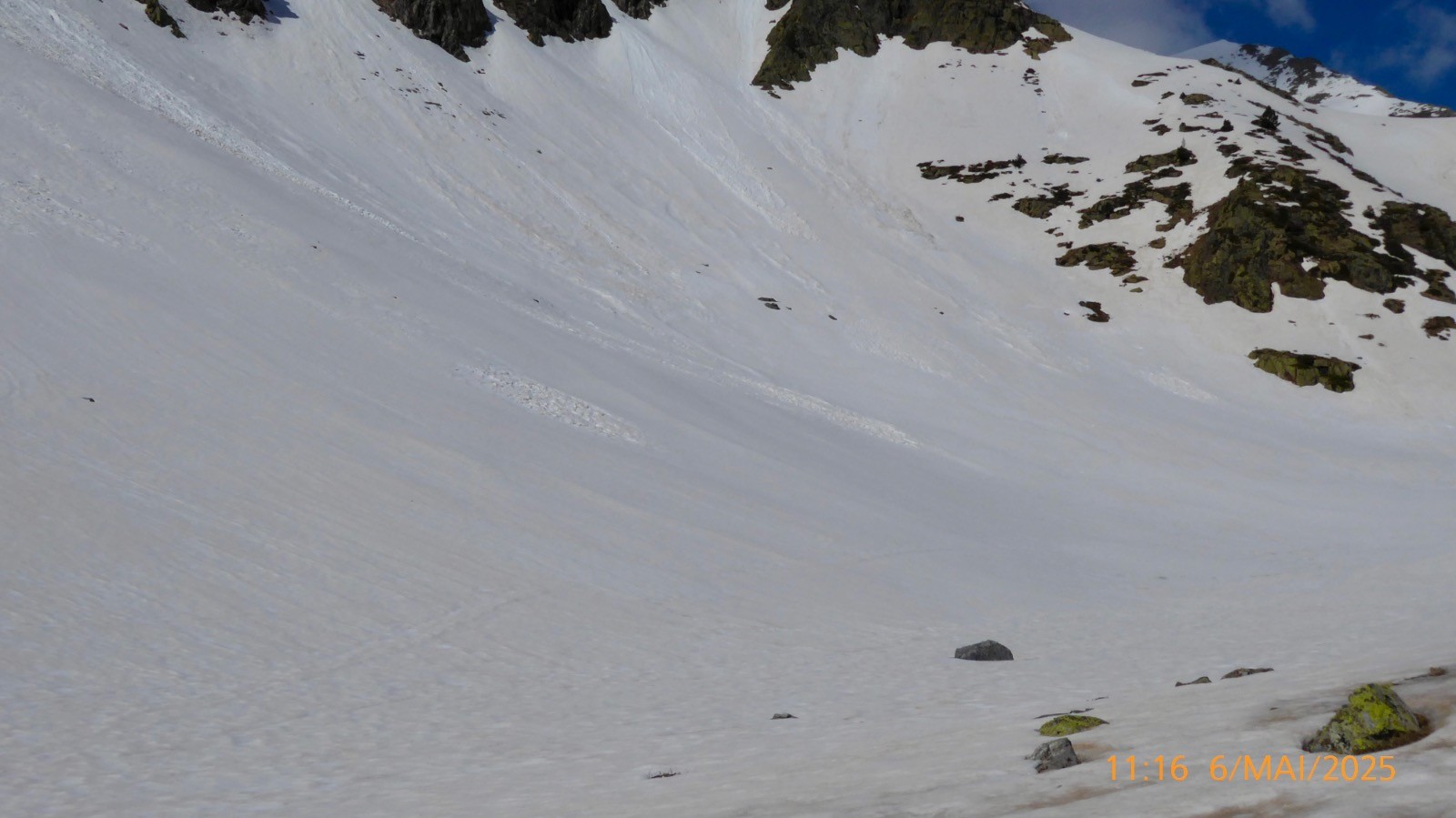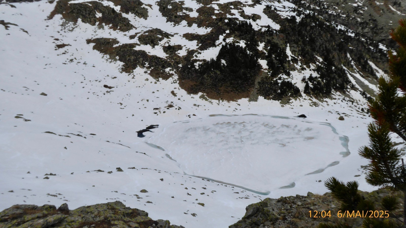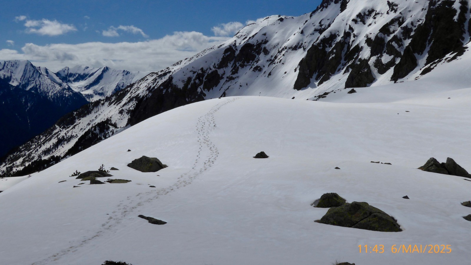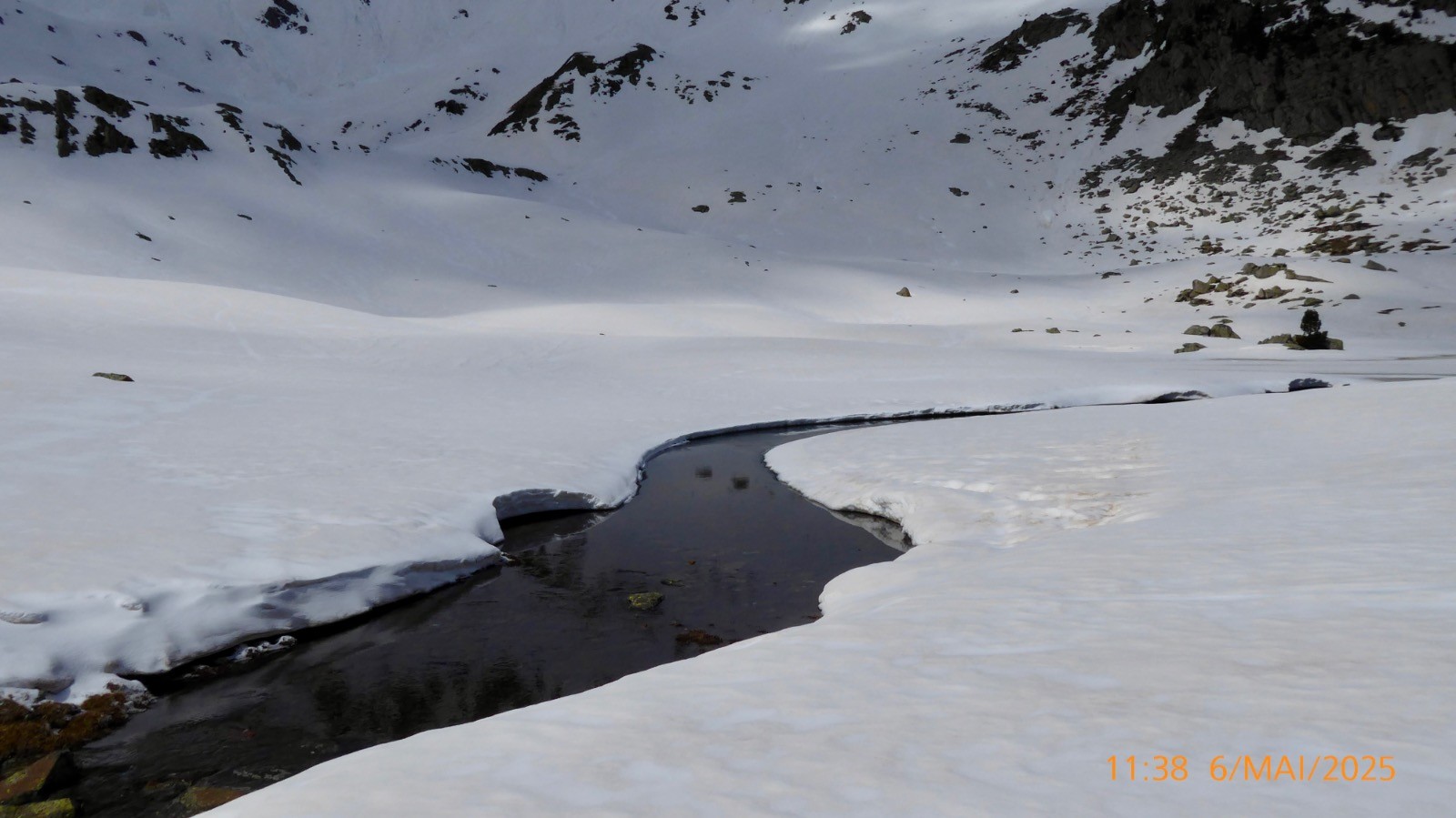 La météo nous a été favorable ce jour . Notre boucle prévue n'a pas pu se faire comme prévu. Les conditions d'enneigement ne le permettaient pas . Le passage depuis la "colladeta" vers le second petit col (pc 2276) était trop exposé et plusieurs secteurs observés pendant la montée, étaient purgés par de nombreux des départs spontanés....Nous ne ferons donc pas la boucle aujourd'hui. Ce lac de Riueño est situé à 2220 m et il a une superficie de1.3 ha, on ne connait pas sa profondeur. La montée se fait sur un sentier bien marqué.La neige est présente en grande quantité mais porte bien . Cependant la traversé au dessus de l'Estany Fe nous a fait renoncer .