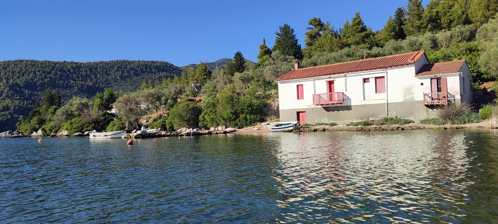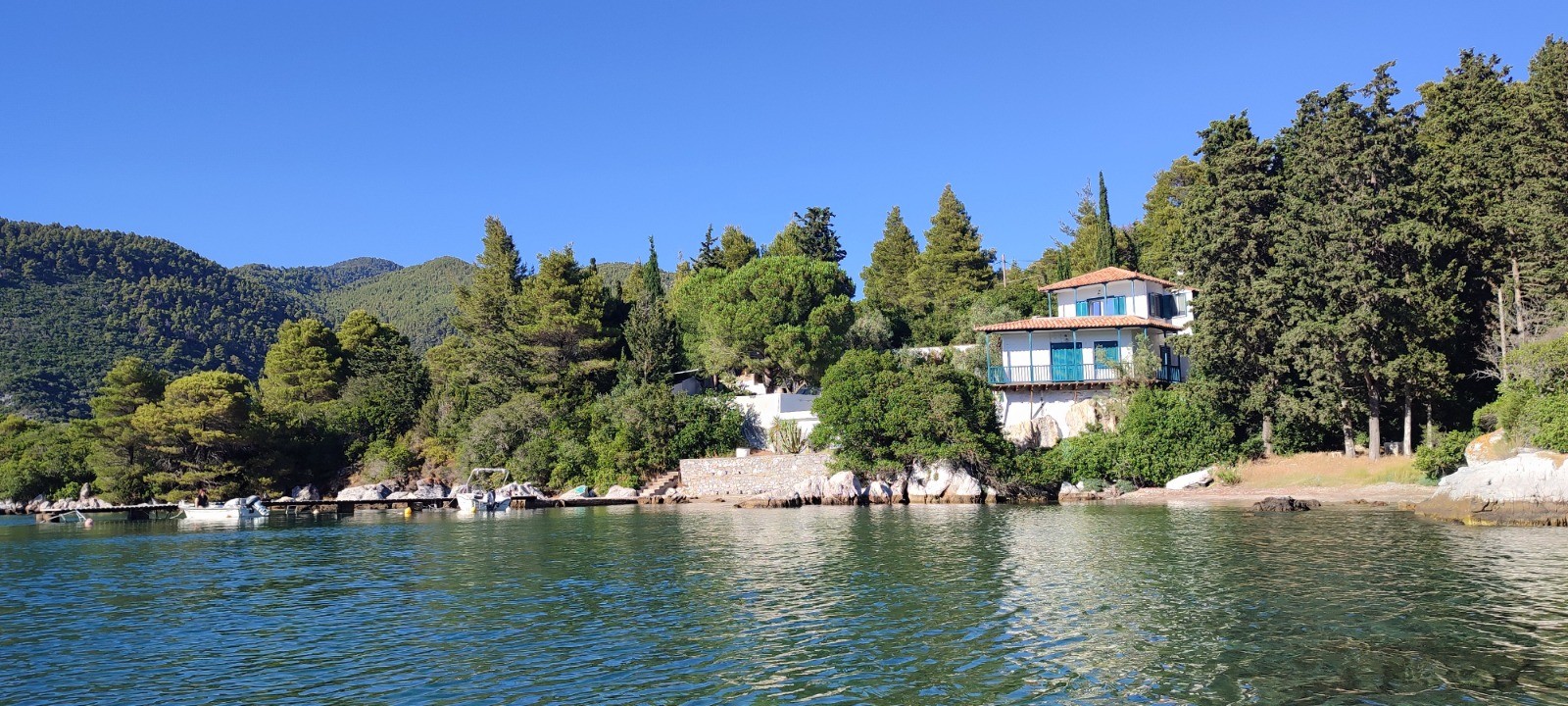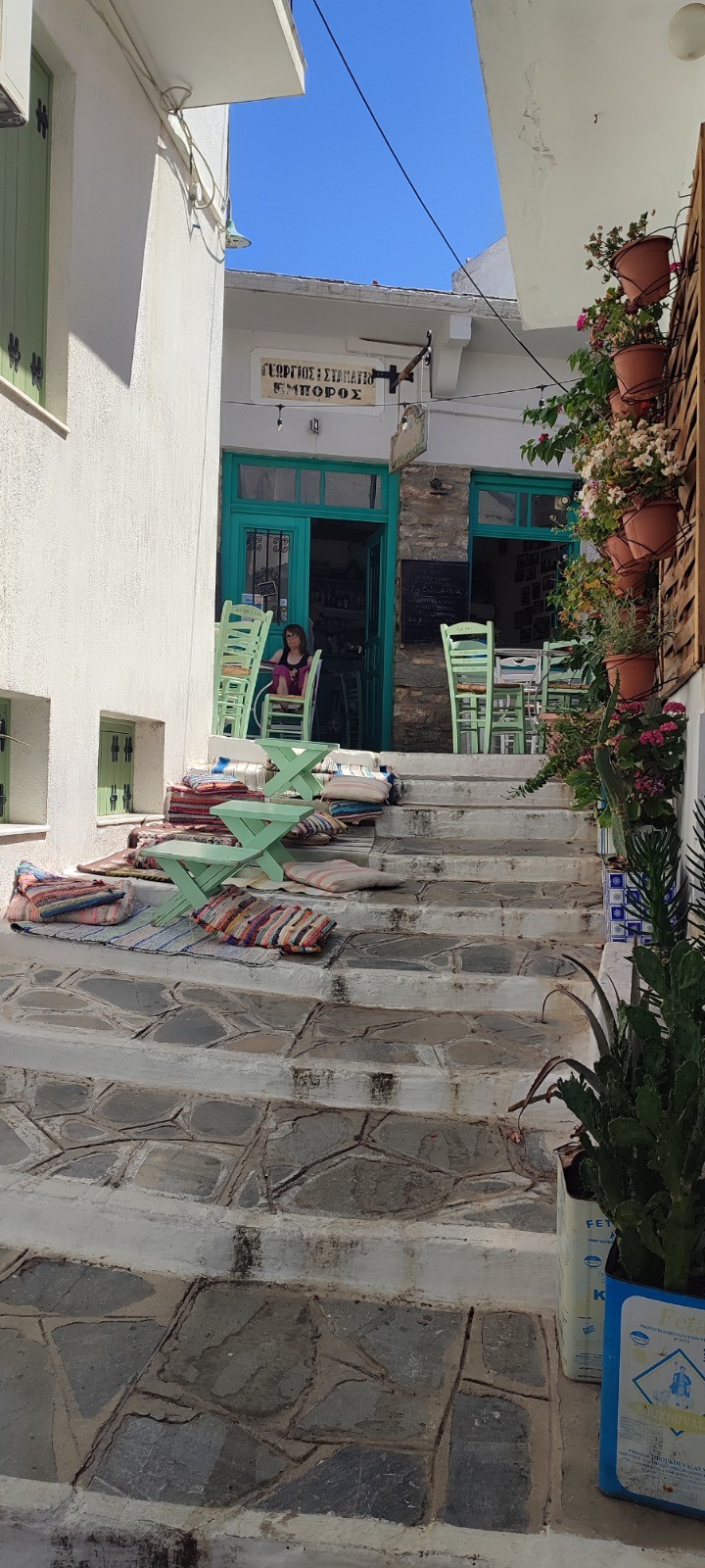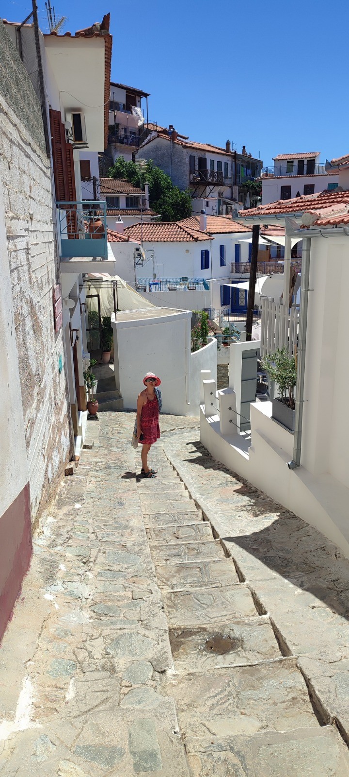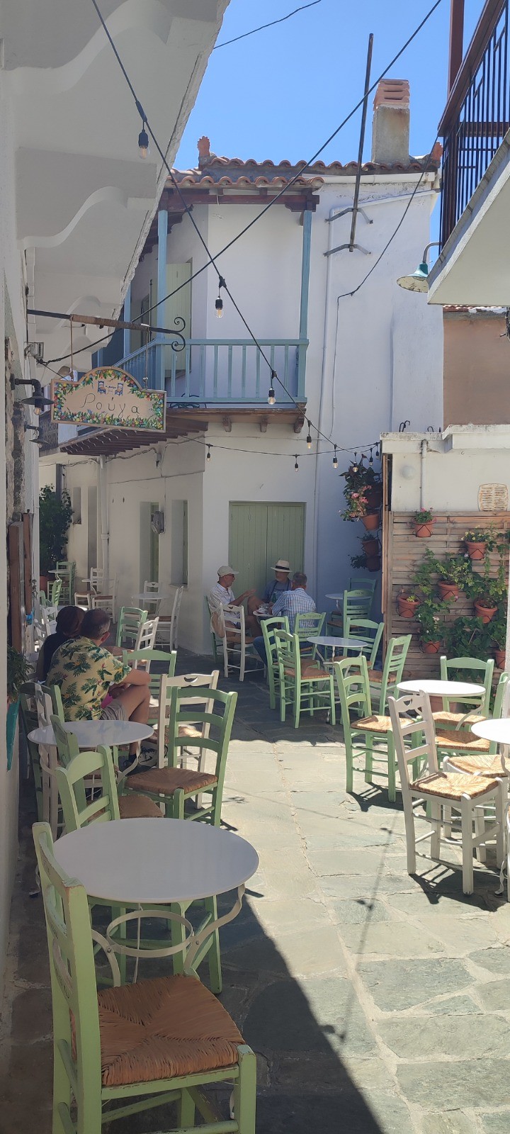 Bernard nous emmene à la jetée de Loutraki avec l'annexe qui a enfin son moteur qui marche bien que cahotiquement. Pendant qu'il va faire quelques épissures nous montons plein cagnard au village perché de Glossas. Nous visitons le musée folklorique et une expo photo d'un peintre local.