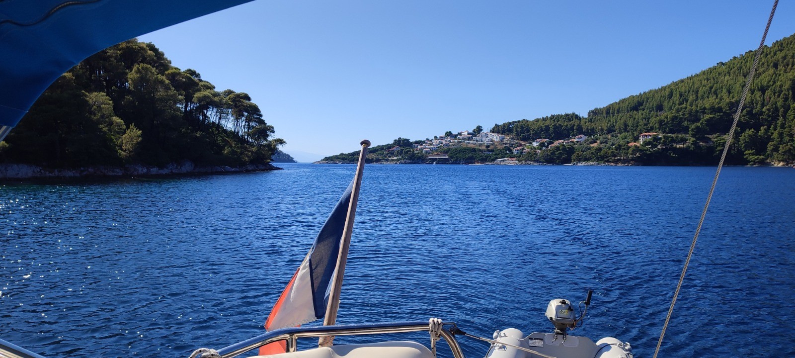 Bistrot, courses retour au bateau pour manger, sieste et nous partons à la rencontre d'amis de Maryvone et Bernard qui sont à 5 miles. Tentative de hisser le foc en vent arrière mais ça molli et nous finissons au moteur. Magnifique baie très bien protégée ou nous mouillons avec haussieres à terre. Paddle, apéro sur le superbe Kata de Gilles et Brigitte.