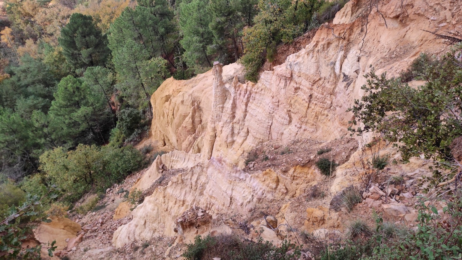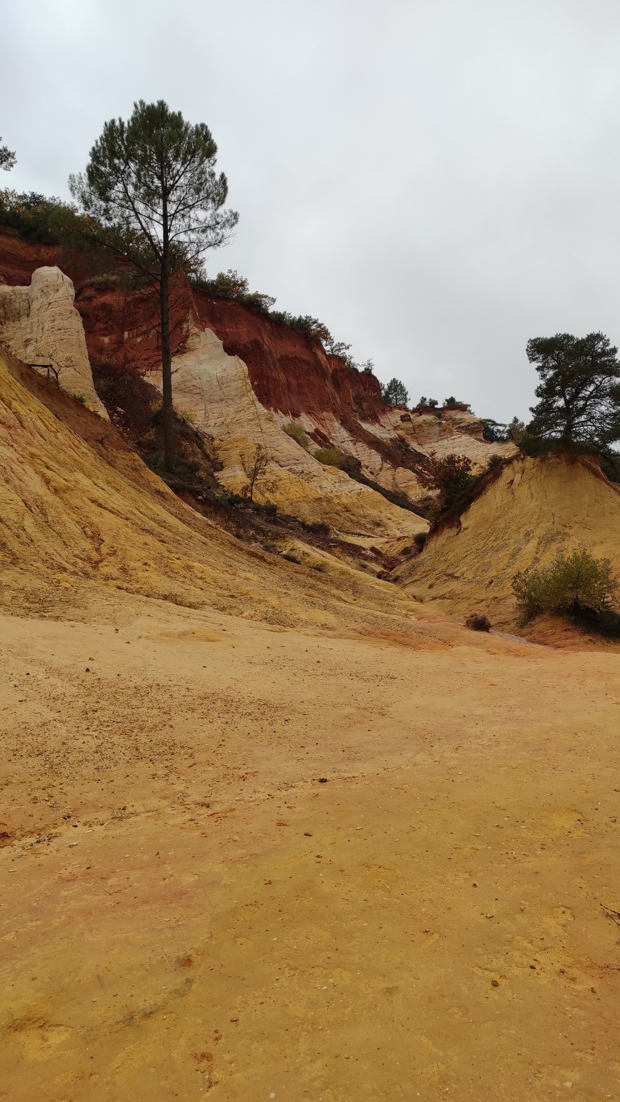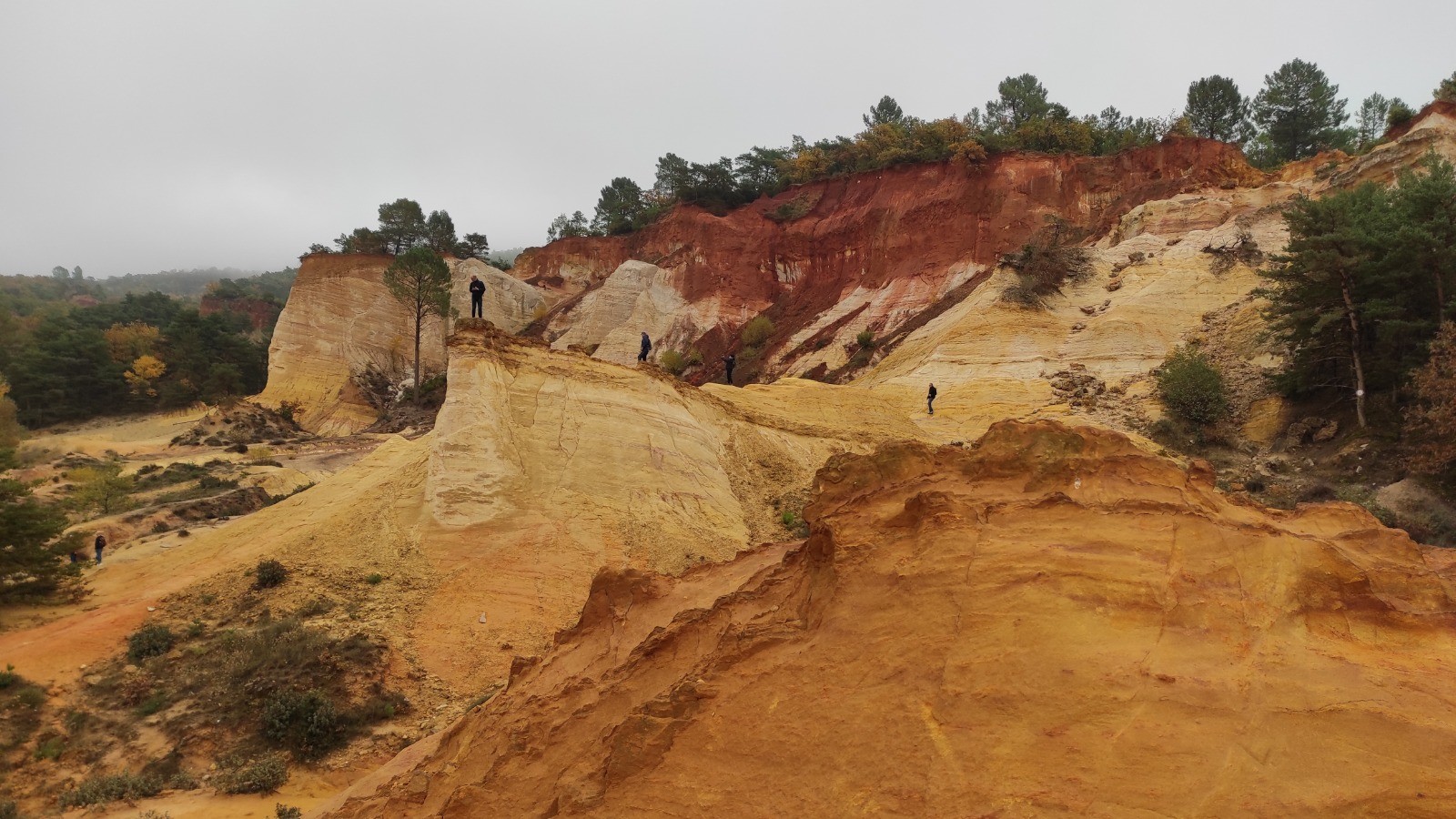 Nous commençons la journée sans pluie, mais avec un ciel couvert. Magnifique ballade à pied dans le Colorado provençal puis nous reprenons les vélos pour rejoindre le circuit de Caseneuve. Dure grimpette en VTT au début pour rejoindre une petite route déserte. On mange de justesse, il est 14:30 hr à Caseneuve. Nous rejoignons ensuite rapidement St Martin de Castillon puis longue montée pour arriver à Viens. Retour à Rustrel en passant par Gignac.
