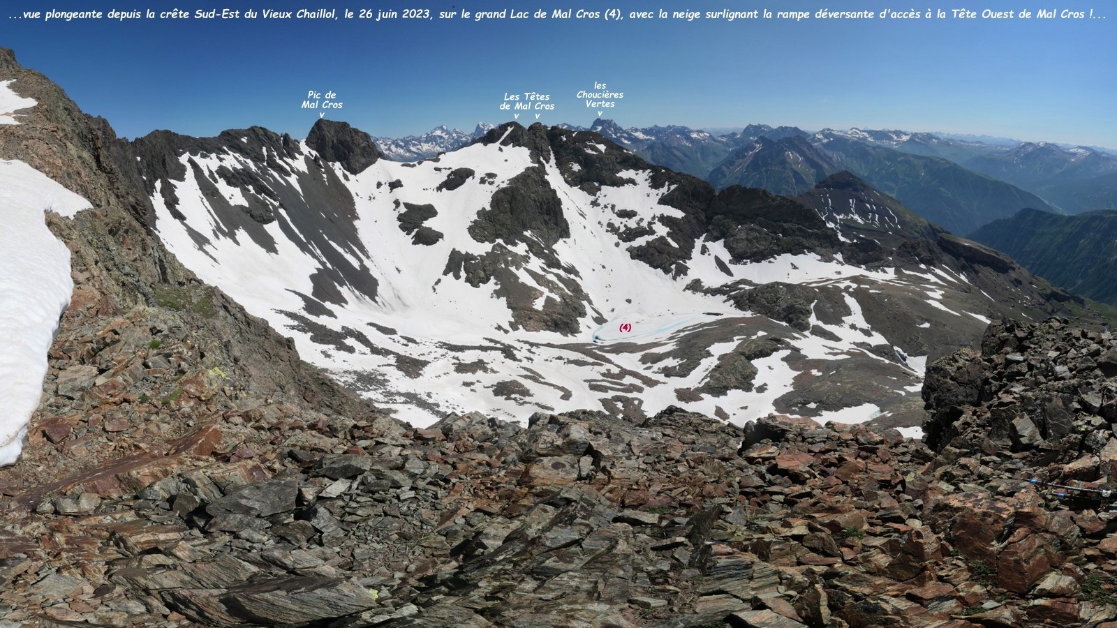 La Tête Ouest de Mal Cros, 3086m, n'est assurément pas une destination fréquente en randonnée plus ou moins alpine : c'est seulement le 7 septembre 2016, lorsque avec Monique nous avions accompagné jusqu'au grand lac de Mal Cros notre ami Pascal pour en effectuer son ascension, que j'avais appris que ce relativement discret sommet entre l'inaccessible Pic de Mal Cros pour une modeste randonneuse et sa plus lointaine Tête Est séparée de celle-ci par la profonde et quasi-infranchissable Brèche de l'Homme Étroit pouvait être atteint sans avoir une formation spécifique à l'alpinisme. Il ne s'agissait d'ailleurs pas d'une première pour moi, puisque j'étais déjà venue jusqu'à la prise d'eau du Canal de Mal Cros avec mon amie Sandrine en 2013.