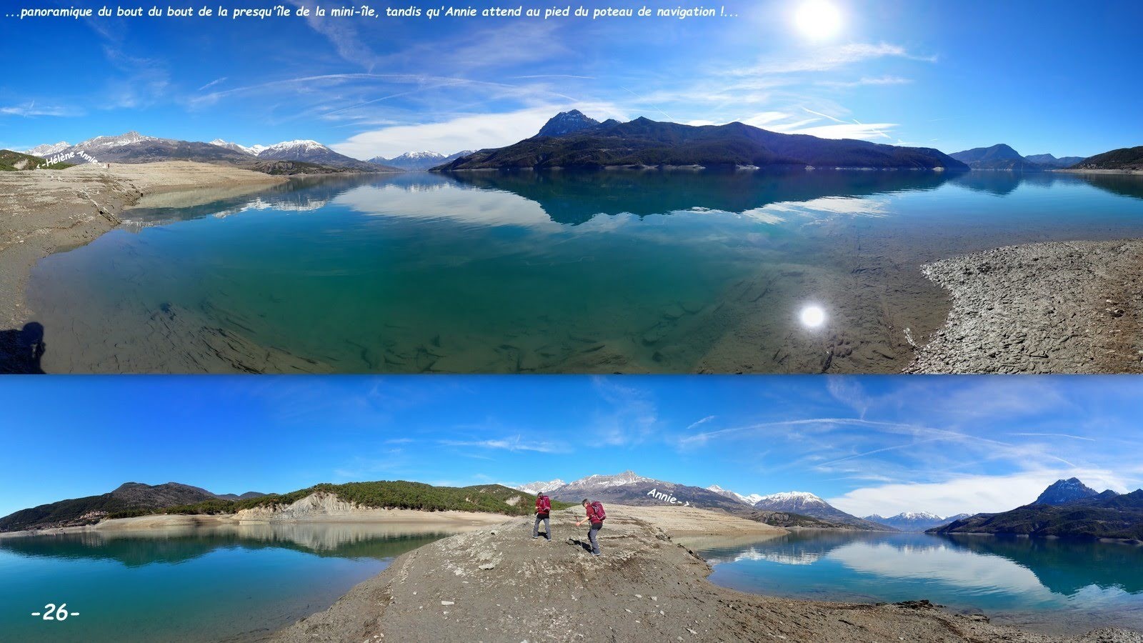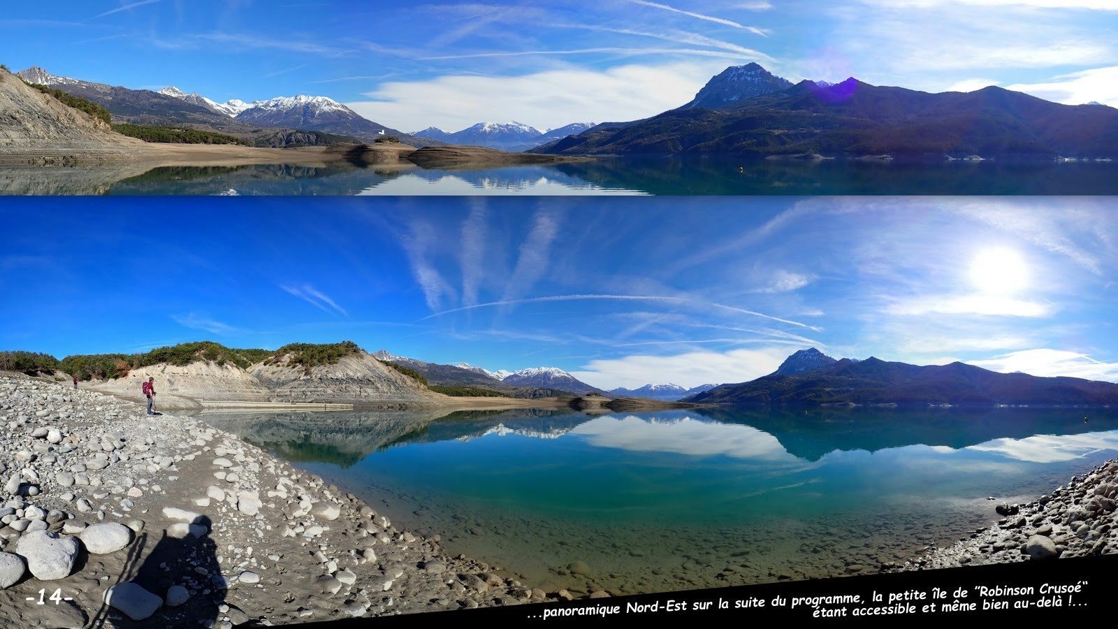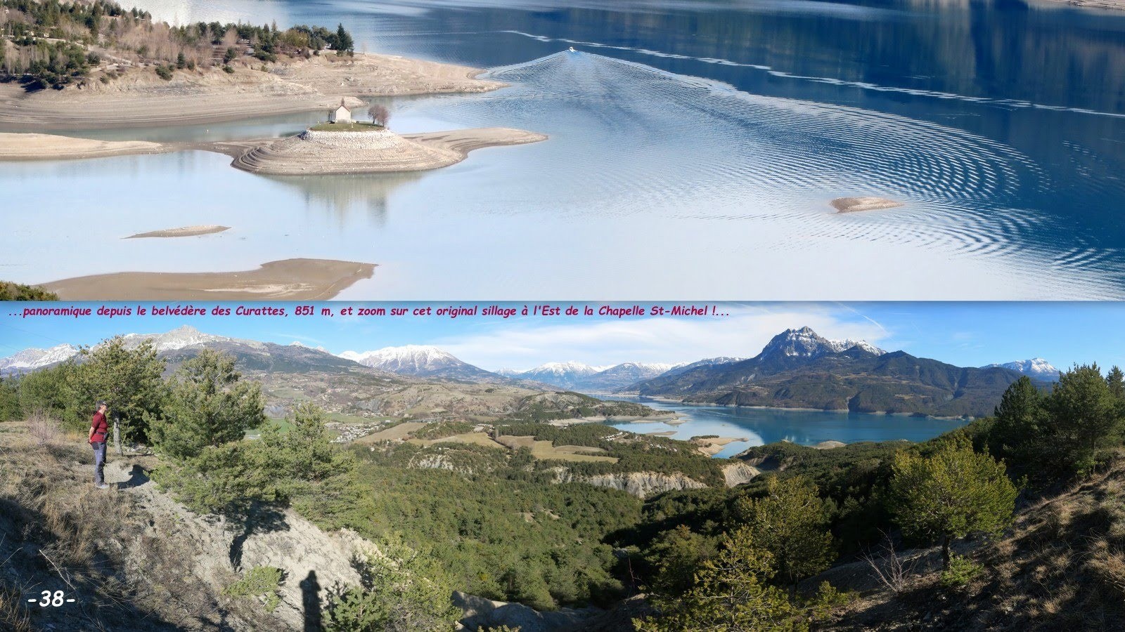 Pour notre promenade dominicale, nous avons unanimement opté pour peu de distance et de dénivelé alors, par une aussi belle journée pourquoi ne pas retourner parcourir le très sympathique petit circuit de la presqu'île entre les Baie des Moulettes plus connue sous le nom de Chanteloube et celle de la Chapelle St-Michel en faisant le tour du Serre de l'Aigle et Pra d'Ase. En profitant de l'étiage d'hiver du Lac de Serre-Ponçon pour, en cerises sur le gâteau, effectuer : un aller-retour sur le splendide Viaduc submergé (lorsque le lac est à son marnage maximum, 780 m), ainsi que sur la presqu'île supportant la minuscule "île de Robinson Crusoé", cotée 786 m, et pour les plus véloces jusqu'à l'ex-Table d'Orientation du belvédère des Curattes. Belle occasion pour découvrir à notre retour sur Chanteloube les étonnantes ravines de Ranguis et ainsi passer une fort agréable journée, avec des températures dignes d'un mois de mai !...