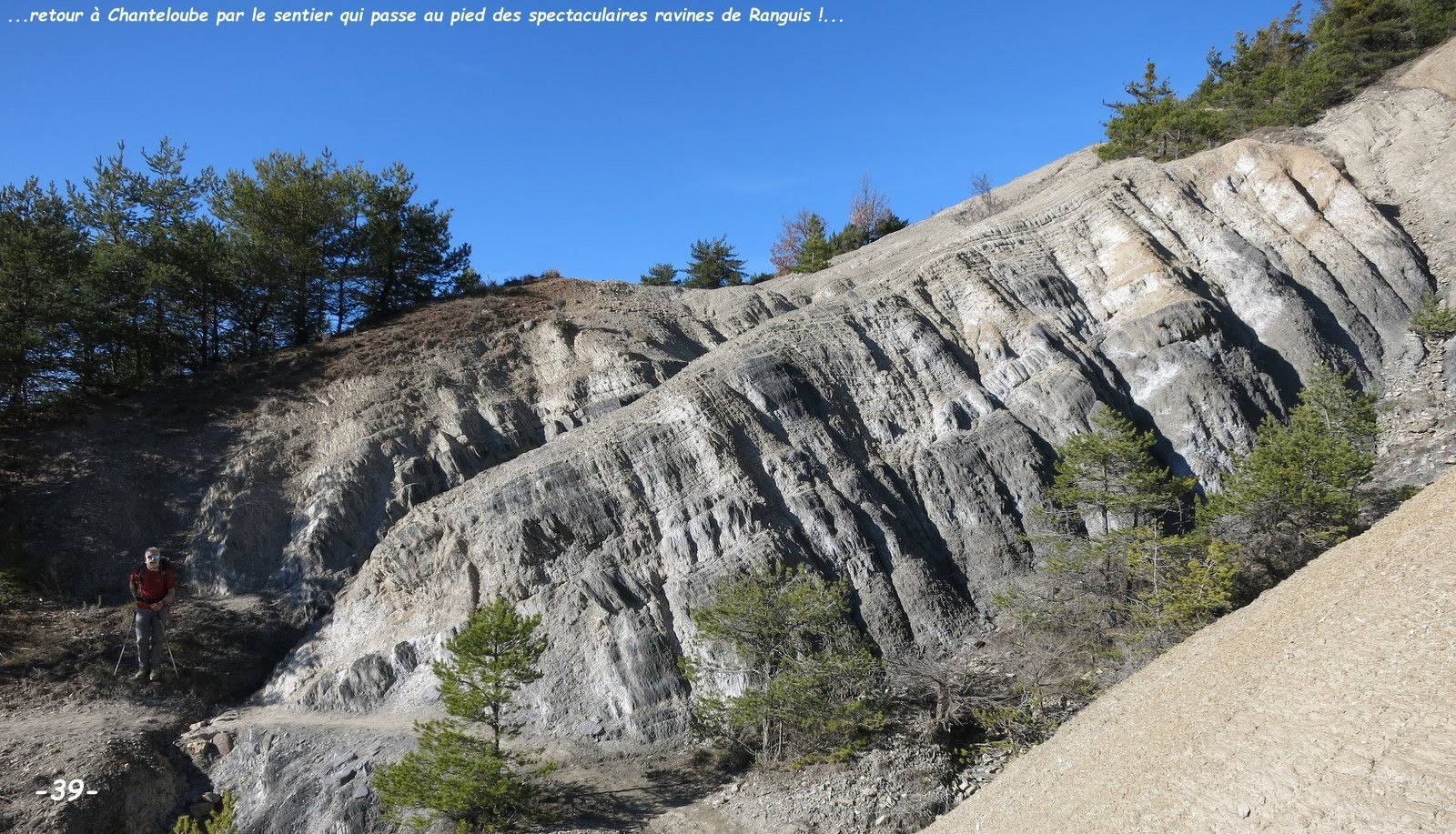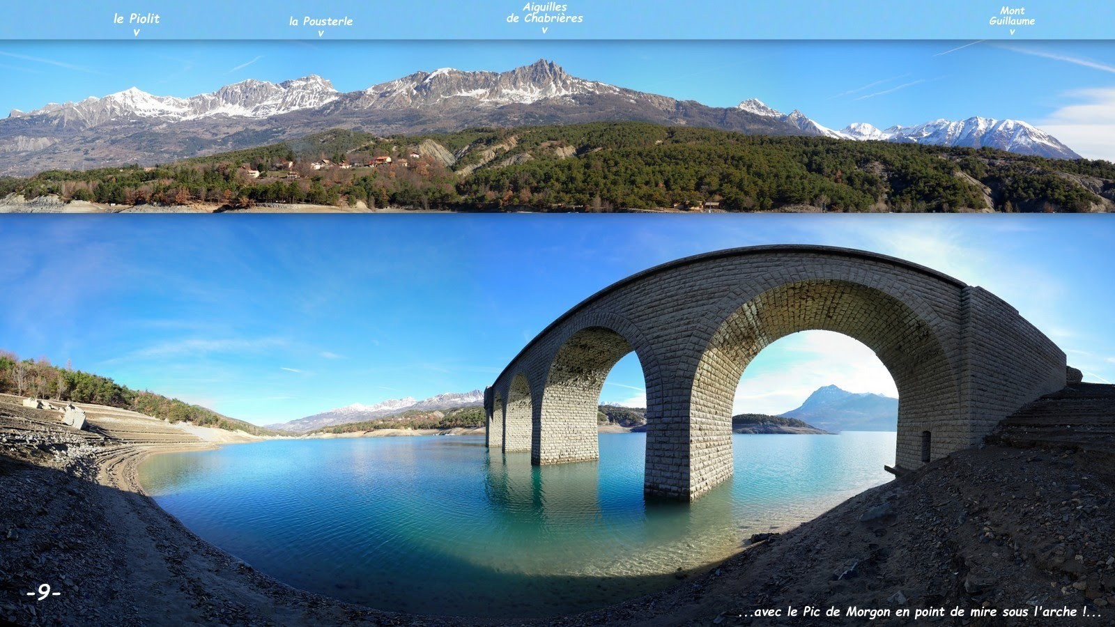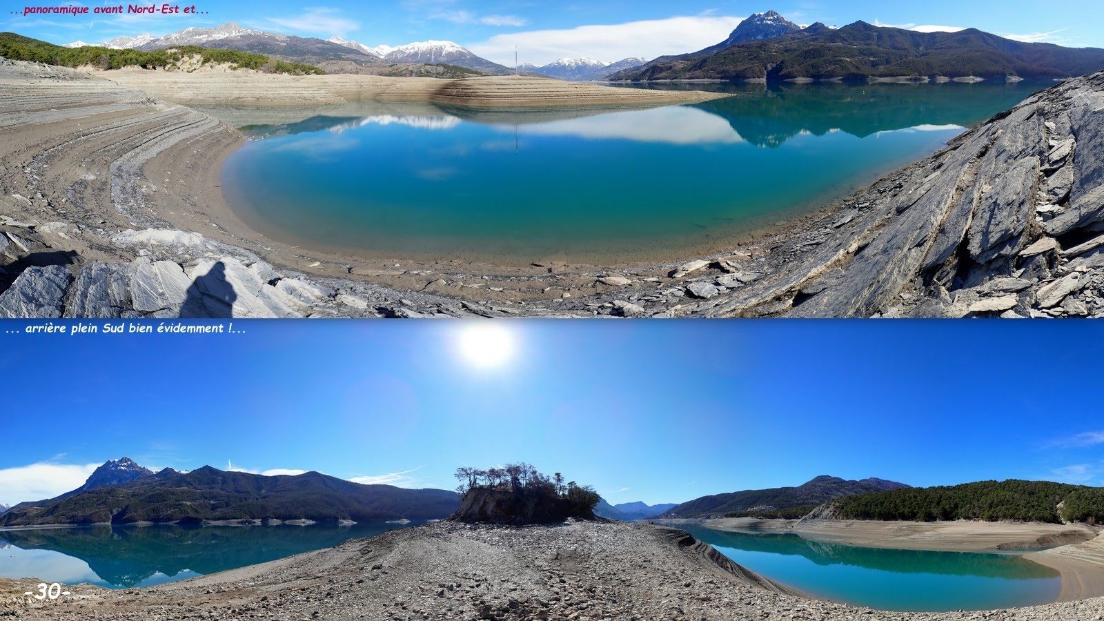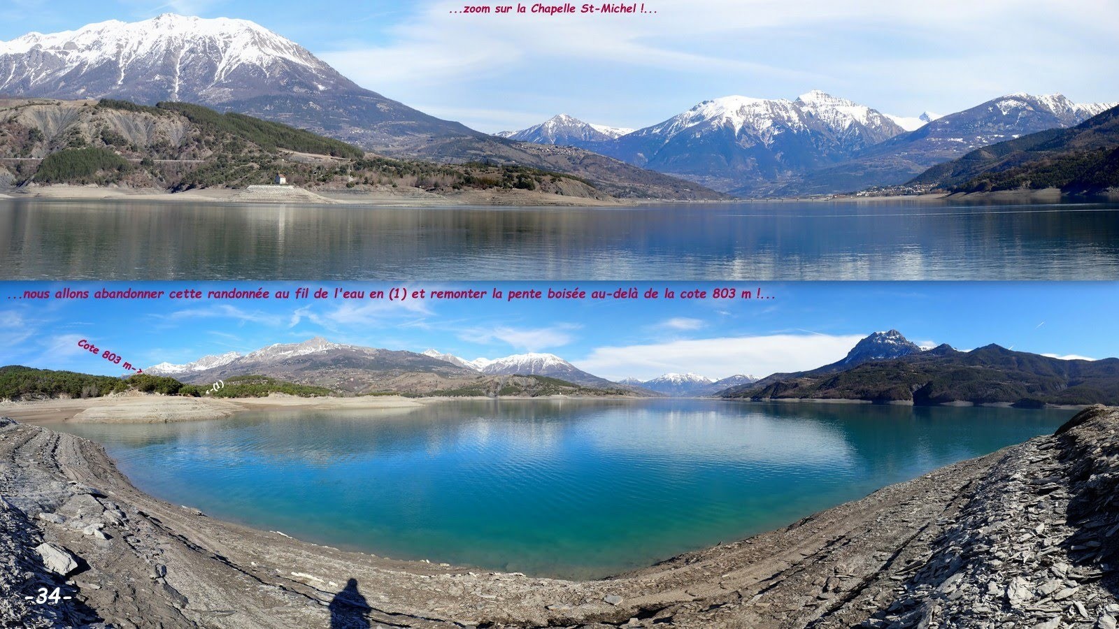 Pour notre promenade dominicale, nous avons unanimement opté pour peu de distance et de dénivelé alors, par une aussi belle journée pourquoi ne pas retourner parcourir le très sympathique petit circuit de la presqu'île entre les Baie des Moulettes plus connue sous le nom de Chanteloube et celle de la Chapelle St-Michel en faisant le tour du Serre de l'Aigle et Pra d'Ase. En profitant de l'étiage d'hiver du Lac de Serre-Ponçon pour, en cerises sur le gâteau, effectuer : un aller-retour sur le splendide Viaduc submergé (lorsque le lac est à son marnage maximum, 780 m), ainsi que sur la presqu'île supportant la minuscule "île de Robinson Crusoé", cotée 786 m, et pour les plus véloces jusqu'à l'ex-Table d'Orientation du belvédère des Curattes. Belle occasion pour découvrir à notre retour sur Chanteloube les étonnantes ravines de Ranguis et ainsi passer une fort agréable journée, avec des températures dignes d'un mois de mai !...