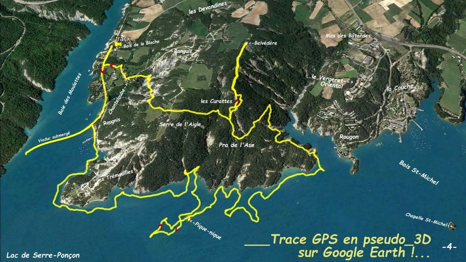 depuis la route de la Baie de Chanteloube au lieu-dit Bois de la Blache, 800 m GPS > suivre la route jusqu'au Viaduc submergé > A/R jusqu'à la berge opposée > suivre au mieux le bord de l'eau en profitant au maximum de toutes les presqu'îles émergées qui offrent une étonnante palette de perspectives différentes sur les berges du lac > arrivés en face Rougon, la baie au Nord-Ouest du serre coté 803 m présentant une rive assez abrupte et particulièrement glissante, nous avons choisi d'abandonner le bord de l'eau et de rejoindre le sentier balisé par la croupe > au Nord de Pra de l'Ase > les Curattes > A/R jusqu'à son belvédère (sans Table d'Orientation ?!) > le collet Nord du Serre de l'Aigle > Chanteloube par les ravines de Ranguis > retour parking par deux raccourcis.
