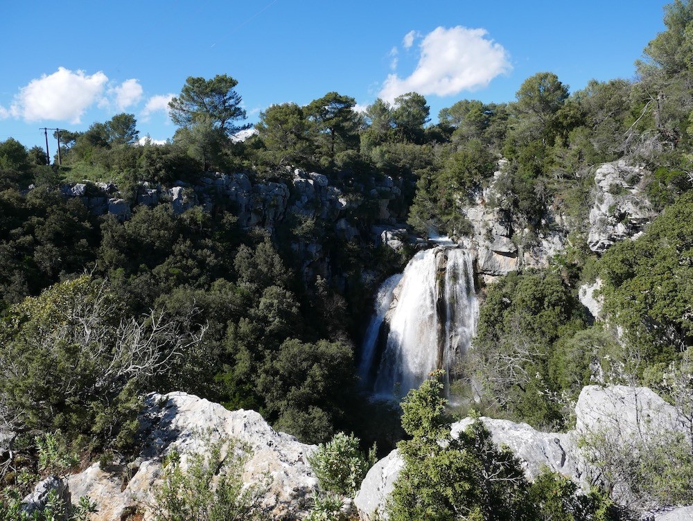 La grande cascade du Latay, près des carrières de Chibron, à Signes, après une période de fortes pluies. Le circuit peut être adapté et, s'il faut choisir, aller directement au belvédère de la rive gauche d'où la vue sur la cascade est superbe.