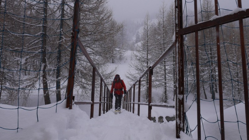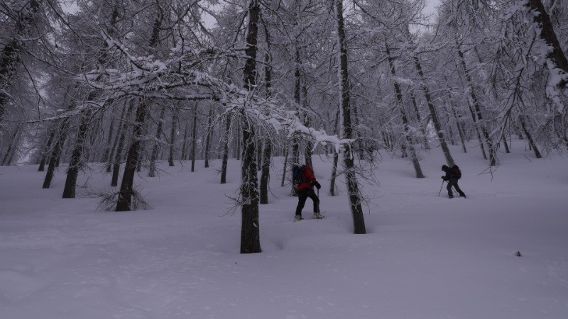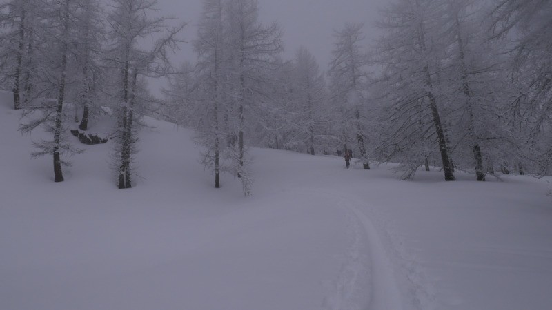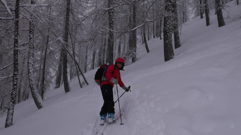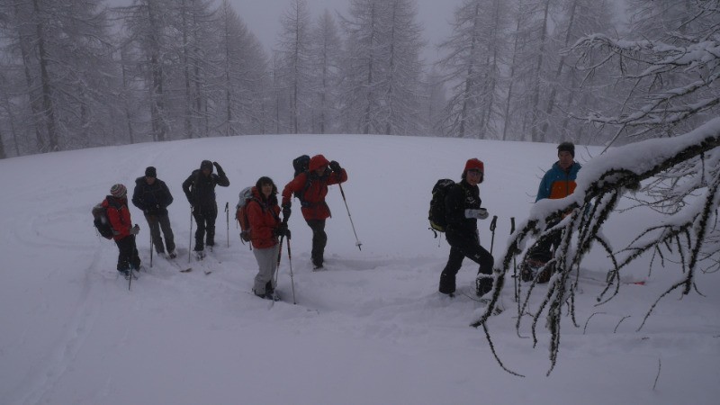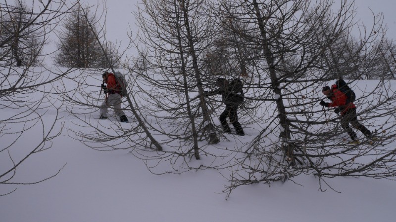 Il neige encore. Prudence. Une petite rando dans les Melezes pour le 3eme jour de la semaine rando 2018 en Val Stura. Superbe descente en poudre