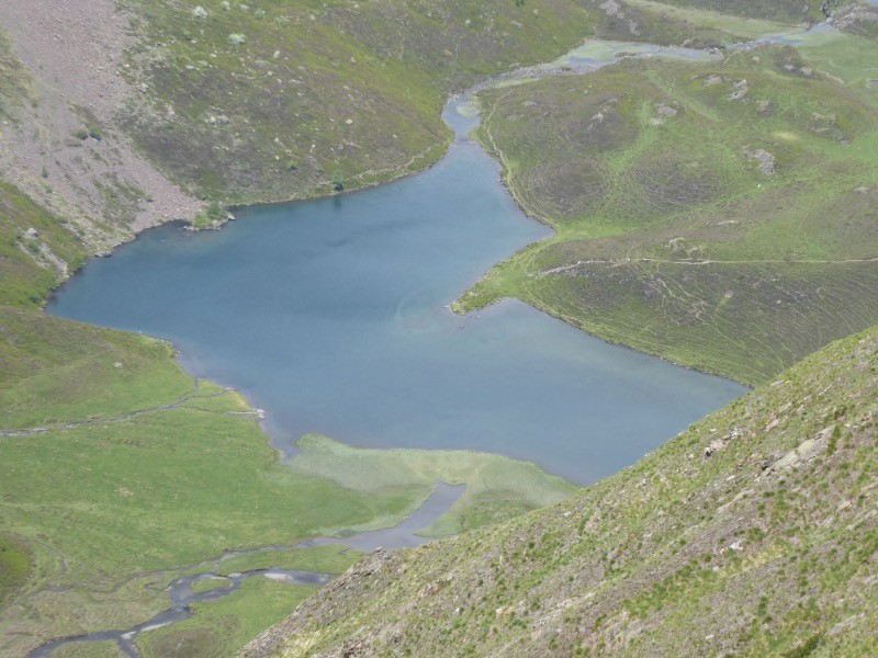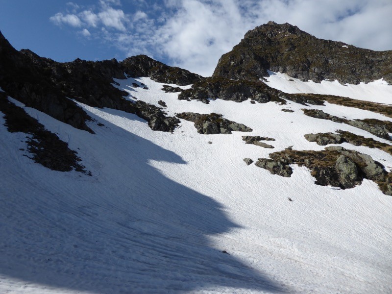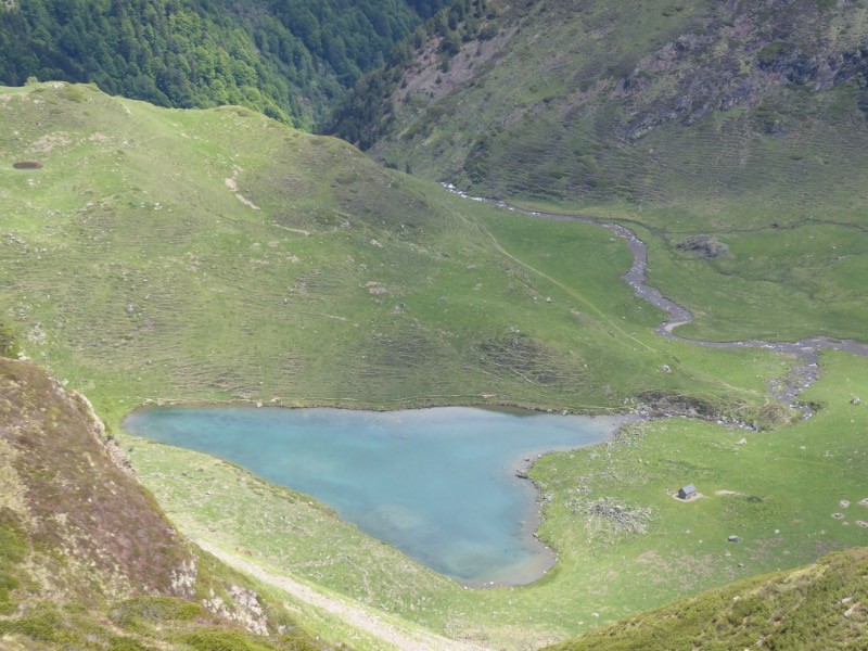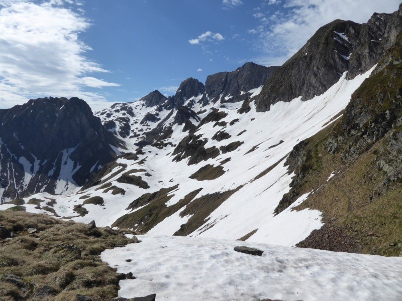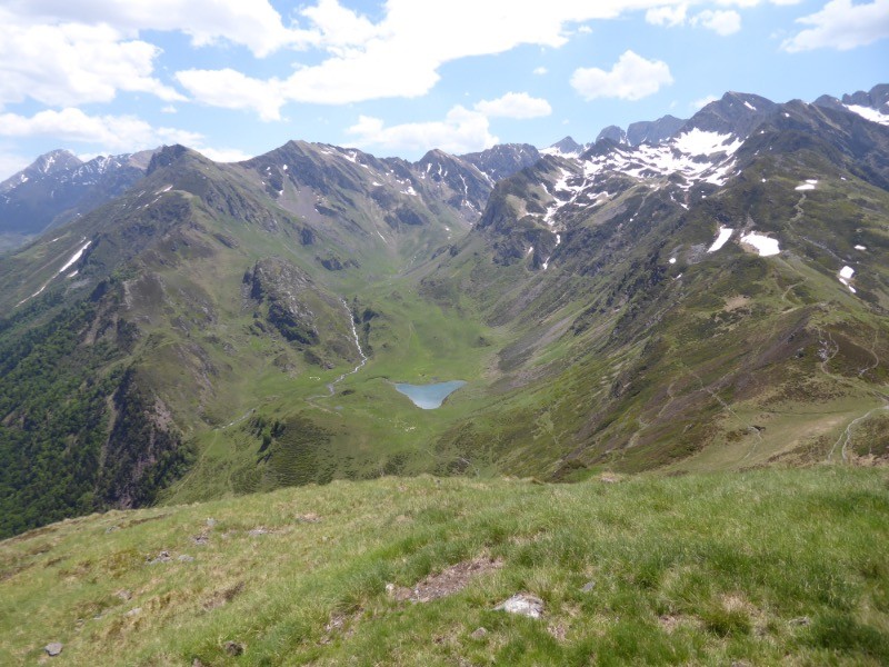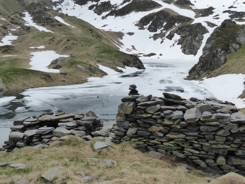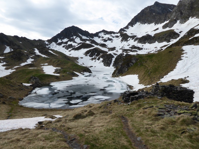 Visite à un lac encore pris par les glaces .Le lac de Bassias ou de Couey Sègue se situe au pied du Soum de Lascours , limitrophe du vallon qui descend vers le lac d'Ourec . Vue sur le Pic du Midi de Bigorre et le Montaigu que l'on a pas coutume de voir sous cet angle .