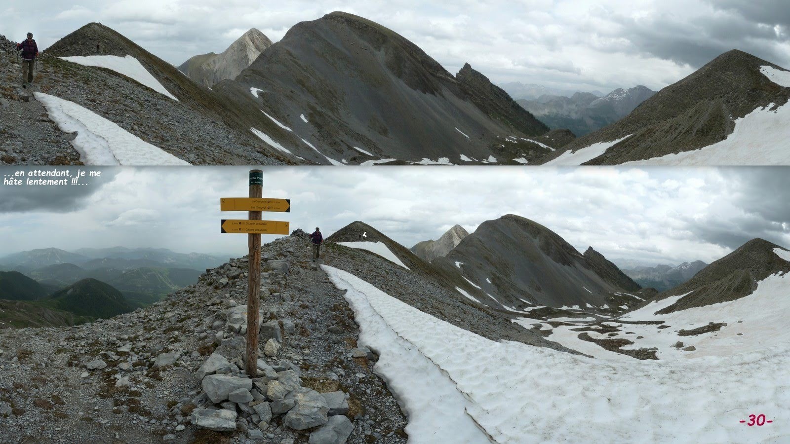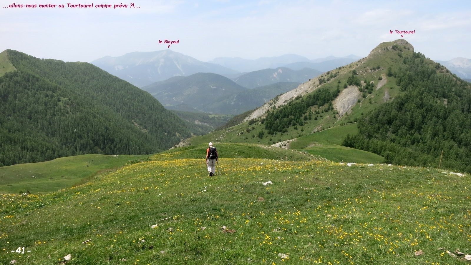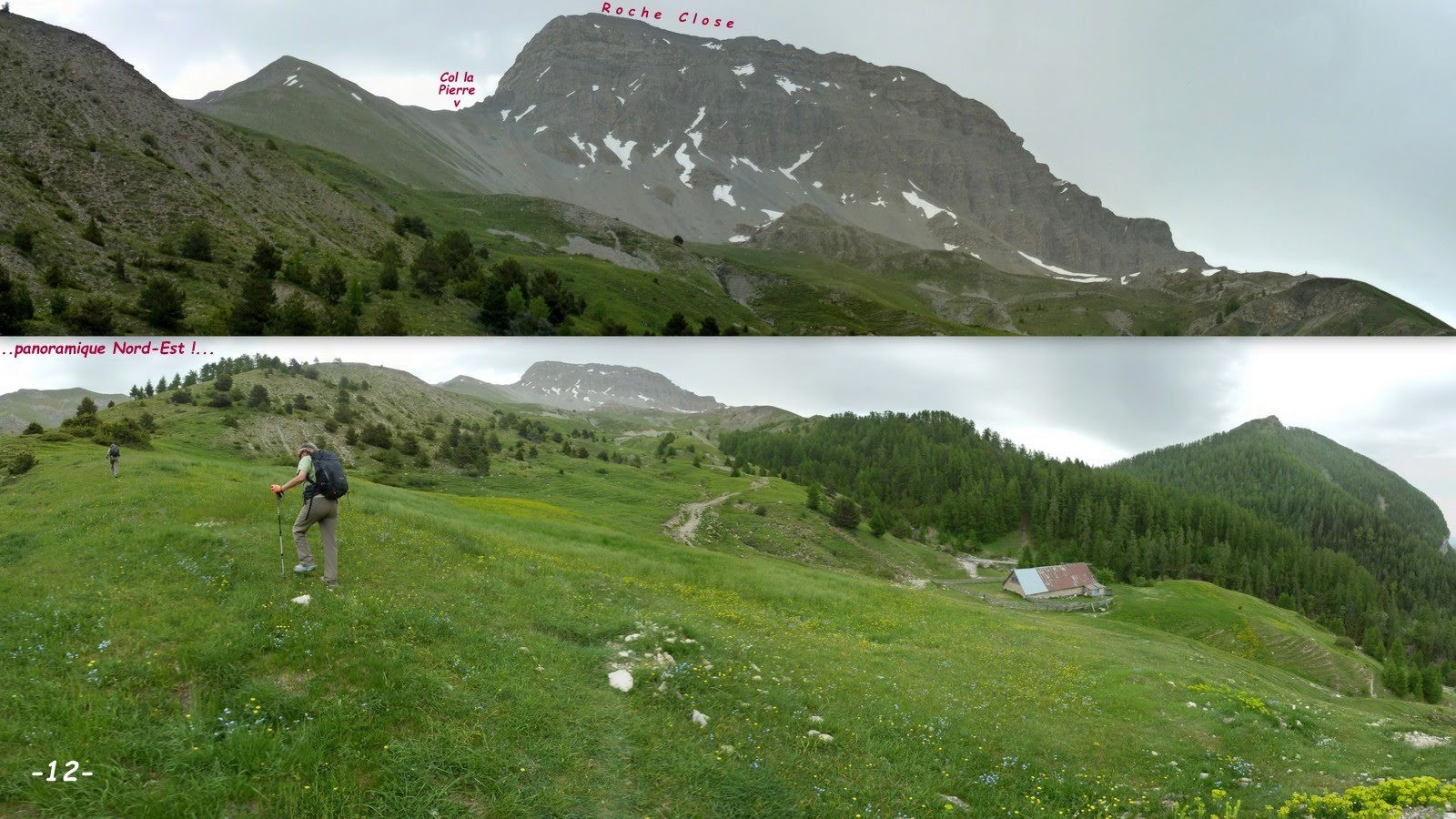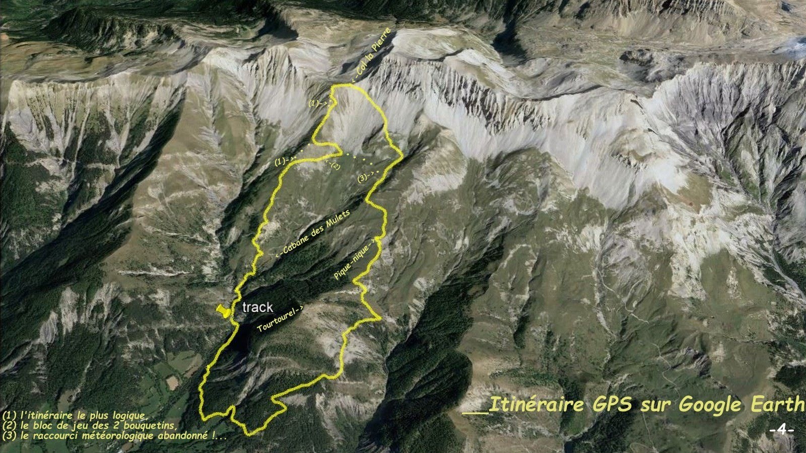 Depuis le premier lacet, 1510 m, de la route pastorale de la Cabane des Mulets > le très beau sentier raccourci de la Blanche, barré d'une croix jaune au départ, jusqu'à la croupe du Bosquet suivie de celle du Clot du Col la Pierre que nous devions remonter jusqu'à son sommet, 2442 m, à l'Ouest du Col la Pierre > les incertitudes météorologiques nous ont conduit à une variante vers la source de la Blanche pour revenir ensuite à notre projet initial > Col la Pierre 2433 m > descente par son sentier balisé pour retrouver celui du tour du Tourtourel sans la variante prévue de sa traversée ainsi que son passage par la Cabane de Couloubroux que nous avons court-circuité à cause de la météo > retour parking.