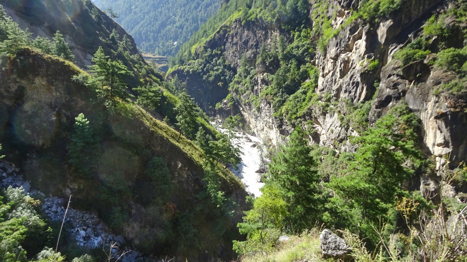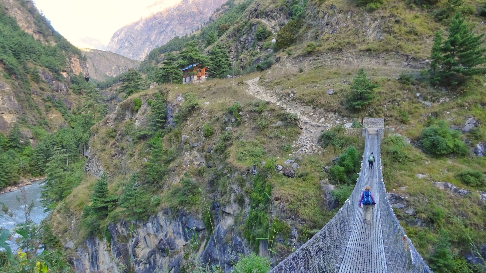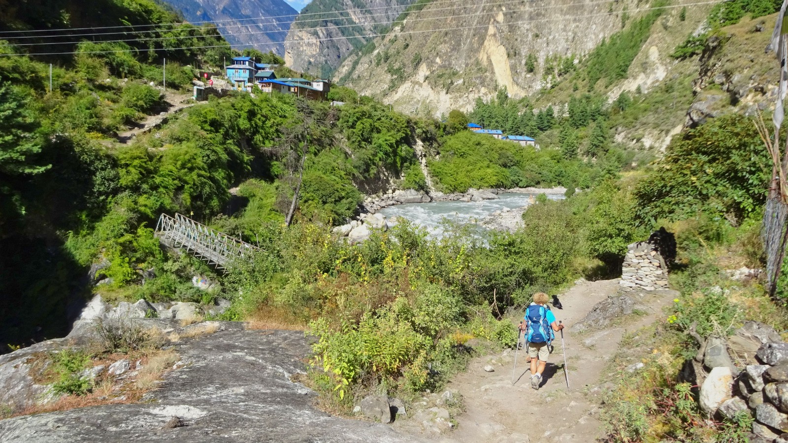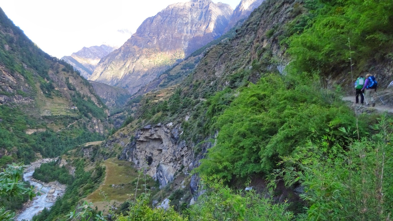 On démarre la journée par un magnifique sentier en balcon sur la rive gauche de la rivière Budhi Gandaki, du plat Népalais, des escaliers, passerelles, et plus surprenant des plants de cannabis en bordure du chemin.