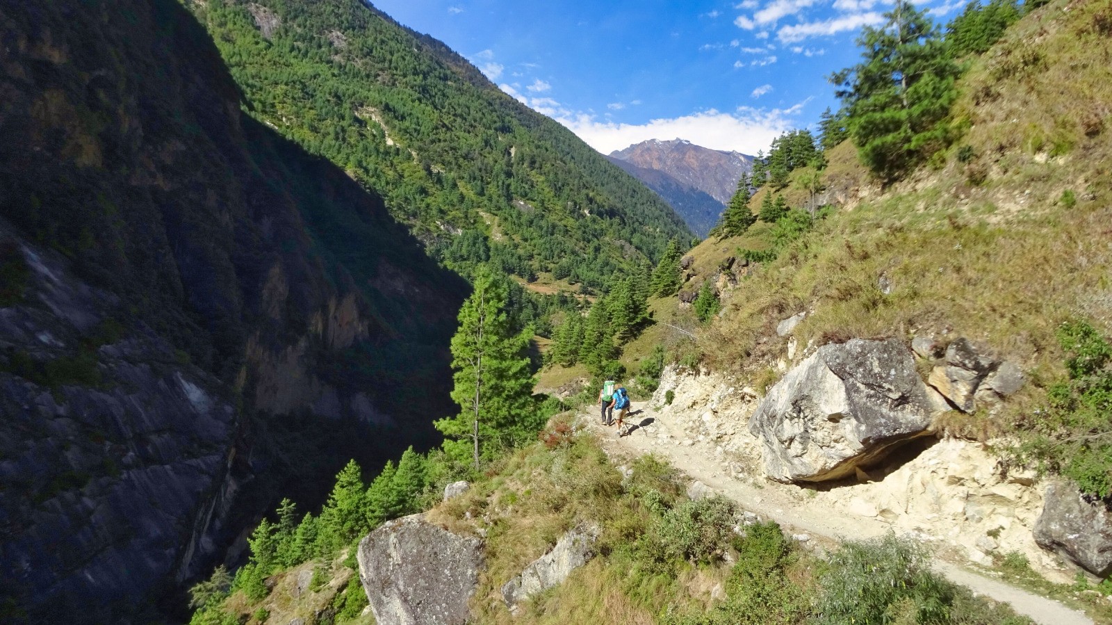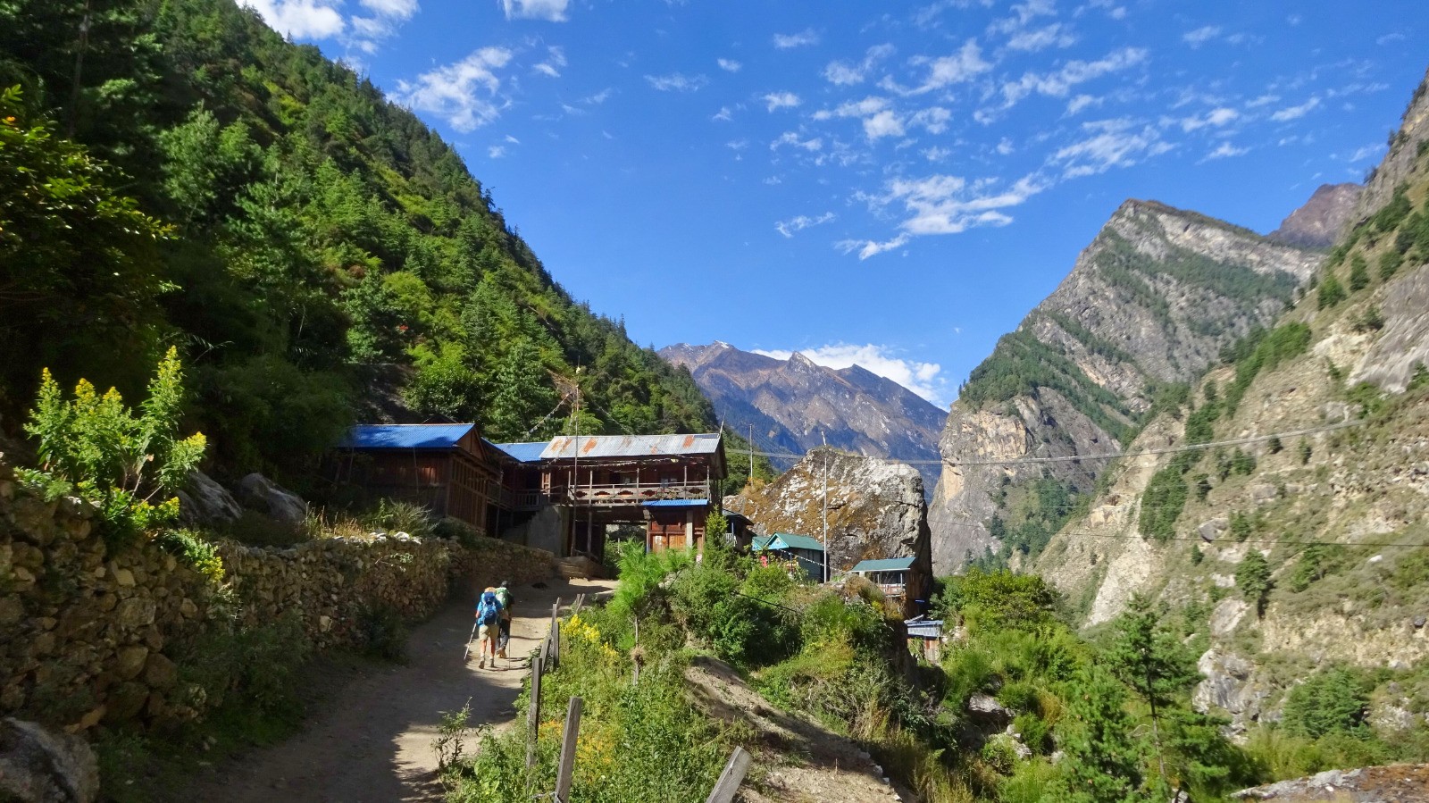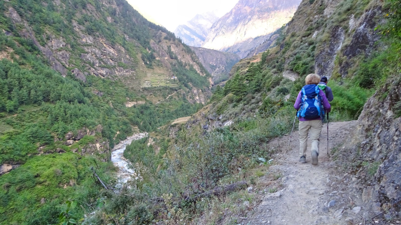 On démarre la journée par un magnifique sentier en balcon sur la rive gauche de la rivière Budhi Gandaki, du plat Népalais, des escaliers, passerelles, et plus surprenant des plants de cannabis en bordure du chemin.