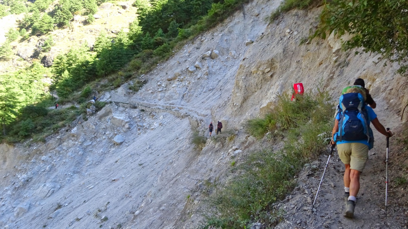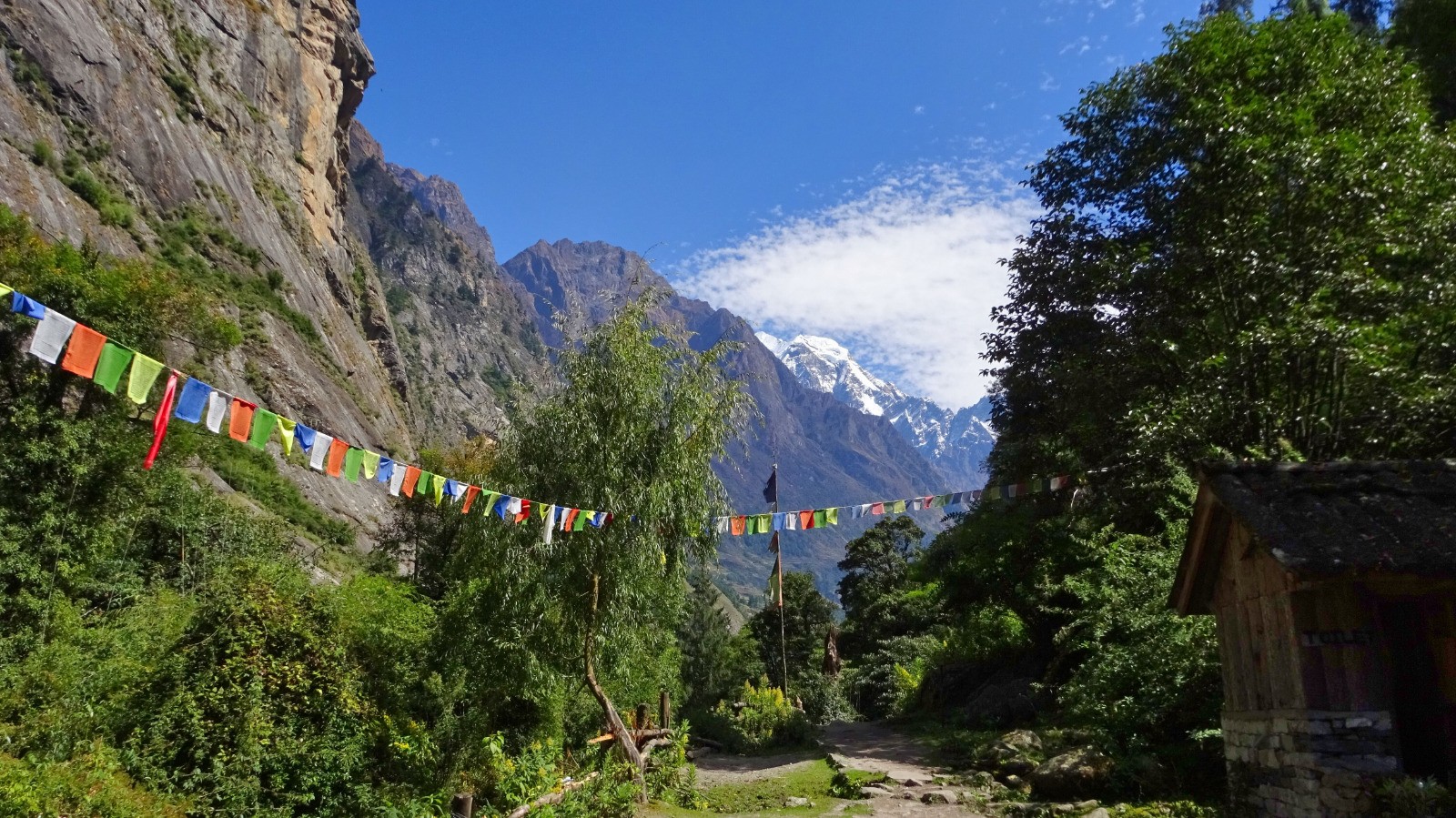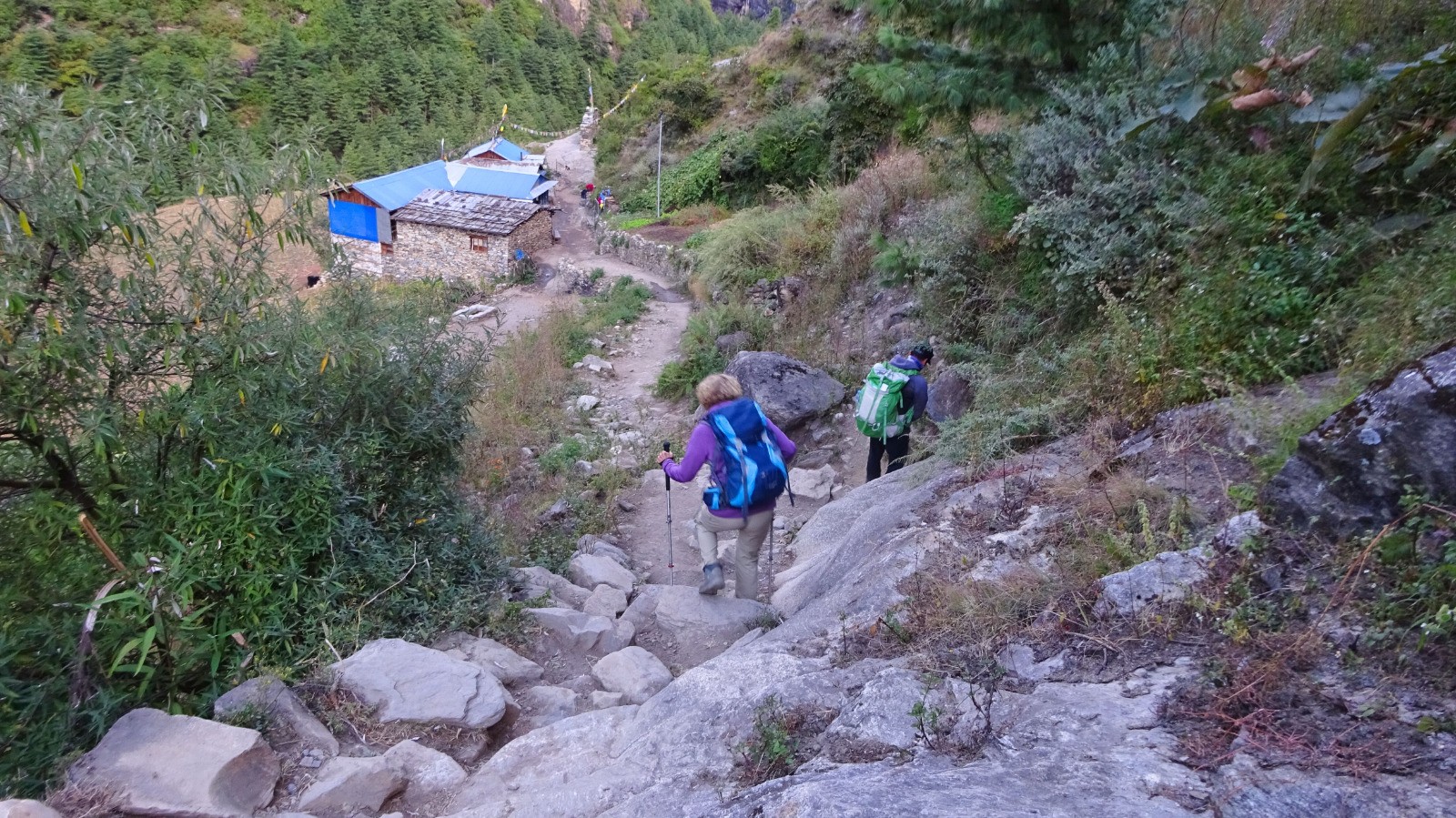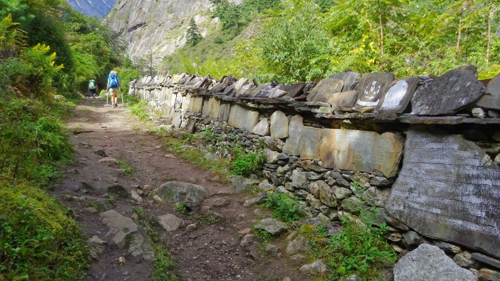 On démarre la journée par un magnifique sentier en balcon sur la rive gauche de la rivière Budhi Gandaki, du plat Népalais, des escaliers, passerelles, et plus surprenant des plants de cannabis en bordure du chemin.