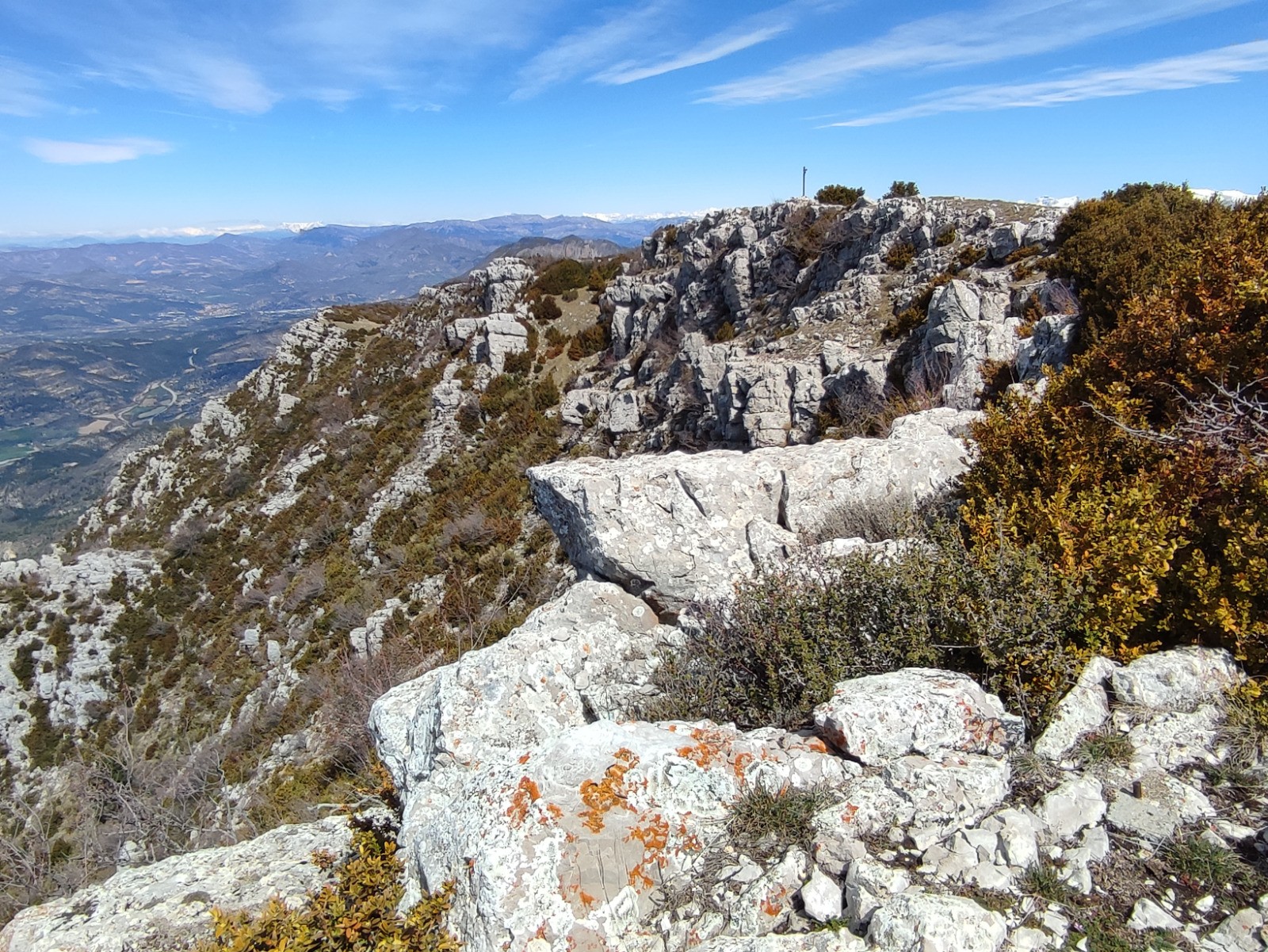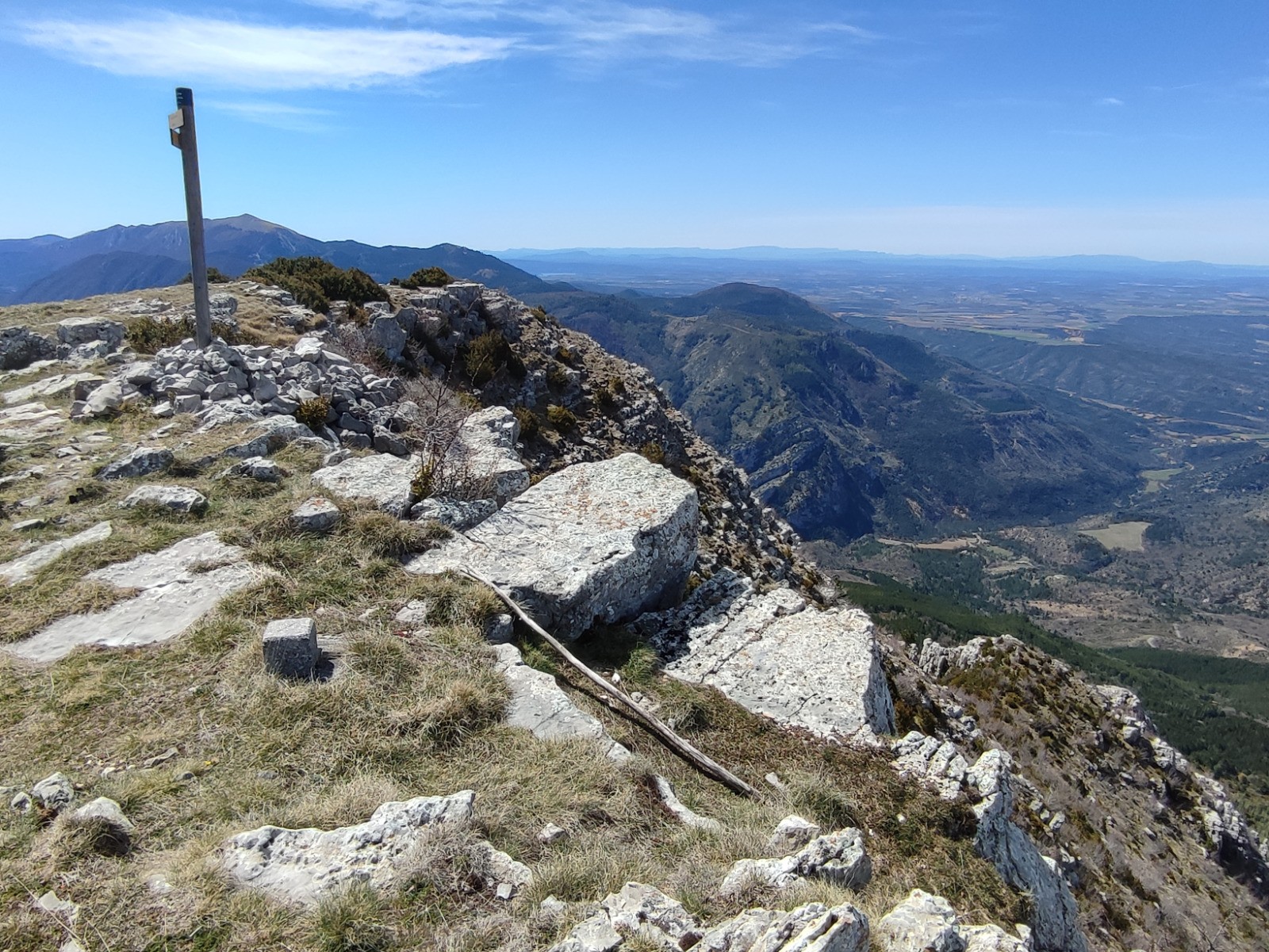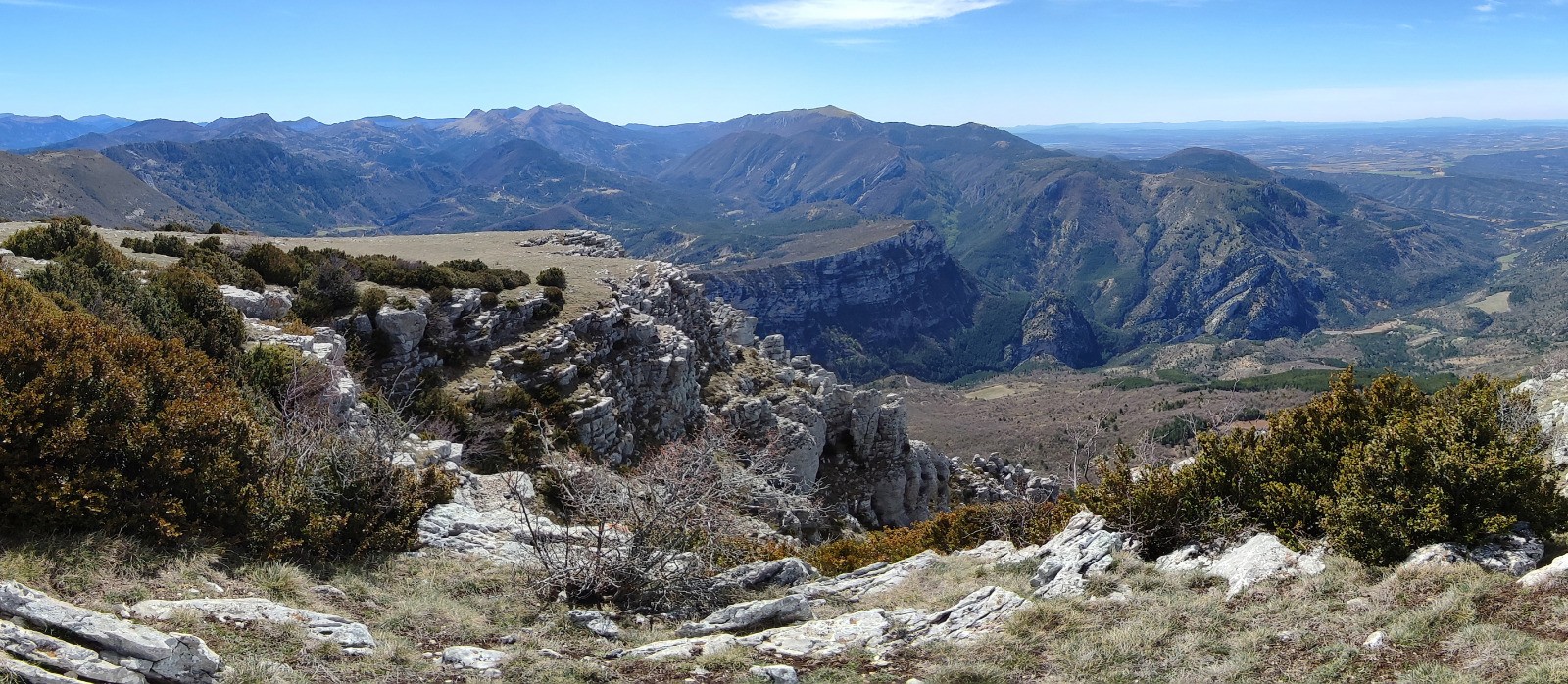 La 16/04/2023, la visibilité est excellente, on voit la neige sur les sommets entre 2000 et 2500m. Vue sur le Dévoluy et le plateau de Bure, sur les Ecrins, sur la Tête de l'Estrop.