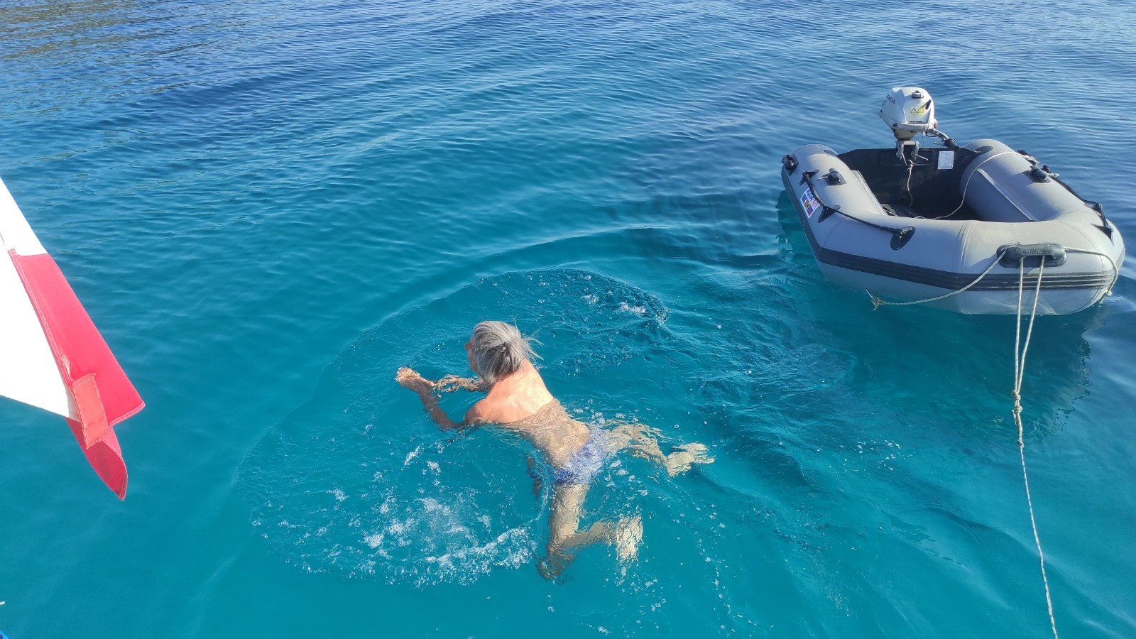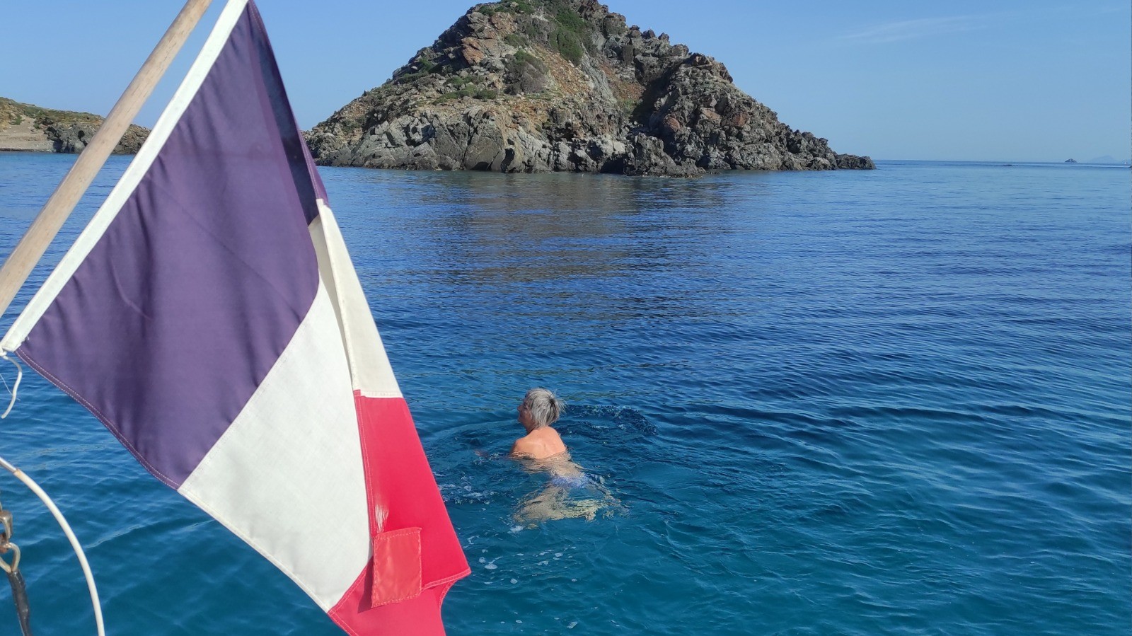 Nous levons l'ancre tranquillement. Tentative de hisser la voile vite abandonnée, le vent est trop faible.