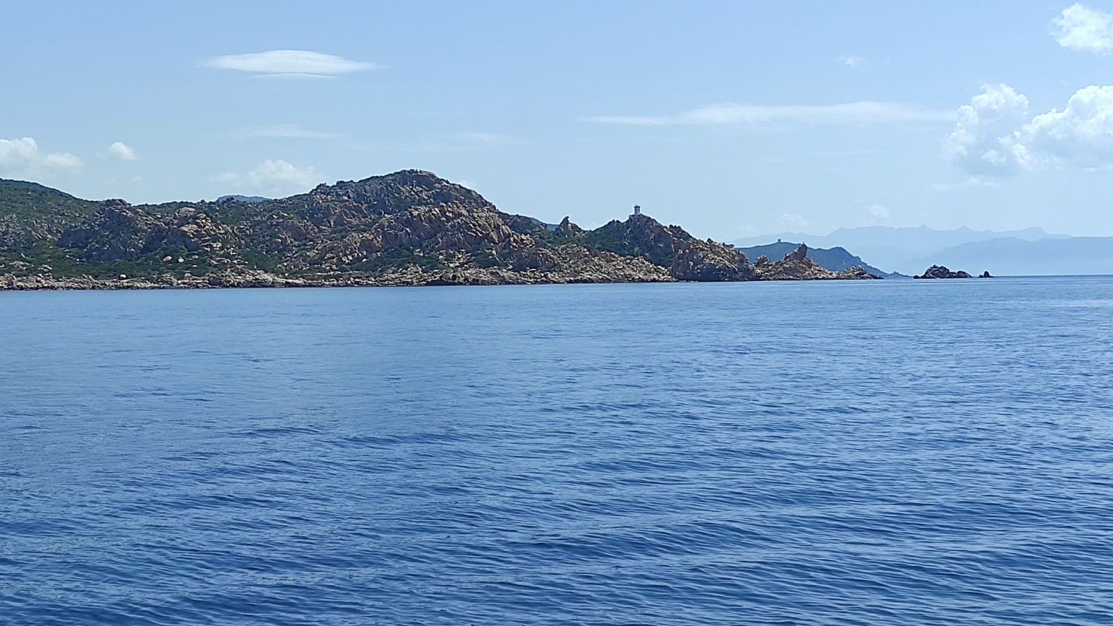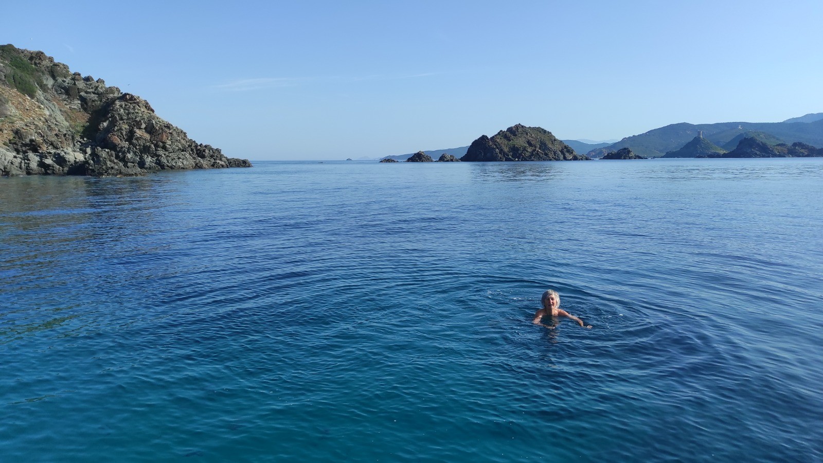 Mouillage pour le repas de midi, salade de thon (hi hi), à une plage en face d'un cabanon, la Cala d'Orzu.