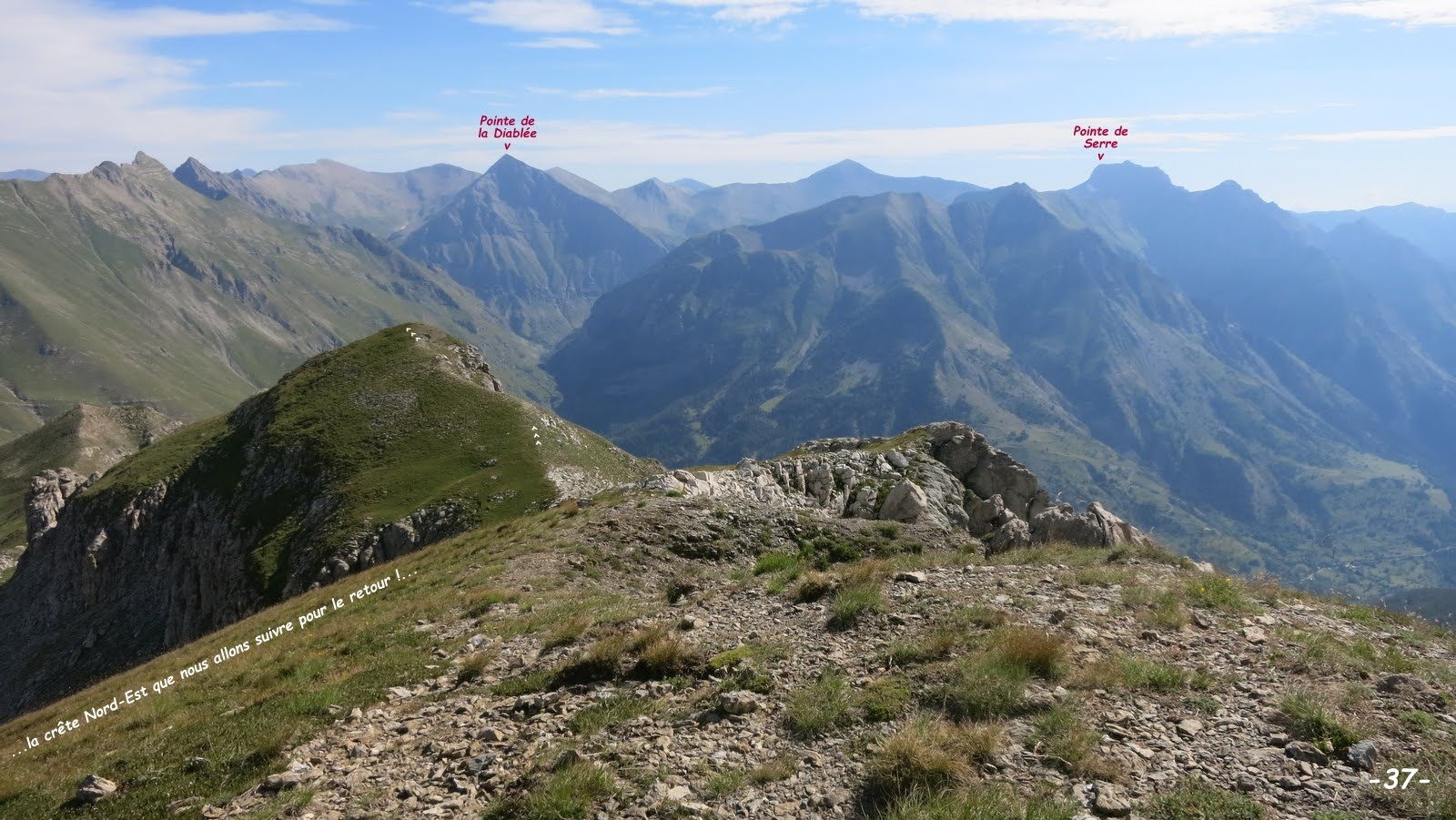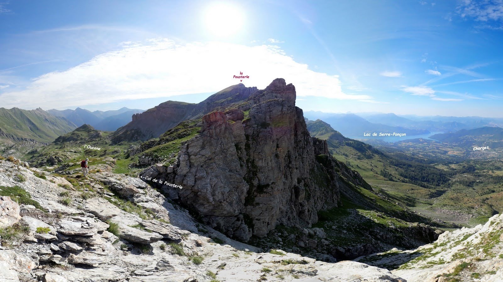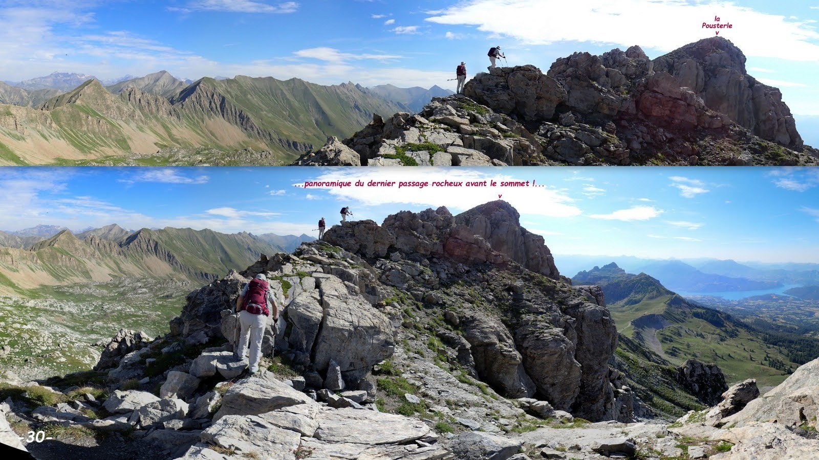 - par la crête Ouest depuis le Col de la Pousterle, bonne sente avec un passage rocheux facile mais raide (notre itinéraire de montée) !
