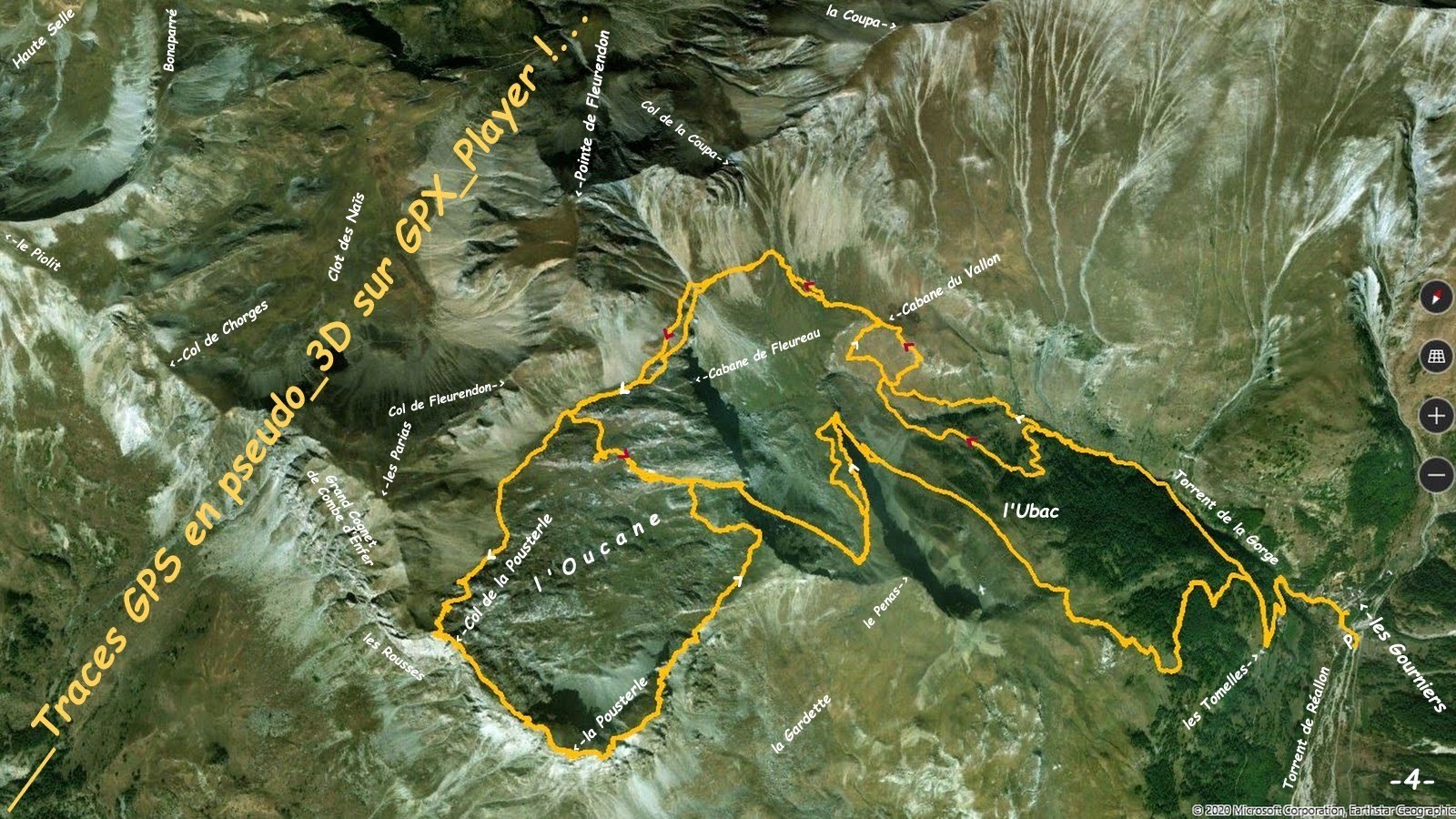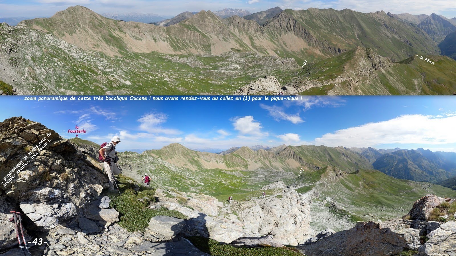depuis le parking visiteurs des Gourniers > les Tomelles par le macadam > la piste pastorale de la nouvelle Cabane et l'ancienne du Vallon > les premiers lacets du sentier du Col de la Coupa > la sente à moutons de l'Oucane qui passe au-dessus à droite de la Cabane de Fleureau > visite de l'Oucane en montant au Col de la Pousterle > sommet par la bonne sente de la crête Ouest (quelques petits passages rocheux faciles et peu exposés), large pelouse sommitale > retour par la crête Nord-Est, pelouse, puis rochers herbeux jusqu'au-dessus du bastion infranchissable par le fil, descendre prudemment au collet précédent et le contourner par la gauche, petite désescalade puis éboulis ou, comme nous, par la droite plus facile et moins croulant, même si la prudence y reste de rigueur, retour au plus tôt sur la crête > par son fil, le collet coté 2321 m (puis il peut être intéressant de monter jusqu'à la pointe cotée 2363 m) > nous avons choisi de couper par l'alpage jusqu'à sa crête Nord-Ouest pour ne pas nous priver du spectacle > descente à la rencontre de la Marmotte et retour sur le sentier taillé dans la barre rocheuse suivi jusqu'au talweg de la combe Nord-Ouest du Pénas > descente par la crête de sa rive droite jusqu'au sentier de l'Ubac > jonction avec le sentier Ouest de la Gardette - Pénas descendu jusqu'à l'itinéraire de montée et retour parking.