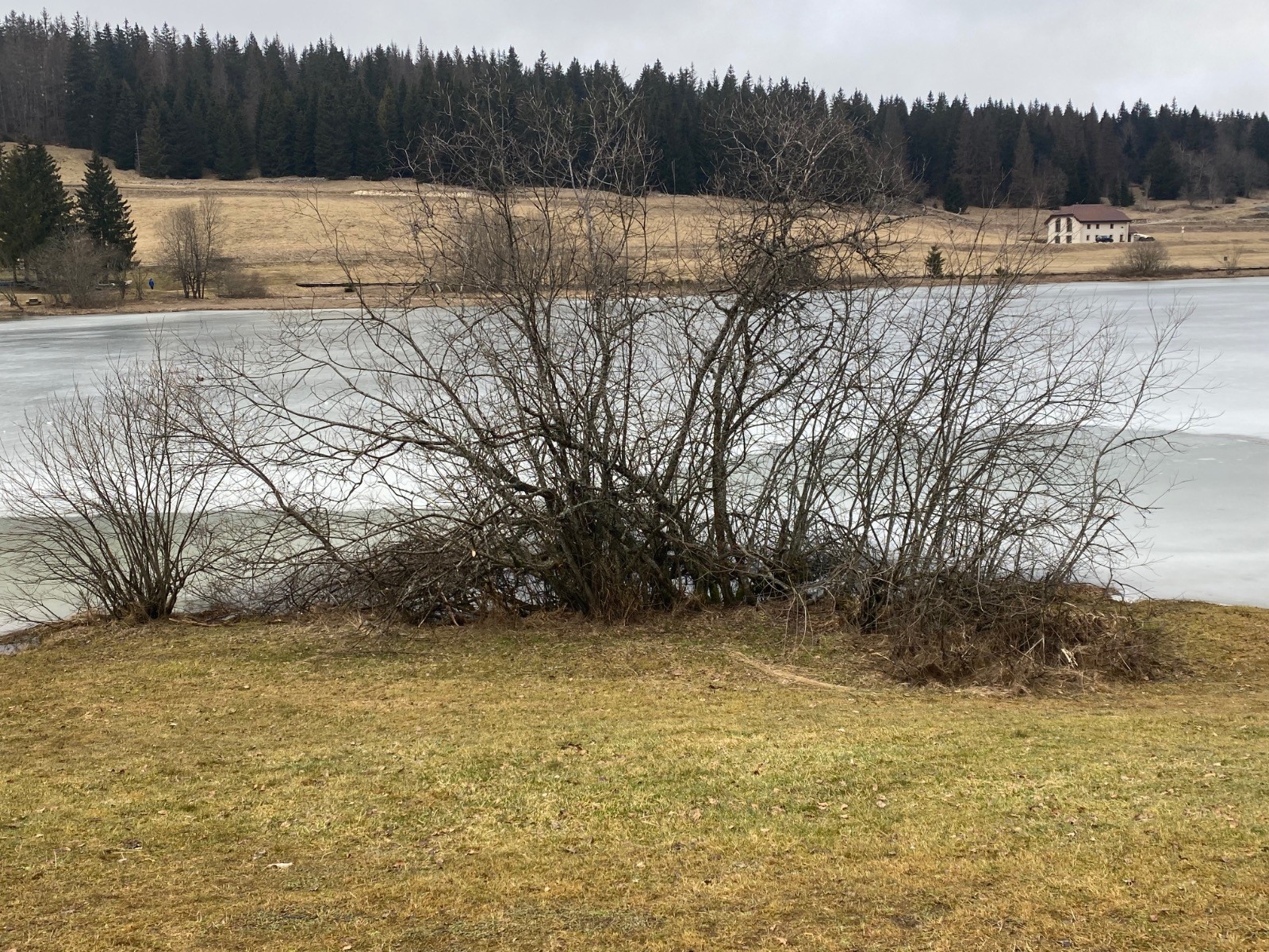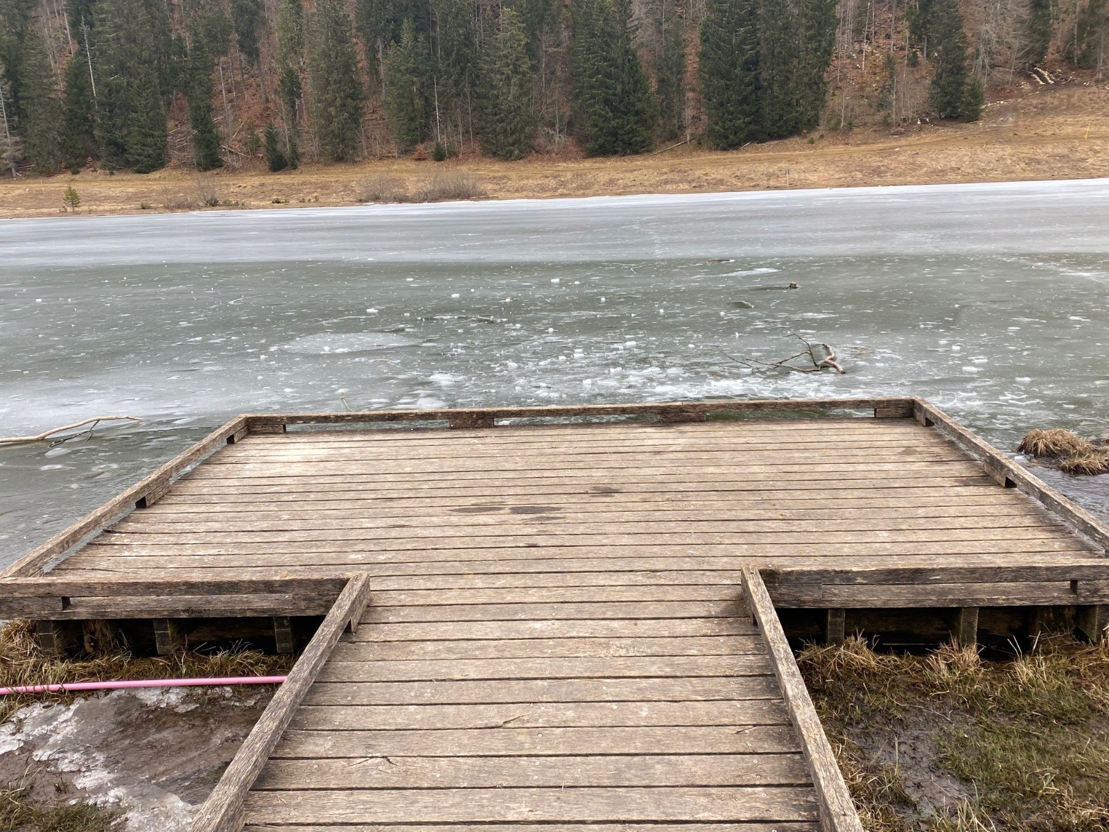 Le décor verdoyant ponctué des rougeurs des tourbières alentour où scintillent les eaux gelées du lac naturel le plus élevé du massif du Jura.