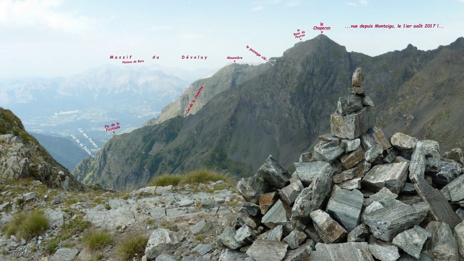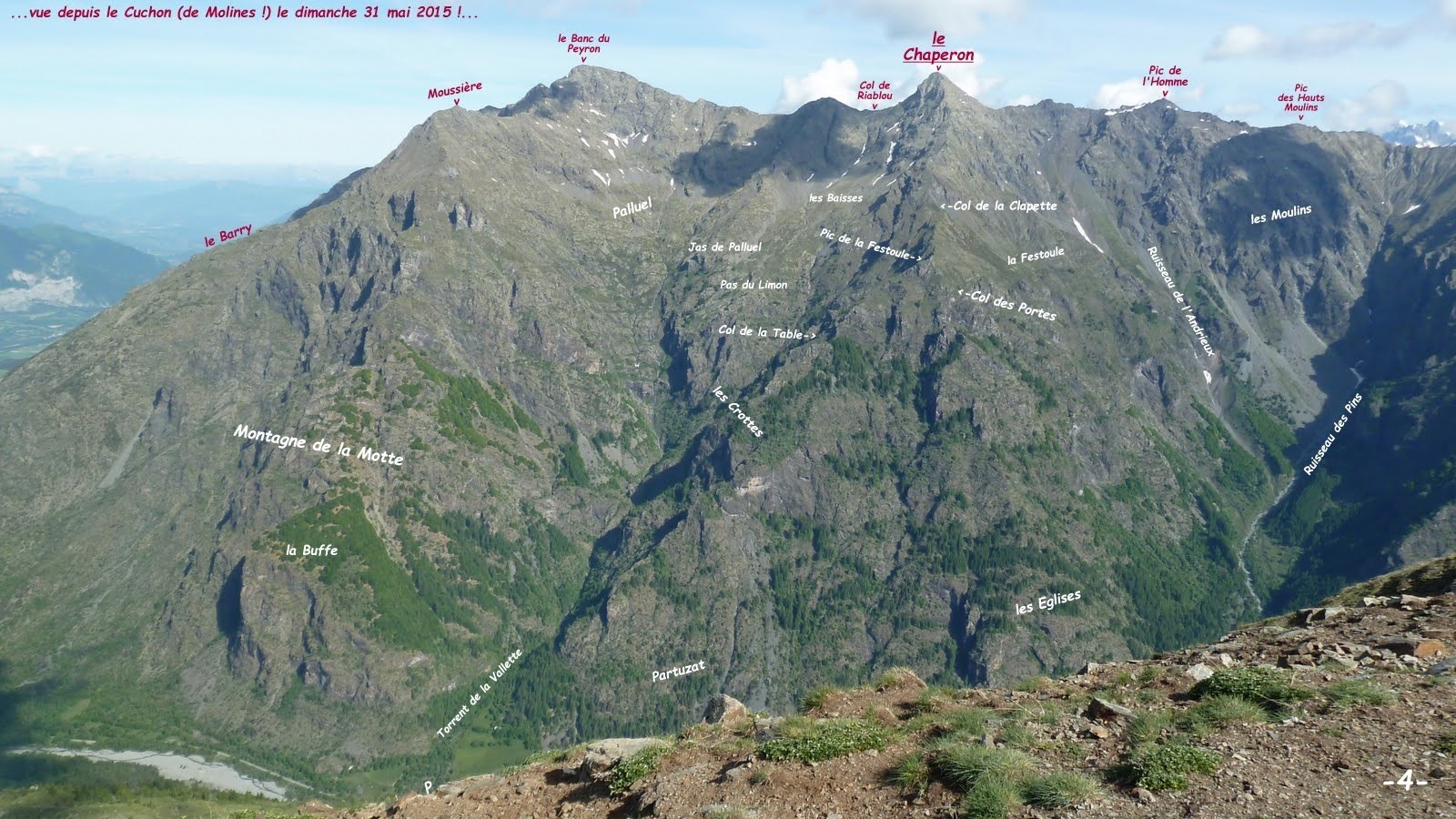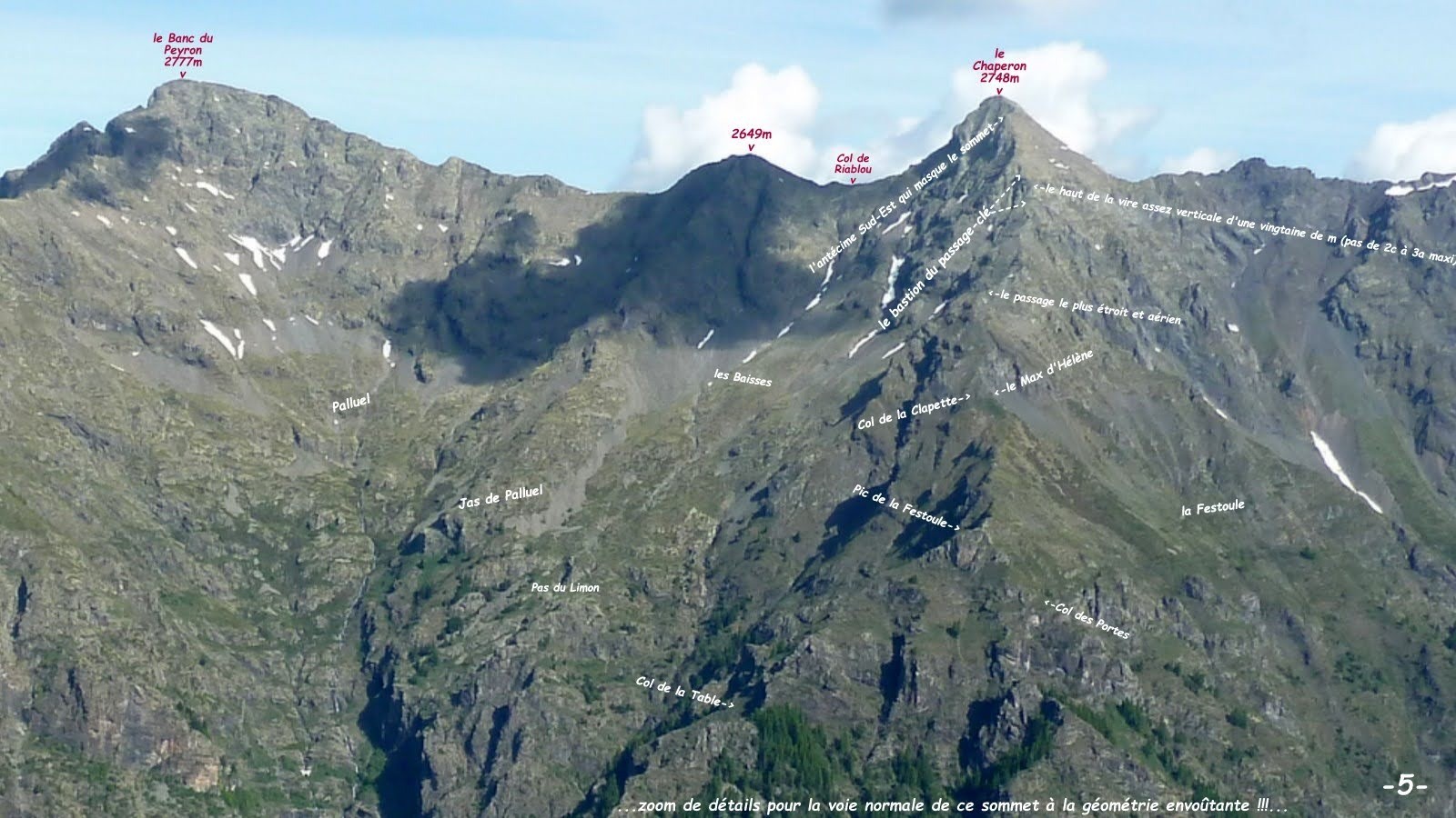 depuis le bout de la petite piste agricole en rive gauche du Torrent de la Vallette (place pour 2 voitures au maximum, penser à laisser le libre accès aux champs avec tracteur et remorque !) > si les prés ne sont pas fauchés, les contourner en restant au plus près du torrent pour rejoindre l'ancien sentier quelque peu en perdition qui se faufile intelligemment entre les petits couloirs et barres rocheuses de Partuzat; dans cet incroyable environnement, il est rejoint par celui qui arrive des Eglises à la cote d'environ 1588m GPS, pour ensuite laisser filer à droite celui du Pas du Limon à la cote d'environ 1771m, pour, via le Col de la Table (sentier qui n'est même plus répertorié sur le Géoportail de l'IGN) rejoindre directement celui tout en balcon du Pas du Limon à Molines par le Col des Portes (2063m GPS) > quelques m avant ce faux col, nous avons emprunté une sente bien marquée qui permet de rejoindre directement le Pic de la Festoule, 2129m, moyennant un pas d'escalade facile mais un peu exposé > suivre l'intégralité de la crête Sud-Est du Chaperon jusqu'au sommet (très facile jusqu'au Col de la Clapette, 2254m, suivi d'un large raidillon assez abrupt où il faut parfois s'aider un peu des mains qui donne accès à une courte arête quasi-horizontale avec un petit passage assez effilé qui requiert quelques précautions, pour ensuite s'élargir à nouveau en se redressant et vient buter sur le bastion rocheux, passage-clé de cette longue ascension qui se franchit directement par une très raide vire à chamois semi-herbeuse en diagonale dans un escalier d'environ 20m de haut, avec quelques petits pas d'escalade (2c,3a maximum peu engagé, mais assez exposé où toute chute serait fatale !), cairn au pied et en haut à l'arrivée sur une petite terrasse herbeuse > la suite est évidente, bien plus facile et très ludique composée de l'antécime Sud-Est, 2688m, qui masque le sommet, le final est un peu plus rocheux mais très facile > sommet, véritable tripode, relativement vaste et confortable duquel il est conseillé, pour le spectacle, de s'avancer un peu vers l'Ouest pour la vue sur l'arête qui le sépare du Banc du Peyron et vers le Nord-Est pour celle qui se poursuit jusqu'aux Pic de l'Homme, Pic des Hauts Moulins et Montaigu (superbe et très vaste panorama à 360° sur tous les Ecrins, les massifs du Dévoluy et du Vercors, vers le Sud jusqu'aux Séolane, Montagne de Lure et le Mont Ventoux !) > retour par le même itinéraire à l'exception de la voie normale du Pic de la Festoule par lequel nous étions obligés de repasser car Hélène y avait abandonné son sac, sinon nous serions redescendus plus tranquillement par la sente qui rejoint directement le sentier en balcon depuis le Col de la Clapette.