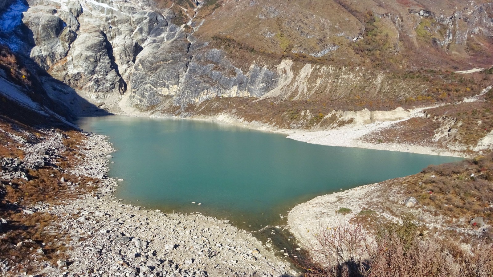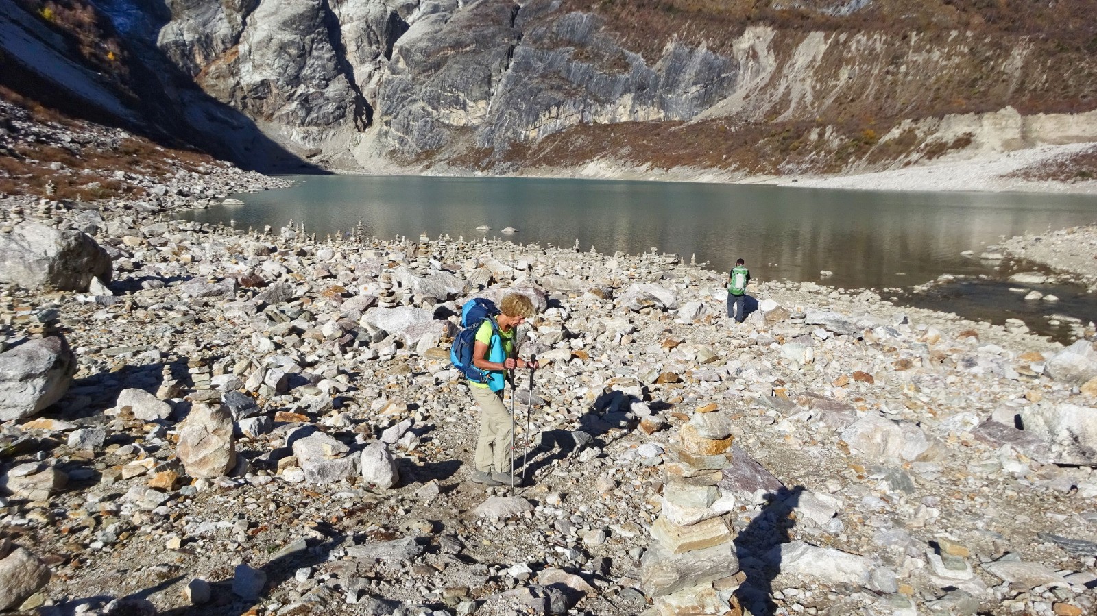 Comme le niveau est bas, on traverse le torrent sur des pierres posés çà et là, un passage délicat pour les petites jambes de Nadine, puis on longe la partie sud du lac.
