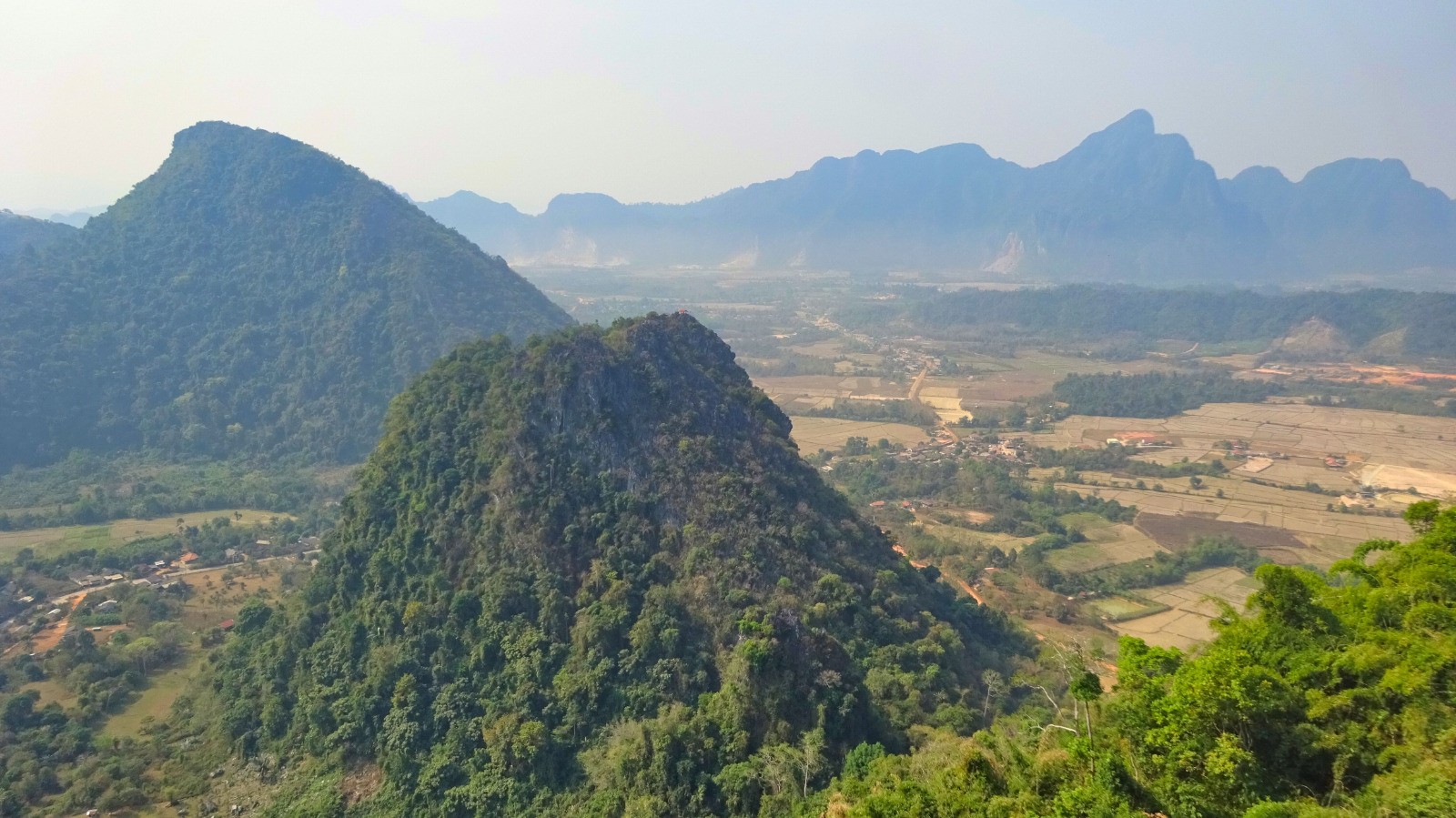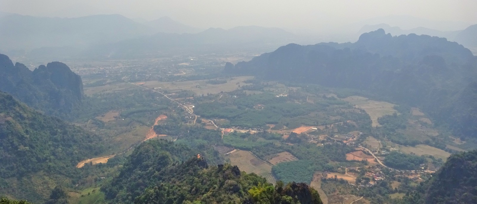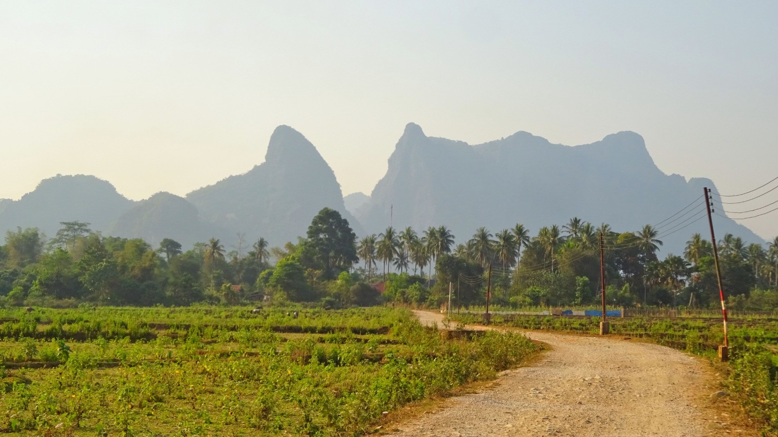 On pose nos sac à dos à Vang Vieng pour 3 jours, après le déplacement depuis Ventiane, on termine la journée à la visite du bourg.