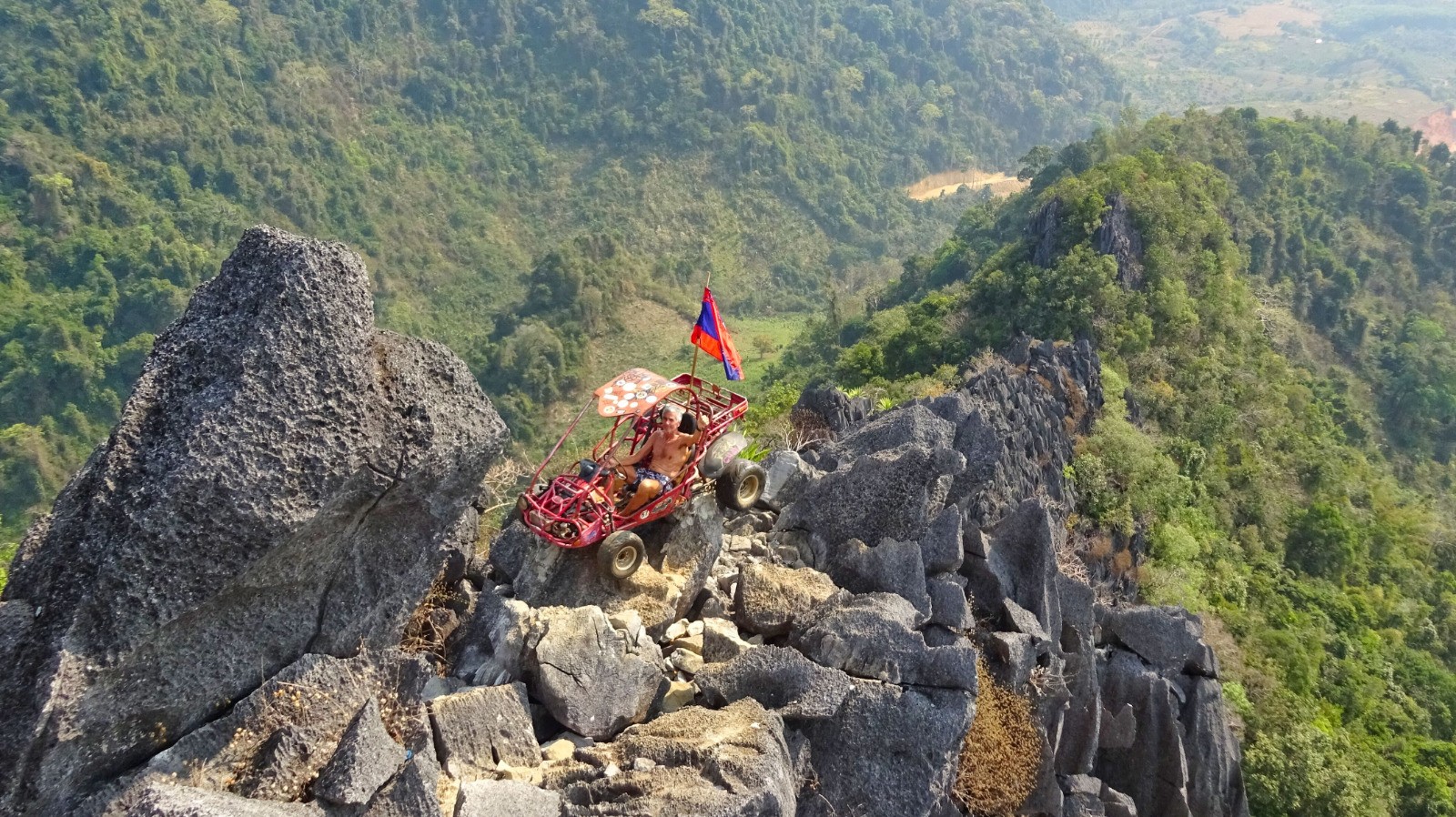 On démarre la journée par Le Piton Pha Ngeun, une grimpette très raide avec des passages délicats, petit arrêt photo sur un karting posé sur une crête, au sommet un remarquable panorama nous attend.