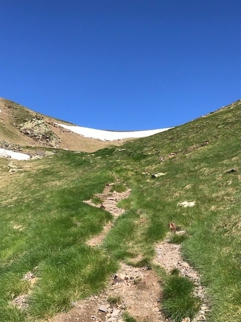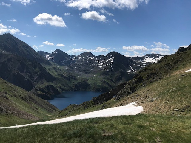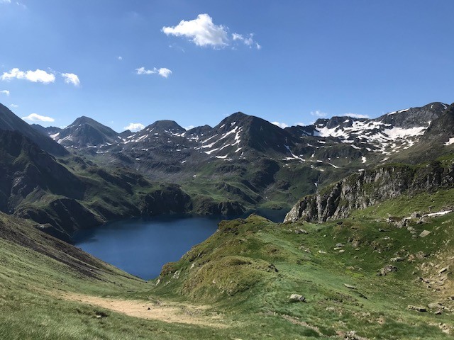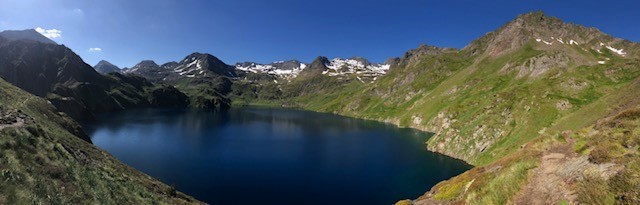 Tous hauts-pyrénéens connaissent et font cette belle boucle qui nous permet de voir ce magnifique lac qu'est le lac bleu.Il est à 1947m, profond de 125m et sa superficie est de 52ha.C'est le lac le plus profond des Pyrénées.Il est classé Natura 2000 et il est dans le parc national.La montée au col de Bareille nous réserve aujourd'hui une surprise avec la présence d'un beau névé. Du col on a la vue sur le Pic du Midi de Bigorre. La descente nous permettra de voir le lac d'Ourec et les pics de Baran et de Mont du secteur de Hautacam.