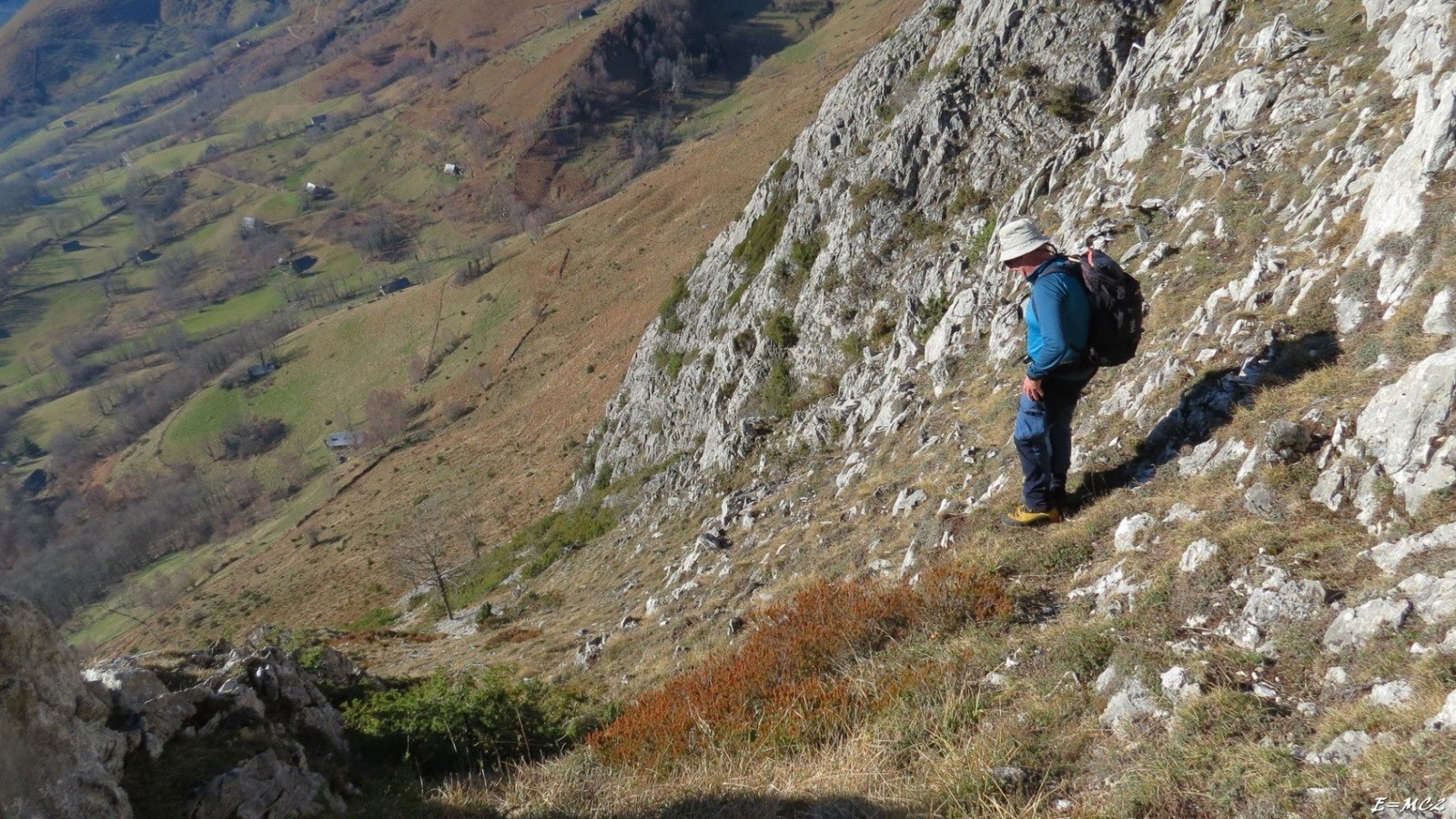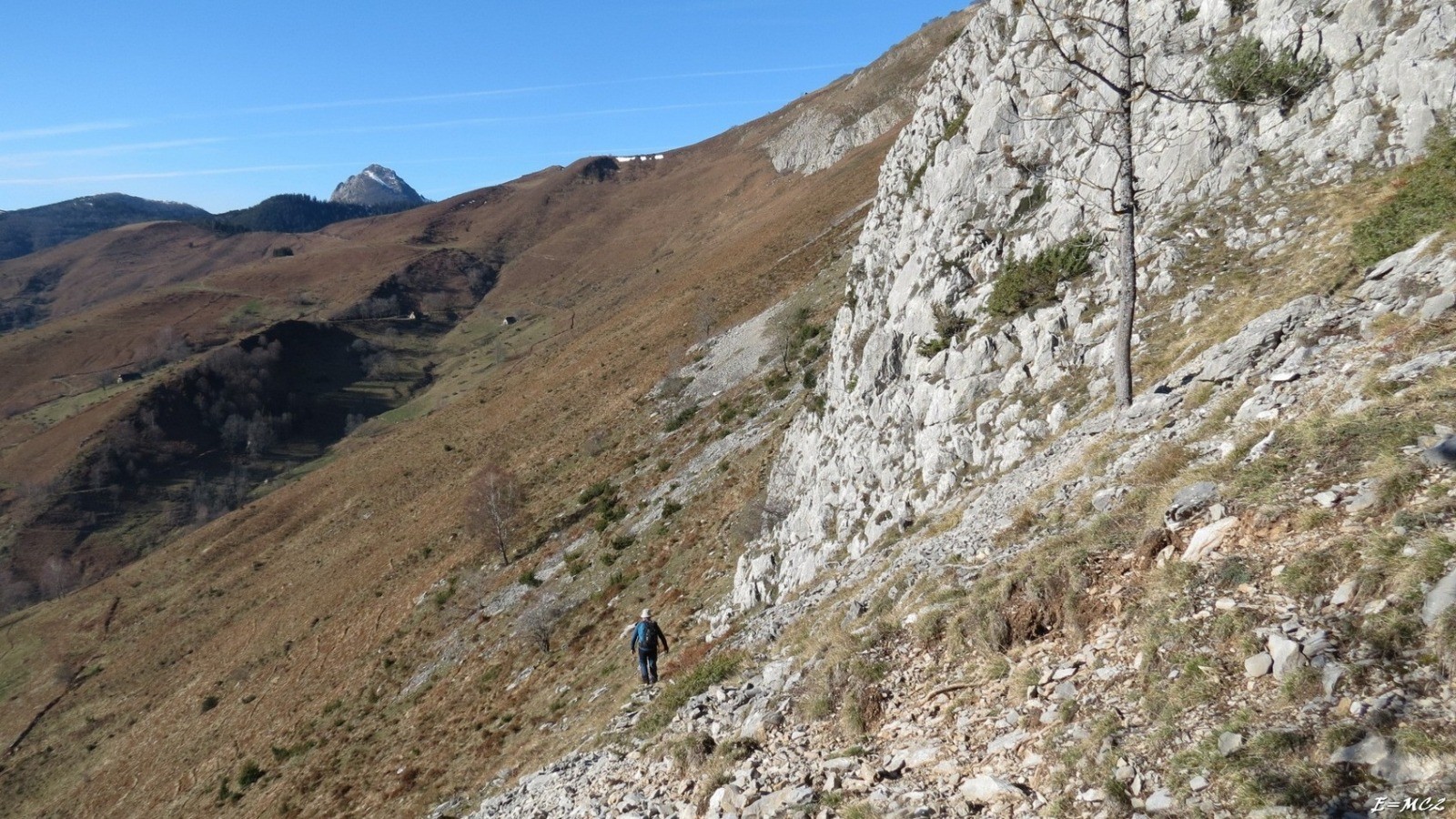 Nous avons opté pour le versant sud. Pour cela, du sommet du Soum de Laya descendre une cinquantaine de mètres comme pour rejoindre le Col de Liar, lorsque le sentier bascule sur la gauche vers le col, continuer à descendre vers le sud puis vers le sud-ouest en suivant une combe se finissant par des couloirs assez raides mais peu difficiles. Ce cheminement permet de contourner la barre rocheuse nommée « La Pène » sur la carte IGN. Afin de ne pas perdre trop d'altitude prendre le sentier qui longe la base de la barre rocheuse. Continuer par une succession de sentiers en faisant une longue traversée légèrement ascendante, parallèle à la crête parcourue de façon à passer 80 mètres environ au-dessus de deux granges. Continuer sans perdre d'altitude pour rejoindre la piste, la prendre vers la droite jusqu'au Col de Couret puis jusqu'au Col de Couraduque.