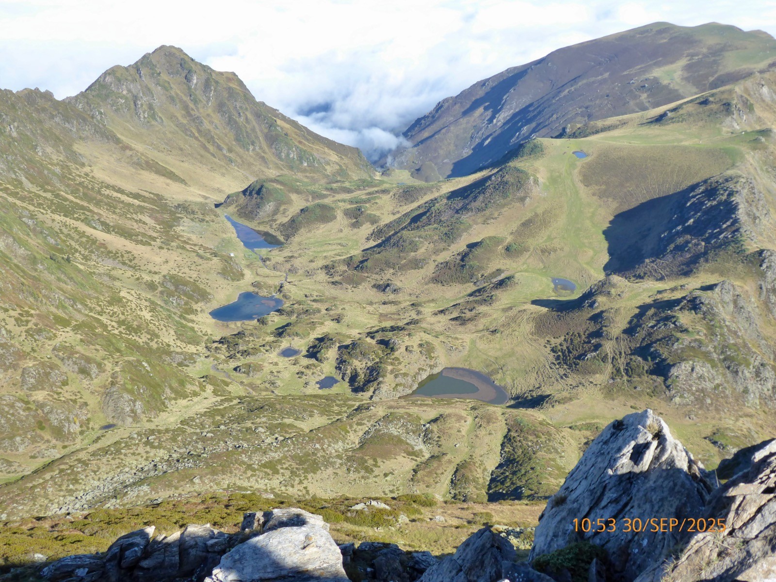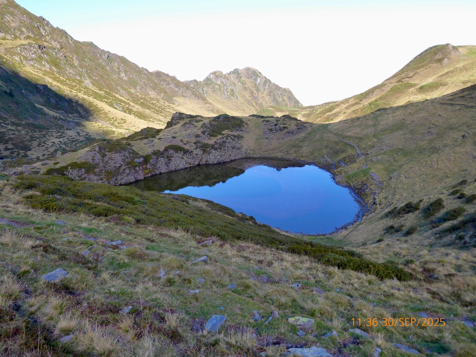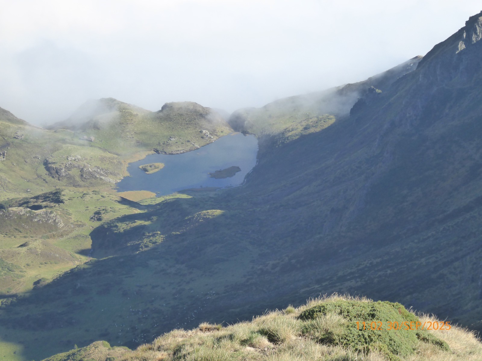 Voilà une boucle originale . Depuis le col de la Courade nous prendrons un sentier qui monte S/O et qui nous fait surplomber le vallon de Binaros. Ce sentier est très peu fréquenté et il ne s'améliore qu'à L'Artigole. Beaucoup de dévers... Il nous fait passer près des lacs de Binaros inférieur et supérieur qui sont en comblement et où est présente la cyano-bactérie. Nous passons près du lac de l'Oeuf où les rubaniers sont rois.La montée au col d'Arize est courte mais soutenue, la crête qui mène à la Montagnette, elle est aisée. Tout ceci sous le maître des lieux; le Pic du Midi de Bigorre. Nous aurons la chance de voir un grand cerf avec une biche, mais pendant toute la montée dans le vallon de Binaros nous avons profité du brame de ces animaux !! La descente vers le lac d'Aygue Rouye est prononcée mais sans danger aucun et le sentier est bien marqué. Ce Lac d'Aygue Rouye a une superficie de 1ha , il est à 1595m et sa profondeur est de 2m.En occitan, Aygue Rouye signifie l'eau rouge. Il fait partie d'une zone naturelle protégée, classée ZNIEFF (Zone Naturelle d'Intérêt Ecologique, Faunistique et Floristique. Toute la journée s'est déroulée sous un beau soleil et la brume est montée alors que nous rentrions. Une jolie course agréable.