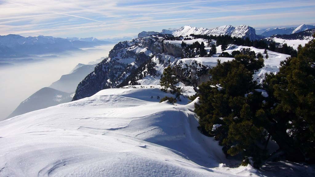 Description : Randonnées en raquettes. Au départ de la Plagne, la raide montée soutenue au Col de l'Alpette conduit au cœur d'un paysage exceptionnel de vallons et de falaises au pied du Mont Granier. La crête des Rochers de Belles Ombres propose une traversée au fil de ses creux et de ses bosses entre Grésivaudan et Hauts de Chartreuse. L'enneigement rend certainement moins pénible une ascension à travers les lapiaz tourmentés du versant Ouest, mais le bon itinéraire n'est pas facile à trouver parmi le dédale du chaos d’un lapiaz forestier géant. Le labyrinthe vaincu, après le sommet, la douce crête offrira un paysage magnifique tout au long de son parcours. Descendu au Col de Belles Ombres, un retour facile et original ramène vers l'Alpette.