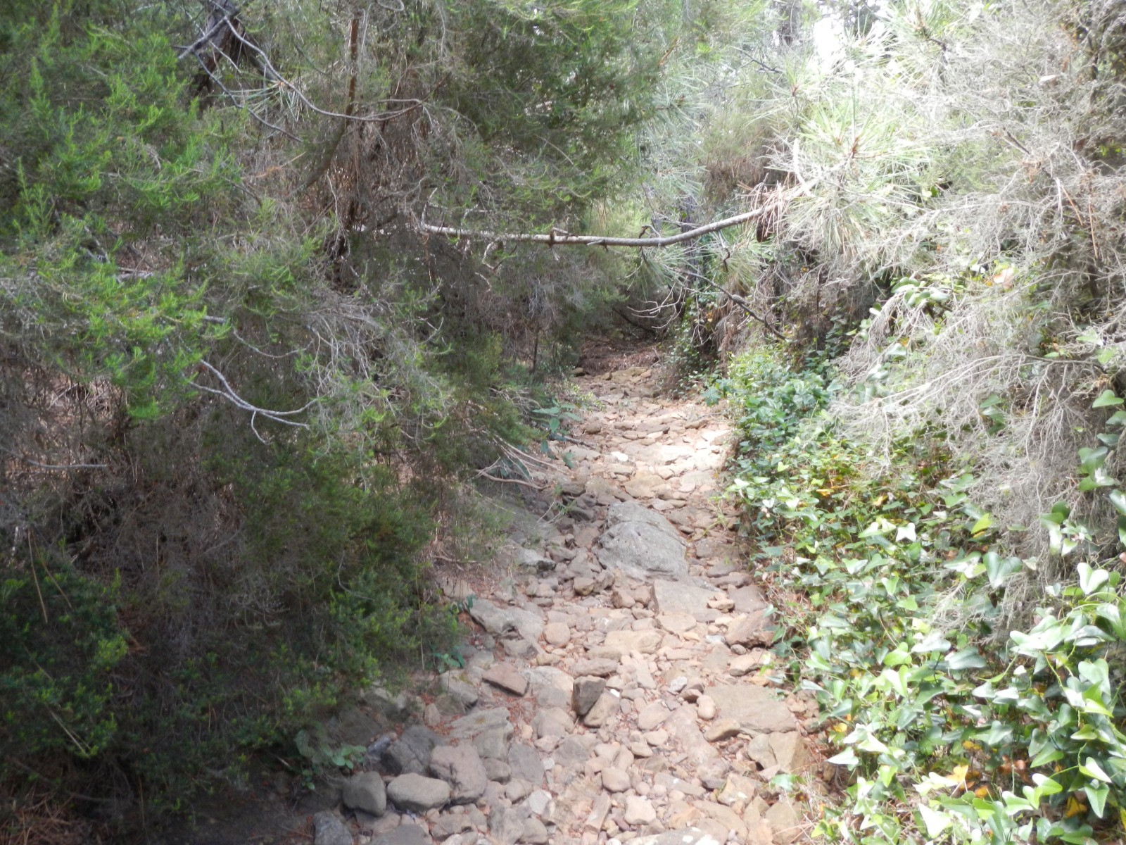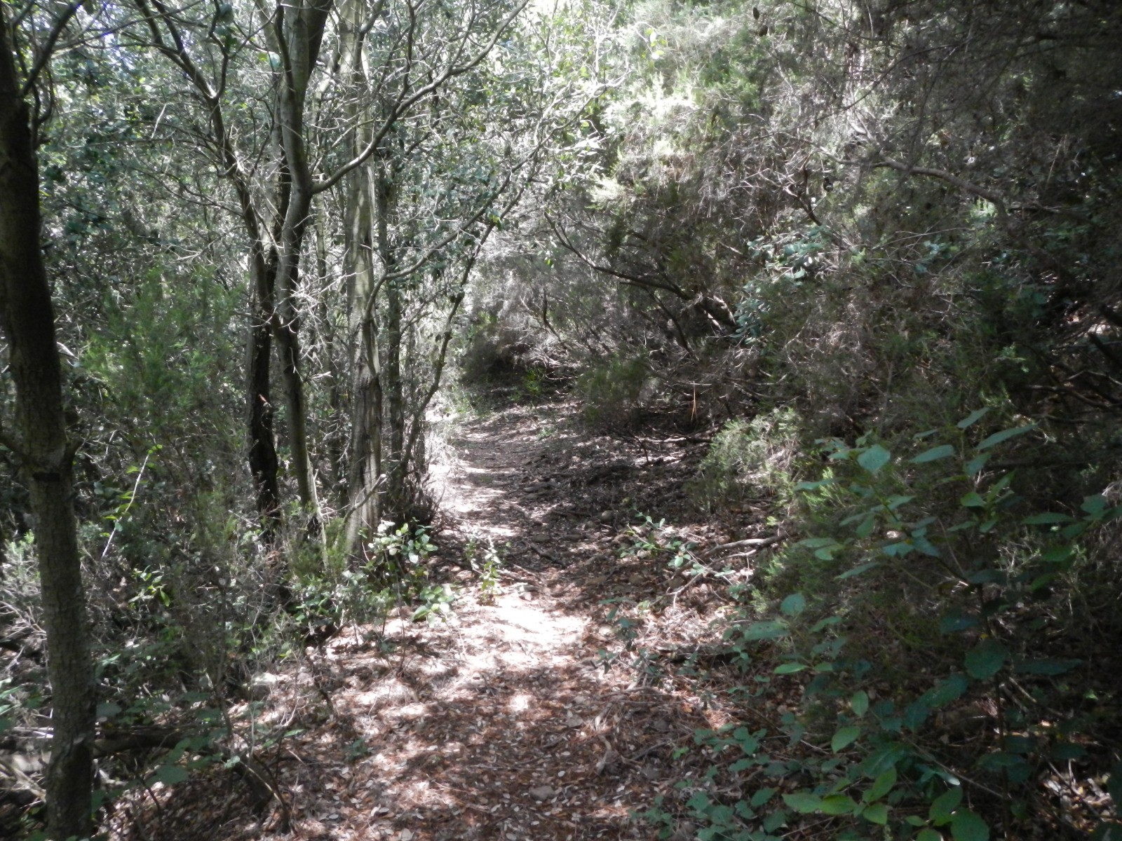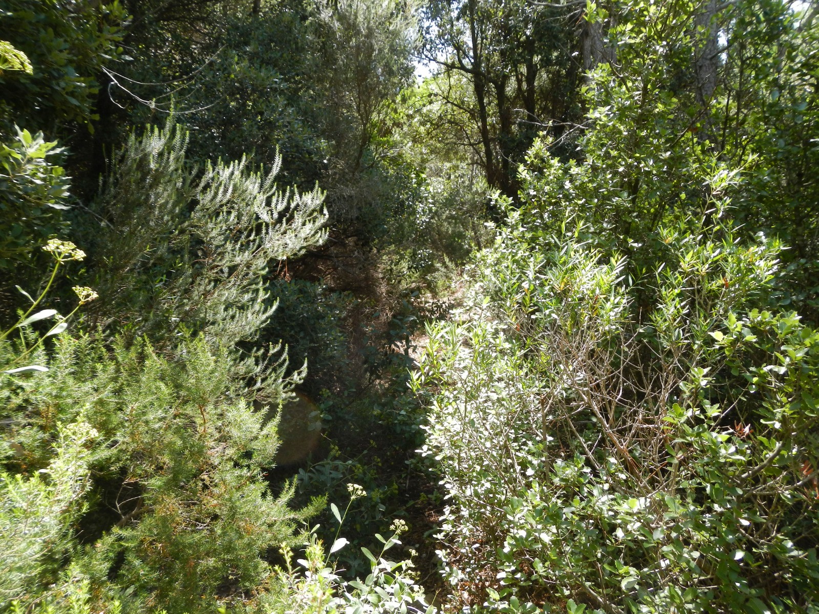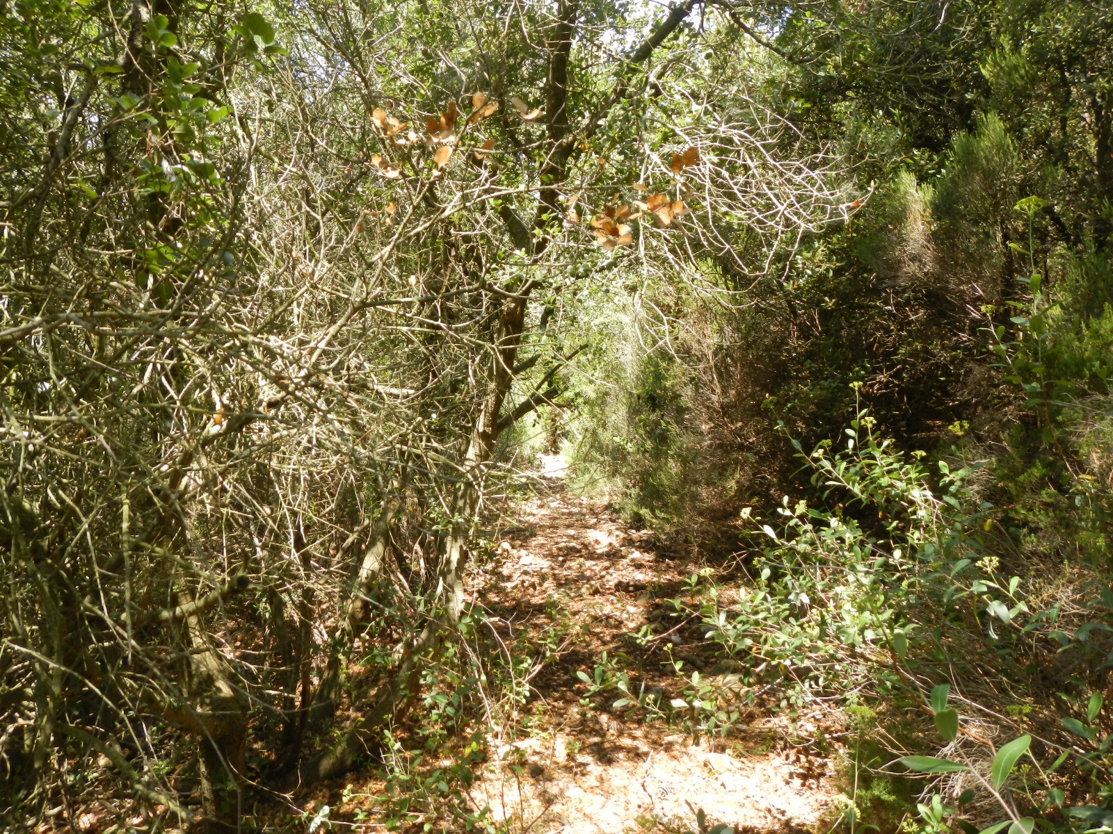 Le sentier au point AF4 est difficile à trouver sans GPS et le tronçon AF4-AF5, quoique bien tracé est envahi de végétation heureusement sans épines...! Il est ensuite très ombragé jusqu'à l'abbaye. Il faudra éviter de l'emprunter si l'orage menace car le sentier est dans le talweg qui risque de se transformer en torrent en cas de fortes averses.