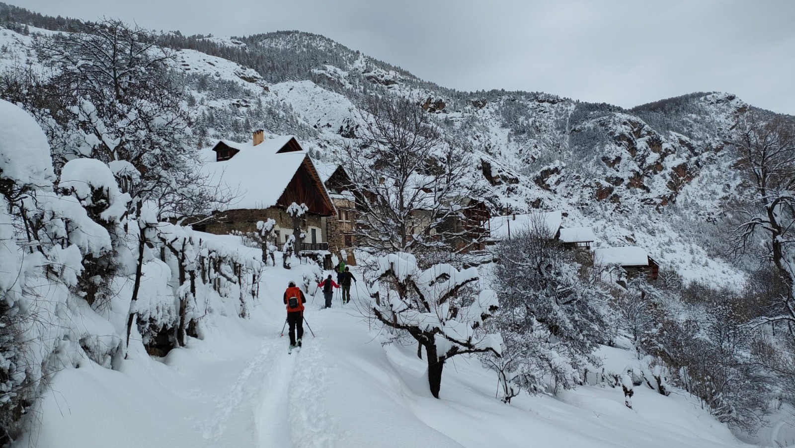 Il neige ! Beaucoup ! On se contente d'un petit aller-retour au-dessus de Freissinières. Départ et retour skis aux pieds.