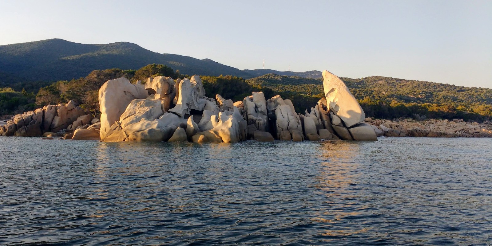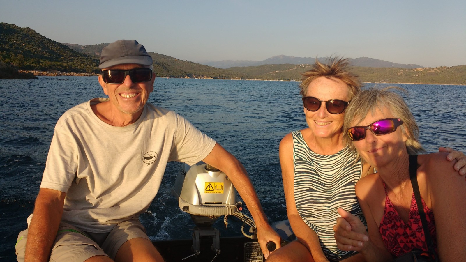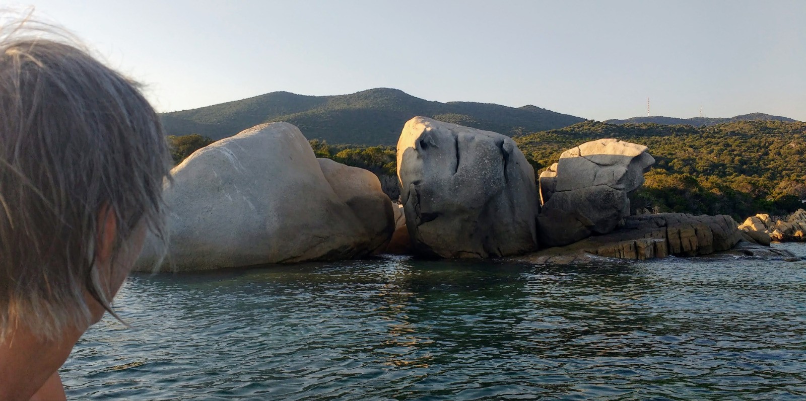 Goûter; pêches et cookies, nous sommes seuls face à cette plage et de très beaux rochers tout ronds. Les autres bateaux sont tout au fond de la baie. Petite ballade en annexe au soleil presque couchant, pour admirer ces rochers de plus prés. Omelette pmdt et dodo.