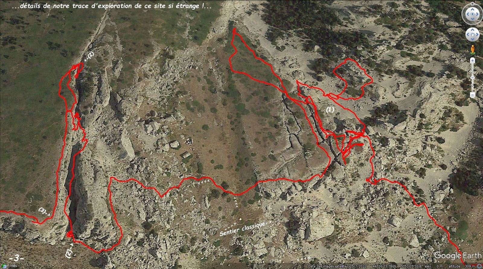 vue et poursuivre en restant le plus à flanc pour éviter le plus possible de nous embourber jusqu'aux oreilles dans le quasi marécage des 2 rives du Torrent de Maraize où, ce jour-là, les bottes auraient été mieux adaptées que nos chaussures de randonnée. C'est dire combien nous avons apprécié de nous élever rapidement une fois le GR 94 rejoint, abandonné plus haut au profit du sentier balisé précédemment évoqué. Il trace une ligne directe ascendante sur la croupe Sud-Ouest du Bois des Fauvies, ses créateurs n'ayant pas la moindre notion d'un agréable sentier en lacets ! sans s'en plaindre, puisque nous étions pressés d'arriver au bas du premier site à explorer, cette fois-ci l'Ours souhaitant visiter le chaos rocheux en aval du pseudo-plateau étrangement faillé qui fait penser aux crevasses d'un glacier avant sa chute de séracs. Sur le flanc Sud, on trouve un chaos de gros blocs enchevêtrés qu'il suffit de franchir pour rejoindre la croupe Est d'où ils sont plus épars au milieu d'un vaste pierrier haché menu où leur émergence ne peut être que le résultat d'une érosion, facilitant grandement notre progression dans la combe Nord-Est en amont de la Grande Sapie. Nous n'avons évidemment pas pris le temps d'en effectuer une visite complète après notre exploration de 2 premières failles parmi les plus hautes car l'Ours, n'étant pas certain de notre capacité à grimper jusqu'au plateau supérieur, souhaitait que nous conservions une marge de sécurité suffisante si nous devions revenir sur nos pas ! même si, vue de plus bas, il a repéré au milieu de la falaise une faille plus ouverte et moins profonde, certes assez raide mais nous permettant de surmonter relativement facilement la difficulté sans avoir à poursuivre jusqu'à la dernière plus large et plus cool en longeant le pied de la grande barre Nord qu'il avait repéré sur la vue satellite sans être pour autant certain de sa viabilité; ce dont, une fois le plateau rejoint, nous avons bien pris soin de nous assurer en longeant le bord de la falaise jusqu'à sa verticale après avoir parcouru et observé ce que nous pensons être les failles les plus significatives de tout ce secteur.