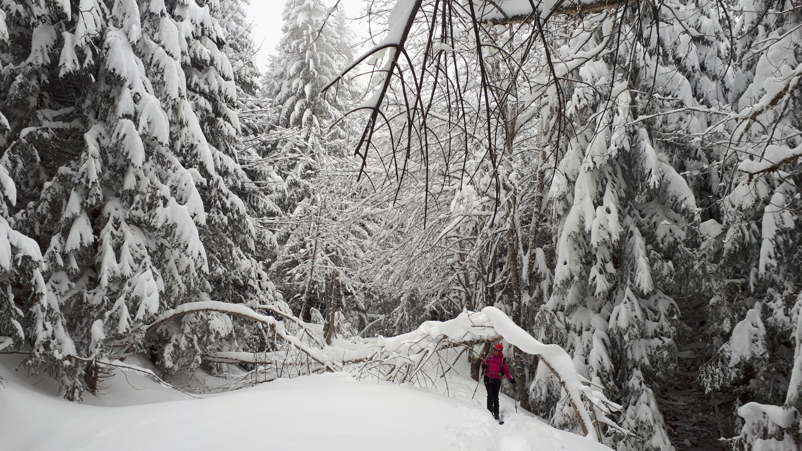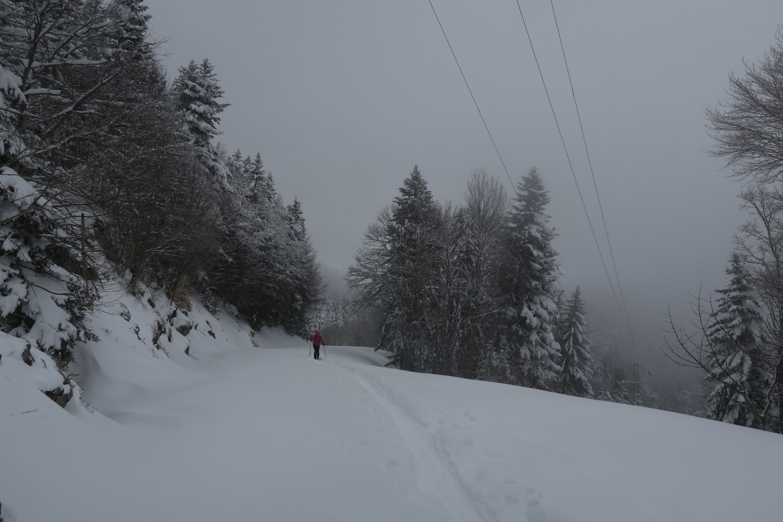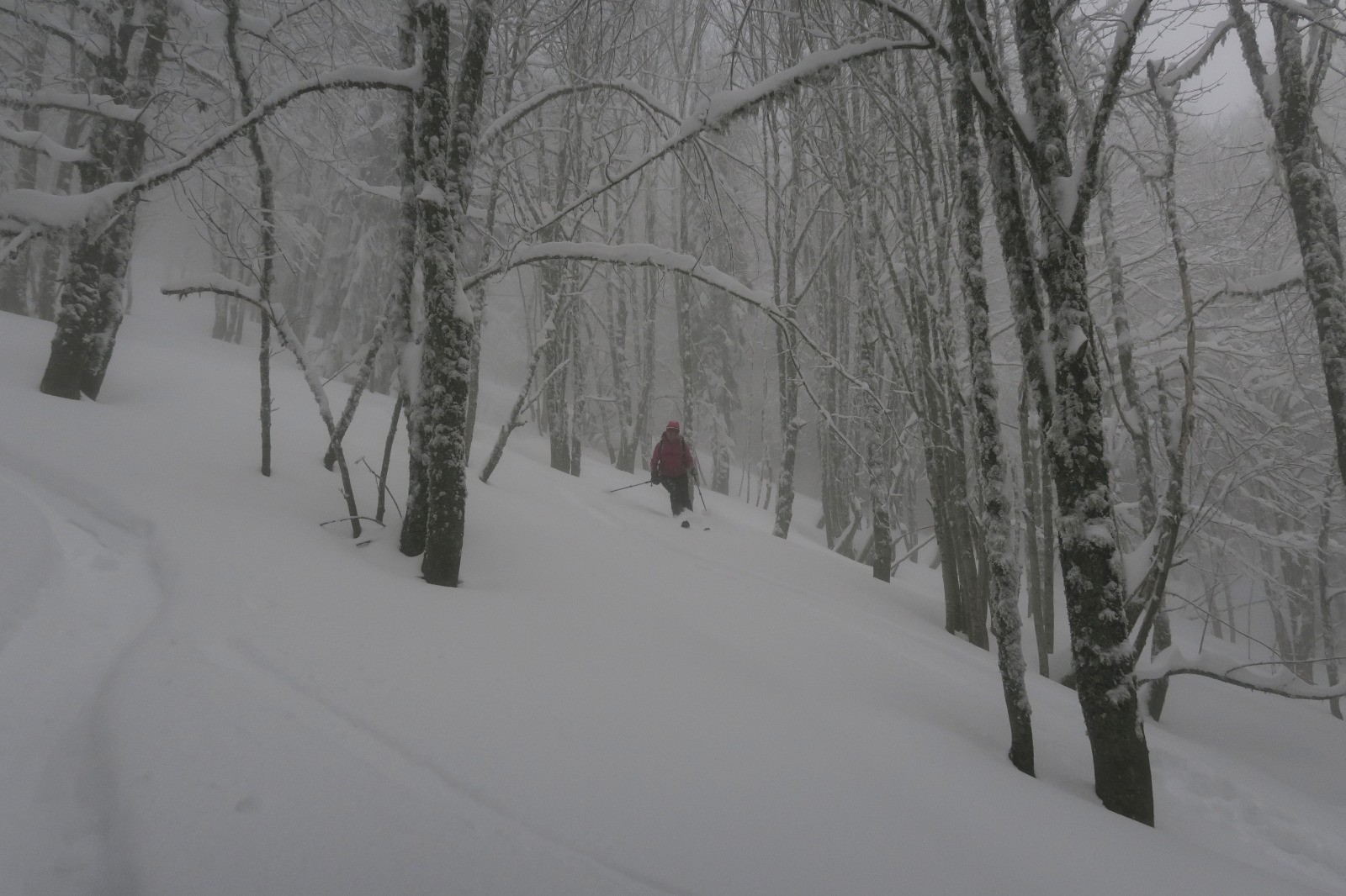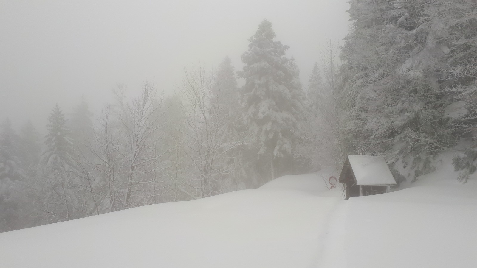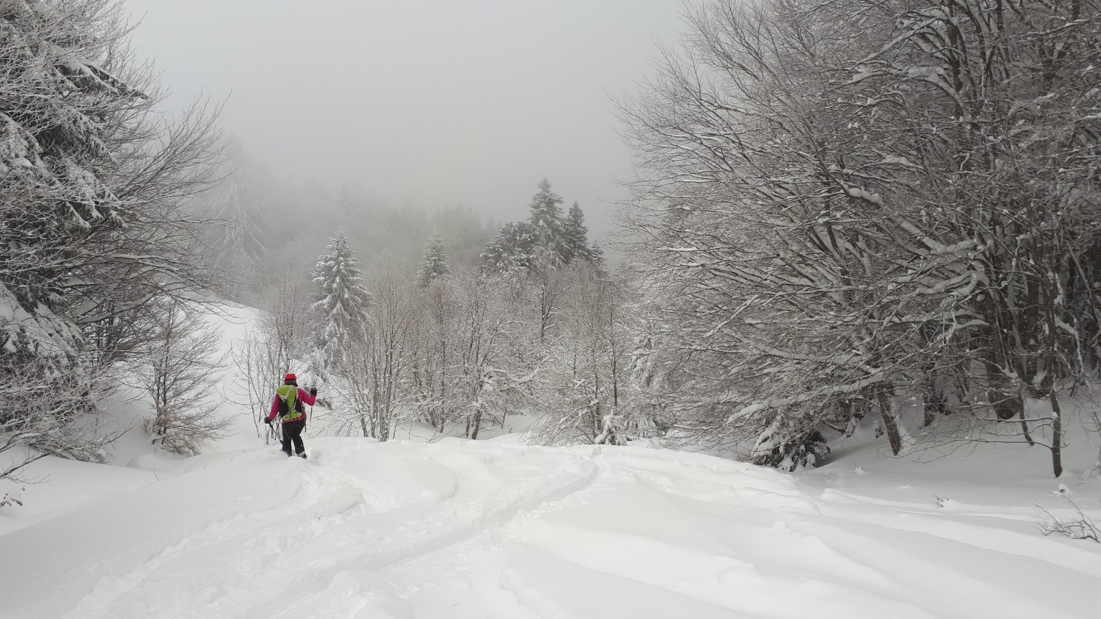 Une forme de limace, la grippe, la grosse fatigue Podobied, le froid, l'onglet... bref des cannes de plomd sur le traçage du Bec nous sommes les premiers, dans des grosses accus d'une peuf froide et légère malgré tout. Bref après une première branche, dans le brouillard, les mains décongelées, au débotté, un Charvet, bien bon juste tracé la veille, mai s partiellement recouvete la nuit; deux gars devant nous.