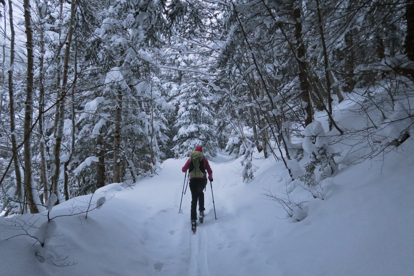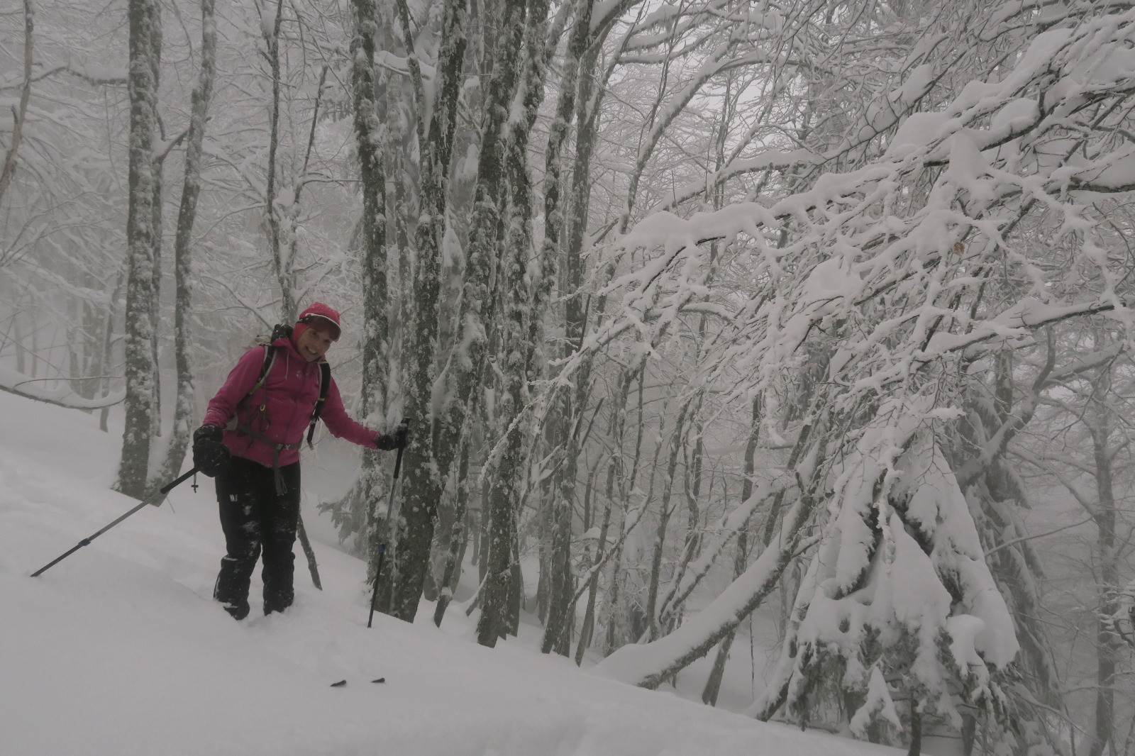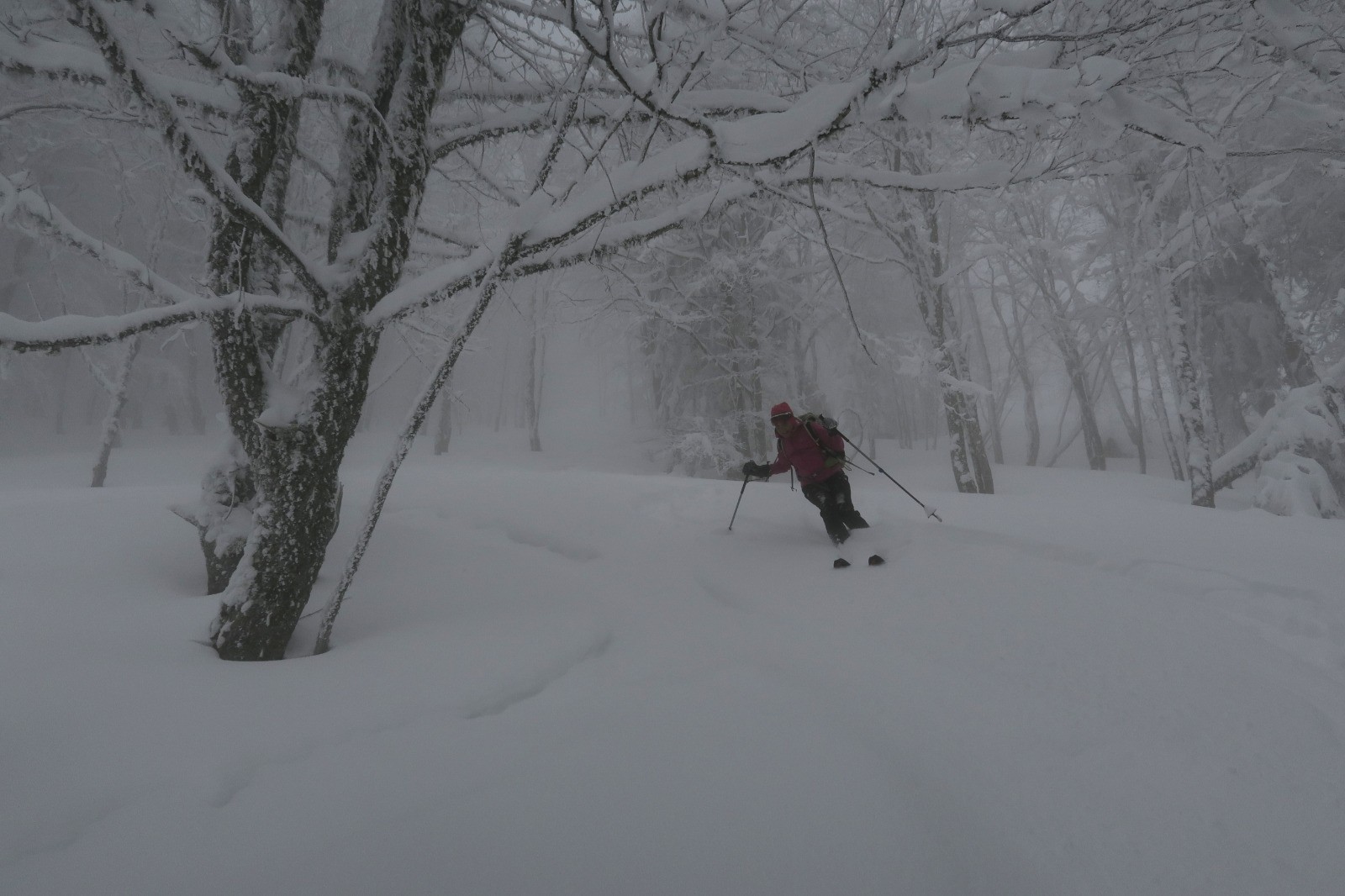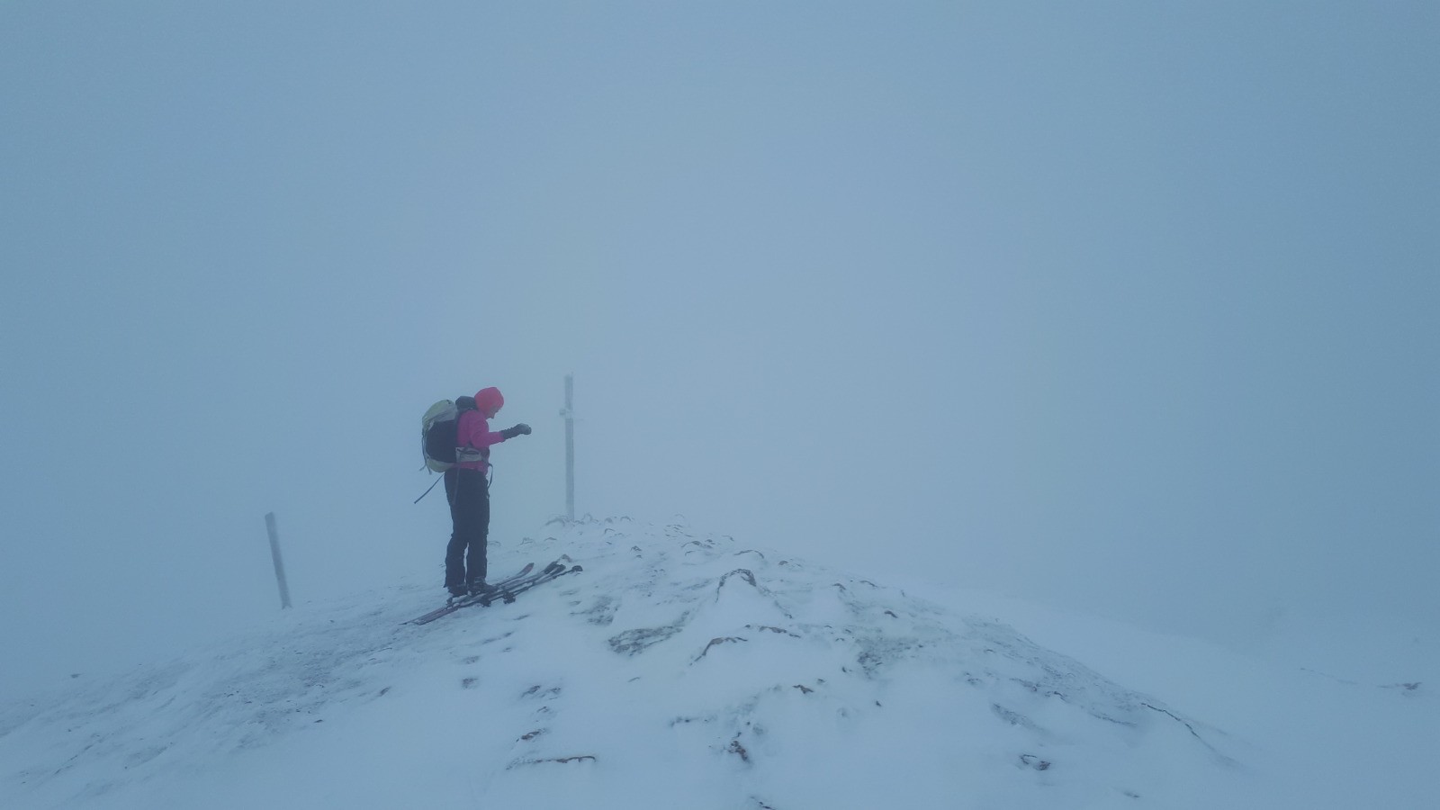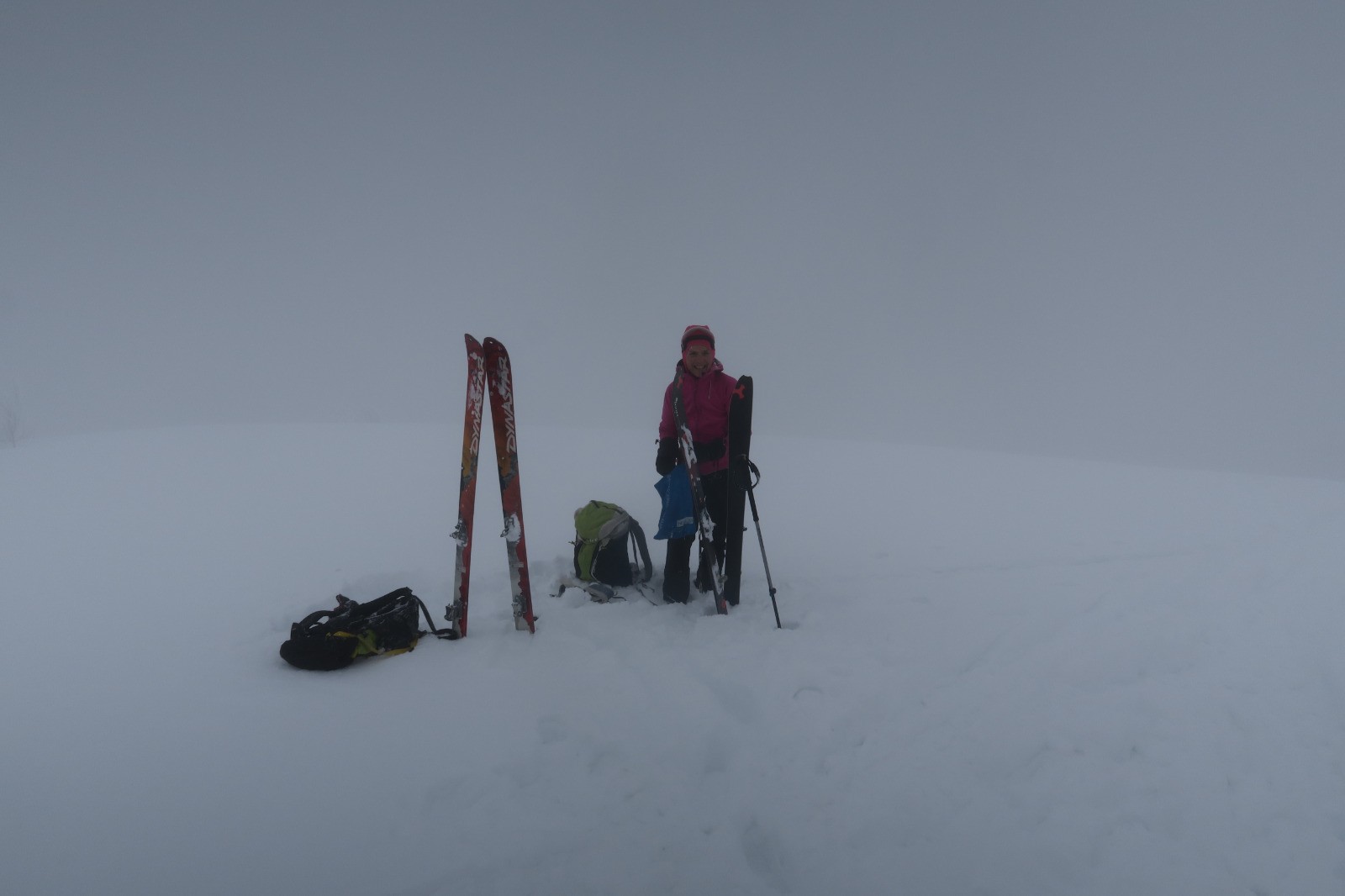 Une forme de limace, la grippe, la grosse fatigue Podobied, le froid, l'onglet... bref des cannes de plomd sur le traçage du Bec nous sommes les premiers, dans des grosses accus d'une peuf froide et légère malgré tout. Bref après une première branche, dans le brouillard, les mains décongelées, au débotté, un Charvet, bien bon juste tracé la veille, mai s partiellement recouvete la nuit; deux gars devant nous.