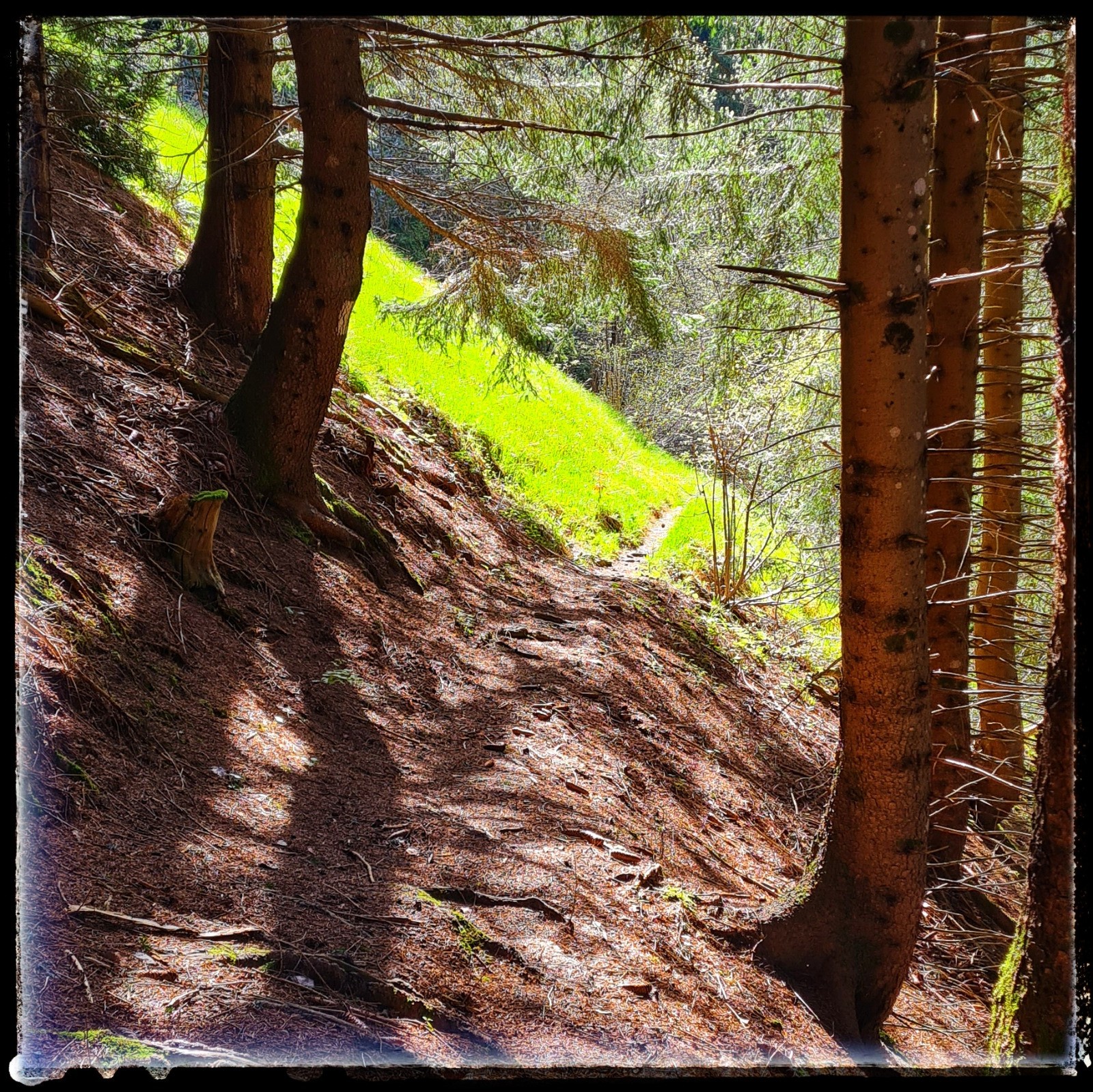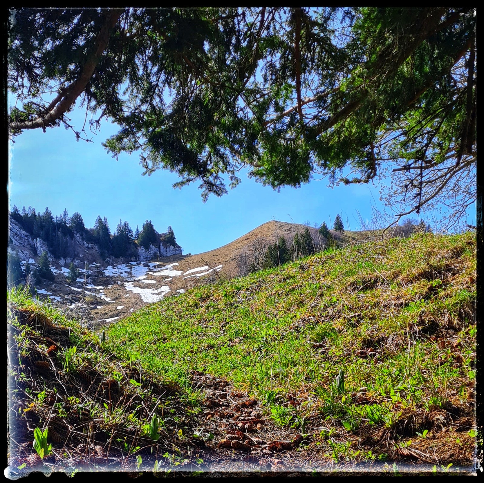 Le début de la montée est tranquille, dans le village, le long de la rivière, puis je débouche à la sortie du bois, sur un grand prés de fauche, dans le village de Doucy Dessous. Longer la route, et au Magnoux, obliquer à gauche sur une petite route qui monte raide en direction EST. Ça commence raide, et ça fini très raide. J'ai pris le sentier de droite, vraisemblablement celui de gauche aurait été légèrement plus cool. Ca redeviens moins raide à l'arrivée dans une sapinière. Durant la montée, je sens de l'air froid me dégouliner dessus depuis le sommet ... le catabatique ? J'espère que cela ne va pas durer... La balade est superbe, quelques passages raides et escarpés, rien d'engagé. Après la cascade, je débouche sur les prairies à Chamois, sous la dent de Pleuven. J'oblique à gauche, et je rejoins la croupe.