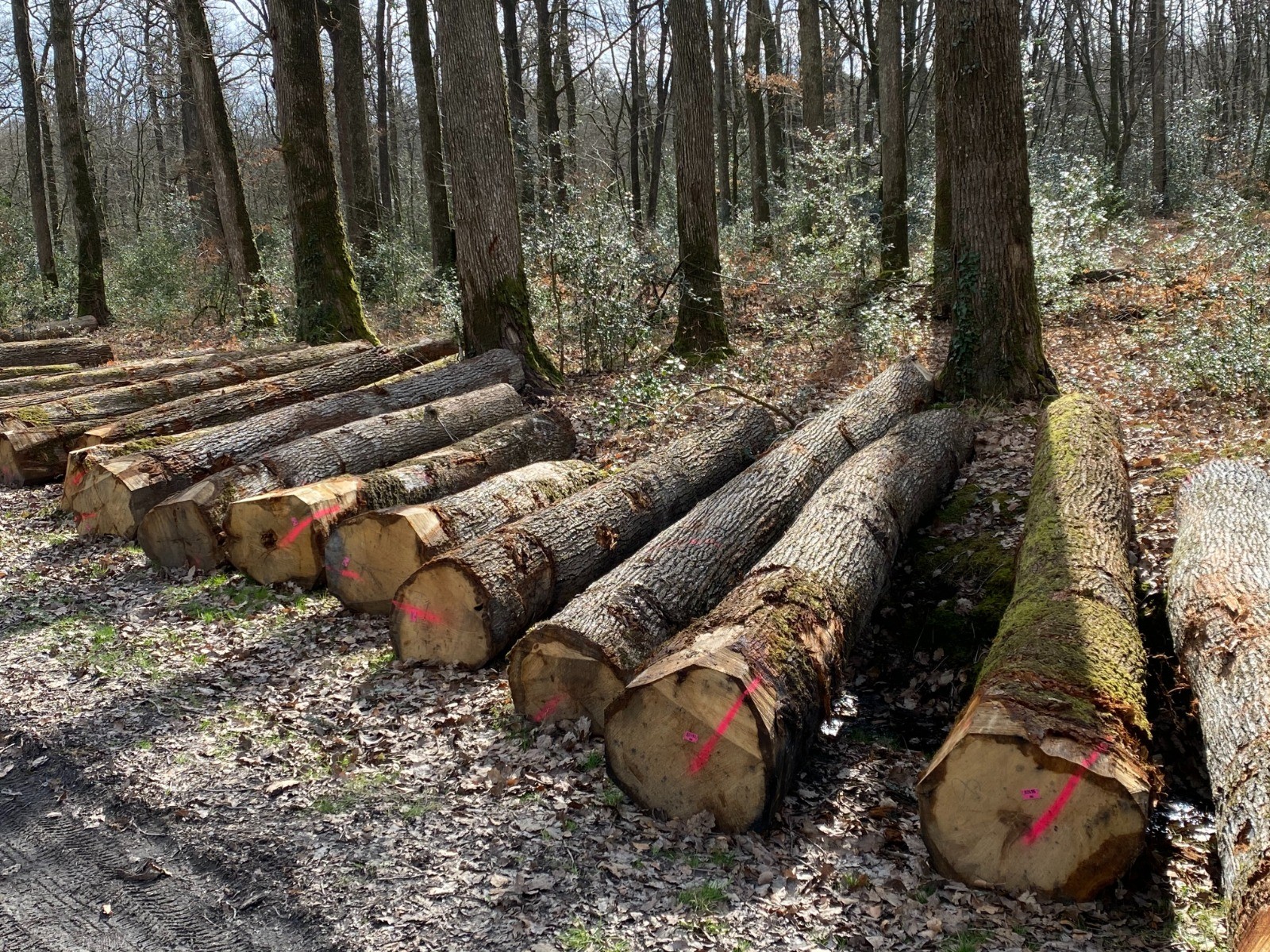 De nombreux troncs ont été sagement numérotés, rangés et sèchent avant d'être utilisés pour la charpente, la menuiserie, mais aussi la fabrication de tonneaux et la construction de bateaux.