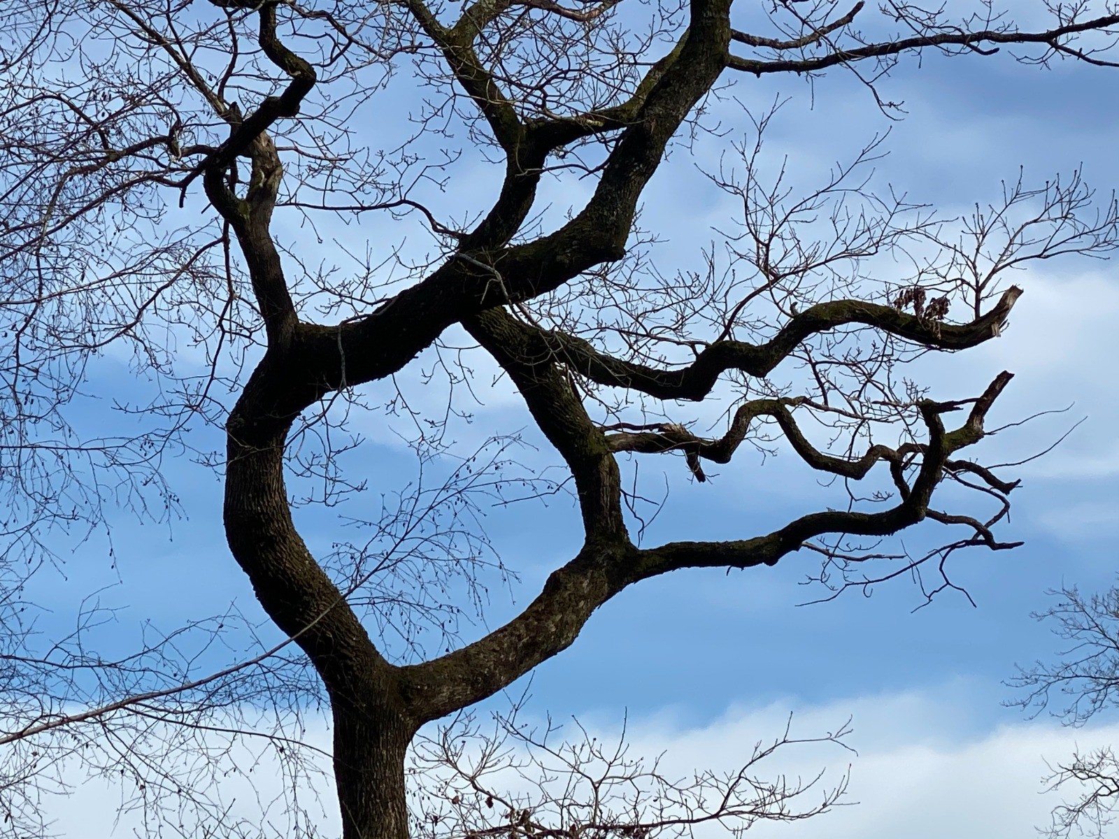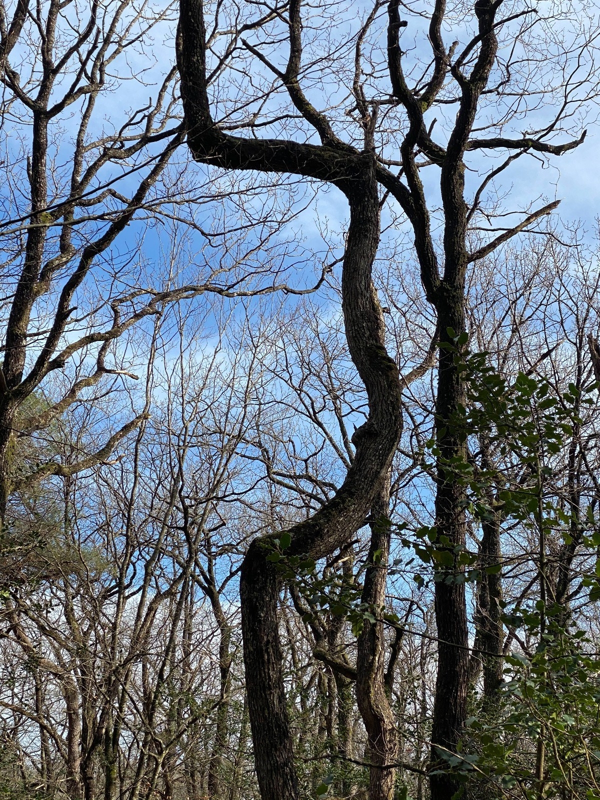 "En fait, souvent c'est lié à des accidents pendant la croissance du jeune arbre : il pousse par le bourgeon terminal au sommet de la tige ; si jamais ce bourgeon est détruit (cassé, gelé, brouté...), l'arbre réagit en activant des bourgeons en dessous mais placés sur les côtés ce qui donne ces « coudes » parfois à angle droit ; si çà recommence plus loin, rebelote ; souvent ca se passe sur des terrains difficiles (sol rocheux) qui complique la croissance ; ca peut être aussi des bactéries qui déforment la pousse terminale ; il y a aussi l'influence des autres arbres autour (dont certains ont entre temps disparu) qui frottent dessus ou interceptent la lumière si bien que la pousse se déforme pour accéder à la lumière"