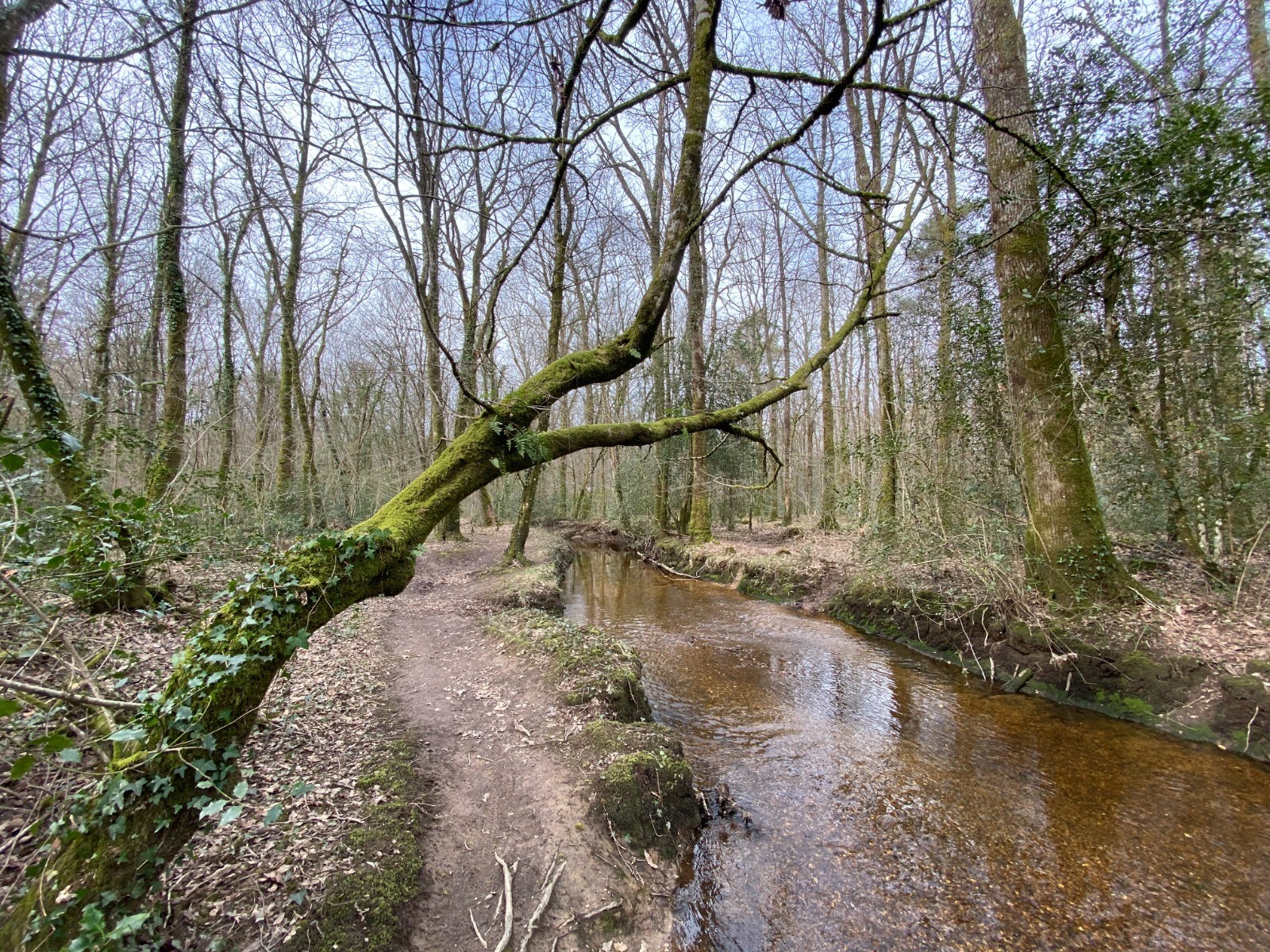 Ce ruisseau a ses berges jonchées d'arbres gigantesques déracinés.