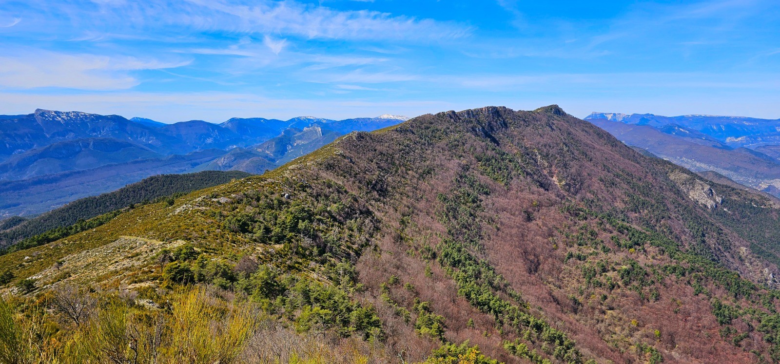 Phase en A/R pour rejoindre le col de Rigaudon à partir duquel on pourrait être tenté de suivre plein ouest la longue crête menant à la 2nde cime de Gourdan (1508 m) distante seulement de 2,82 km pour d+ 118 m mais j'y ai renoncé en l'absence de tout chemin praticable et des difficultés rencontrées pour se frayer un passage au milieu d'arbustes touffus et envahissants.