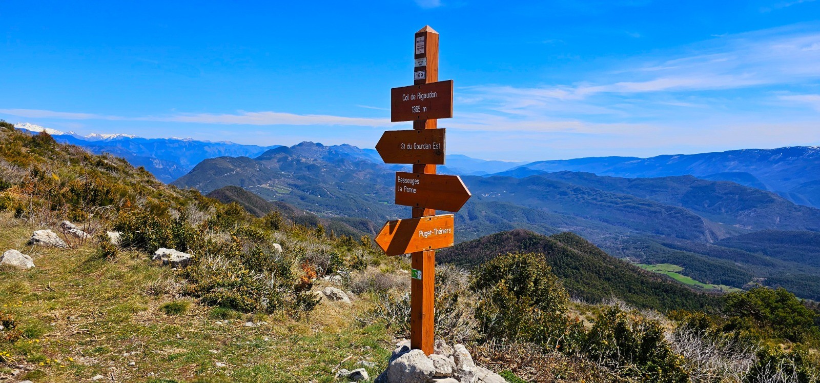 Cette partie retour est en descente constante par l'adret de la montagne de Gourdan jusqu'au col de Besseuges où l'on délaisse le GR 510 pour emprunter un PR bien signalisé par marquage jaune jusqu'à Puget-Théniers. Cheminement par pinèdes en coupant les lacets de la D 2211A desservant cette agglomération.