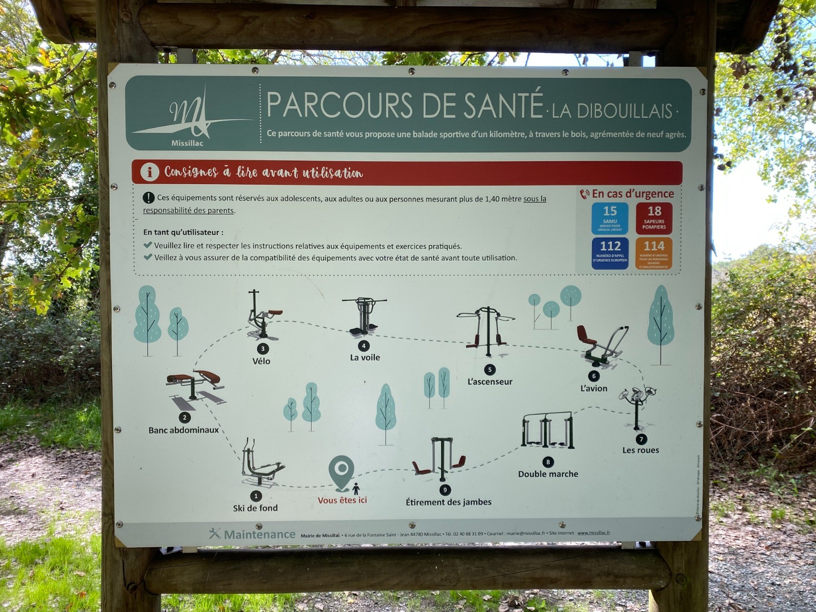 Un parcours de santé "La Dibouillais" vous propose une balade sportive ( photos no 5 à 10 ) et animée d'un kilomètre, à travers le bois, et agrémentée du passage de neuf agrès.
