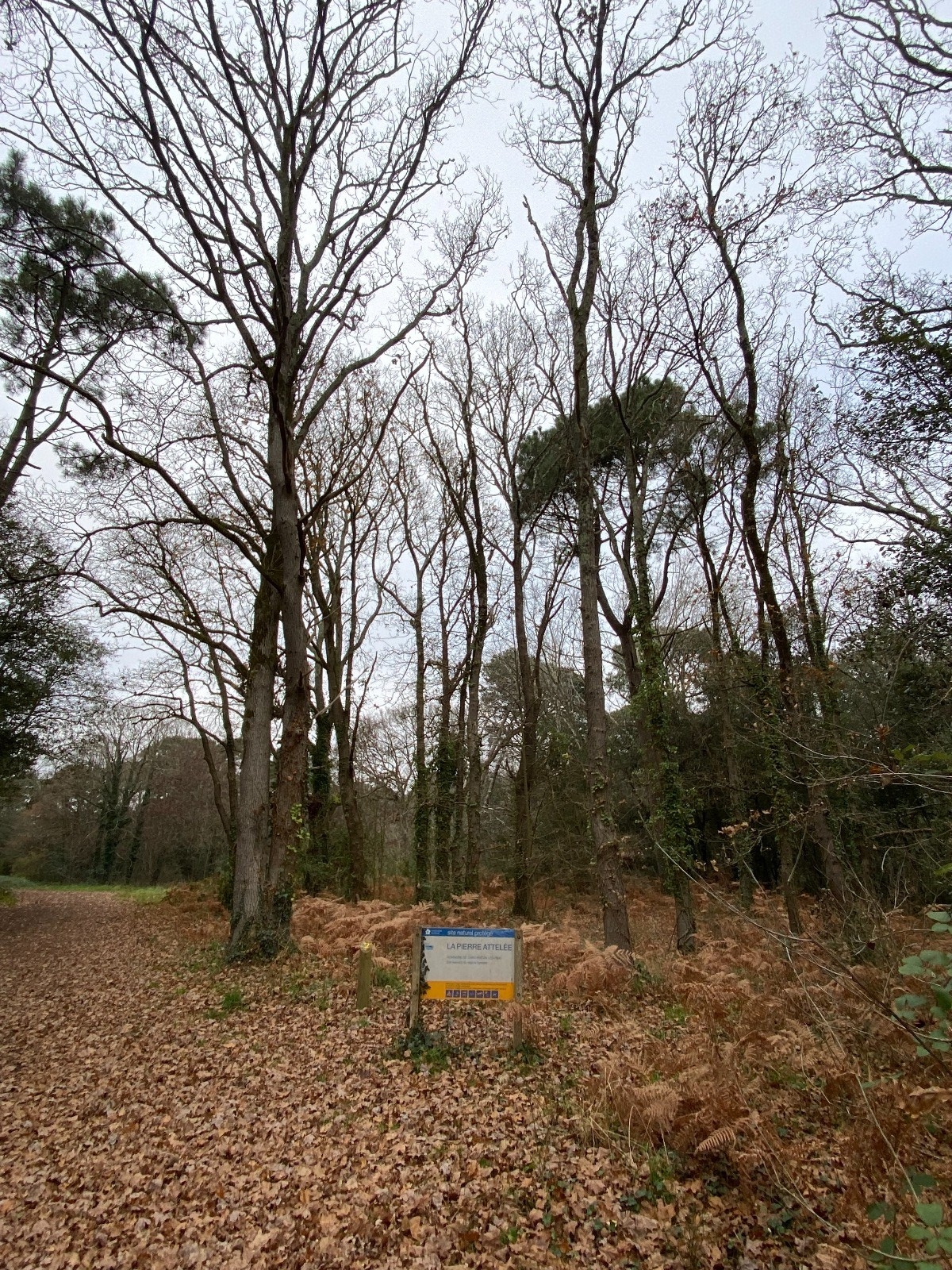 Après avoir traversé la route bleue, nous nous dirigeons vers la forêt de la Pierre Attelée où se trouve le menhir du même nom.