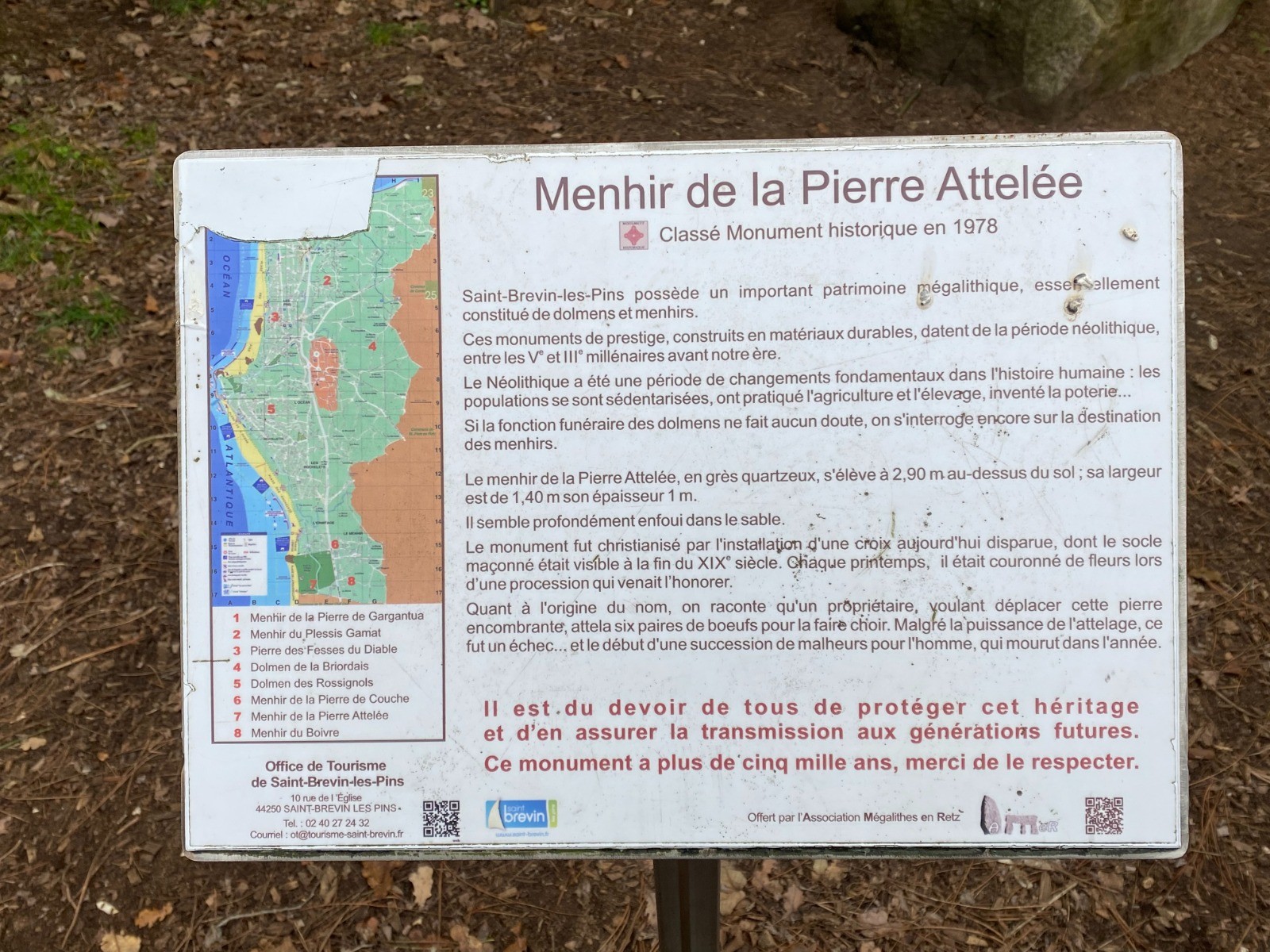"Le menhir de la Pierre Attelée tire son nom du fait qu'un propriétaire, voulant déplacer cette pierre encombrante, attela six paires de boeufs pour la faire choir.