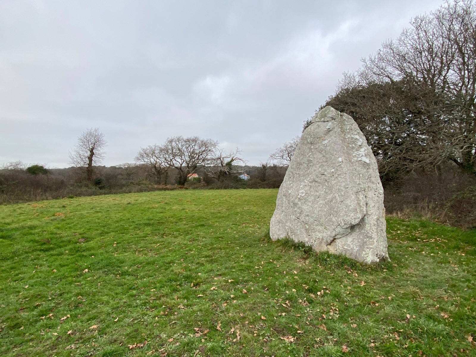 C'est un mégalithe massif entouré d'arbres et de fougères.